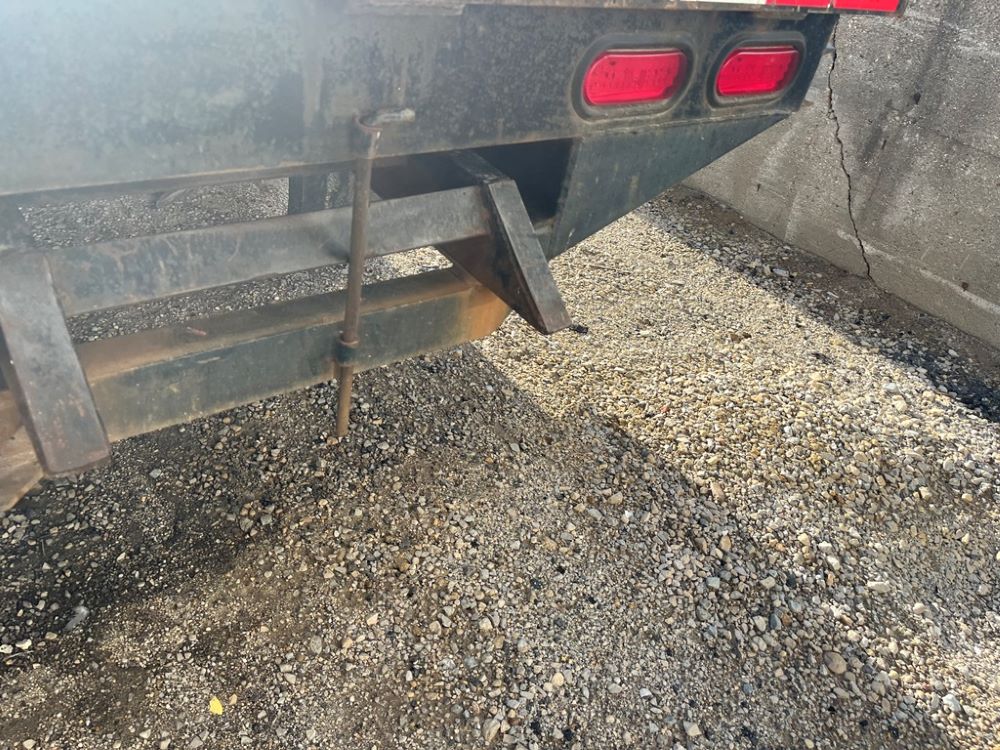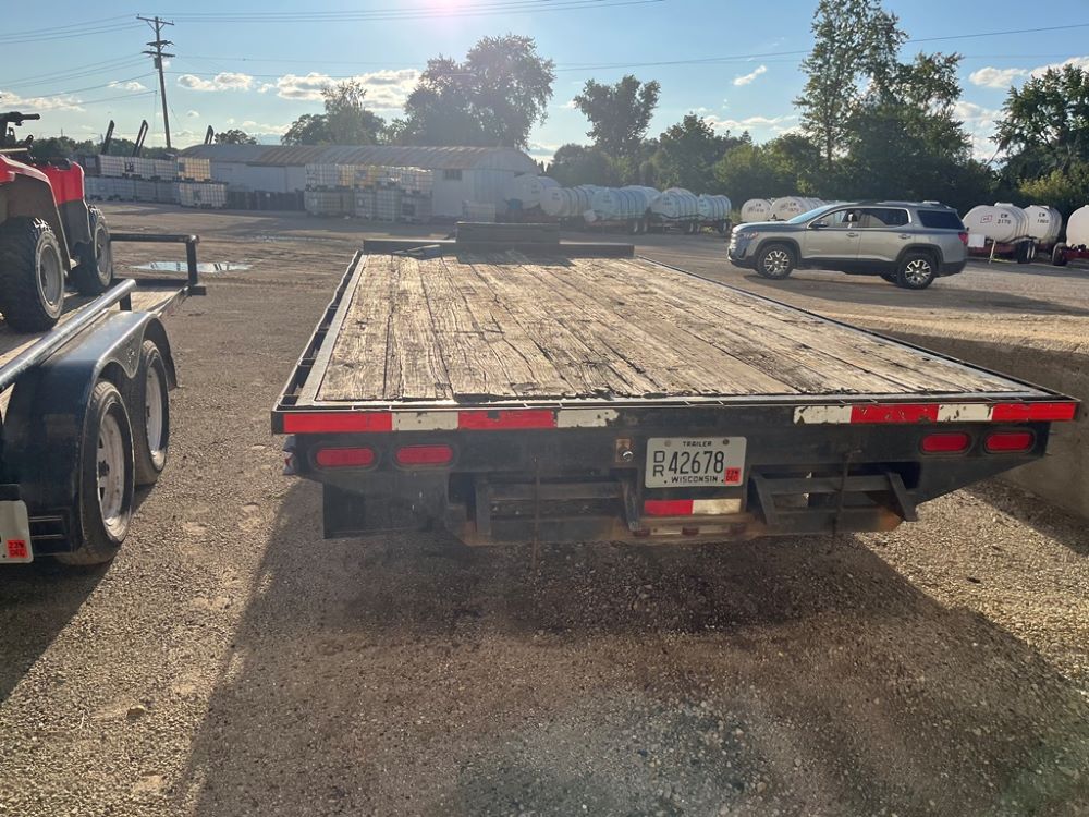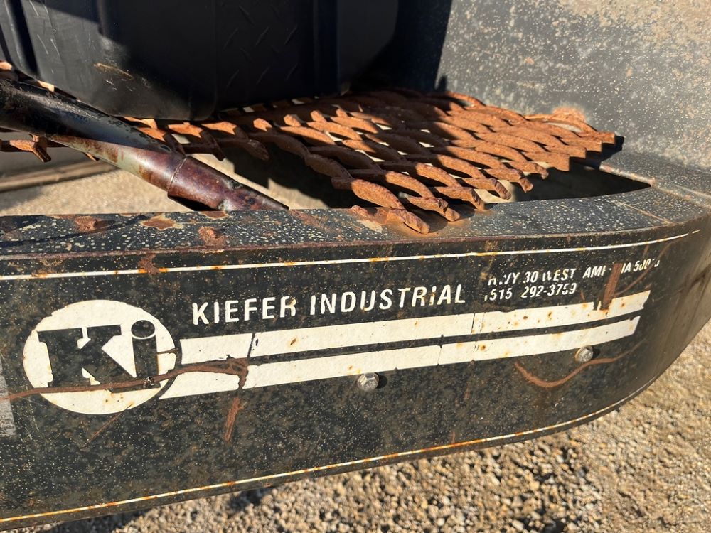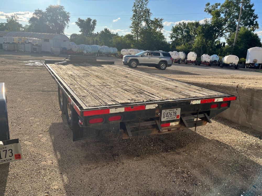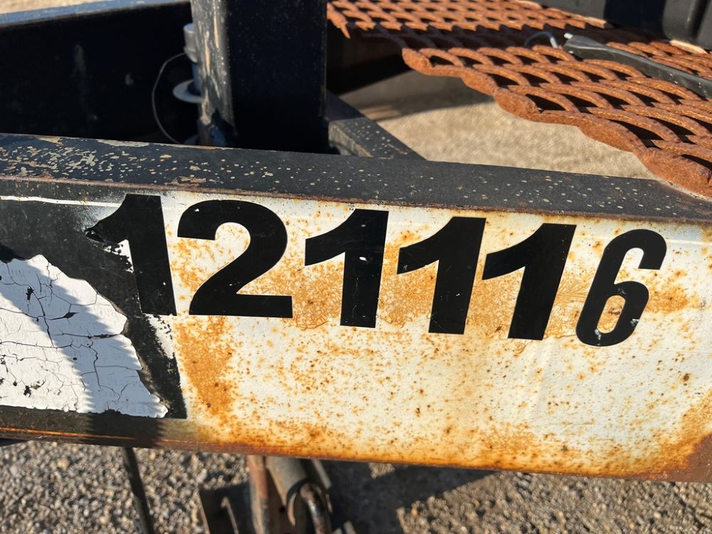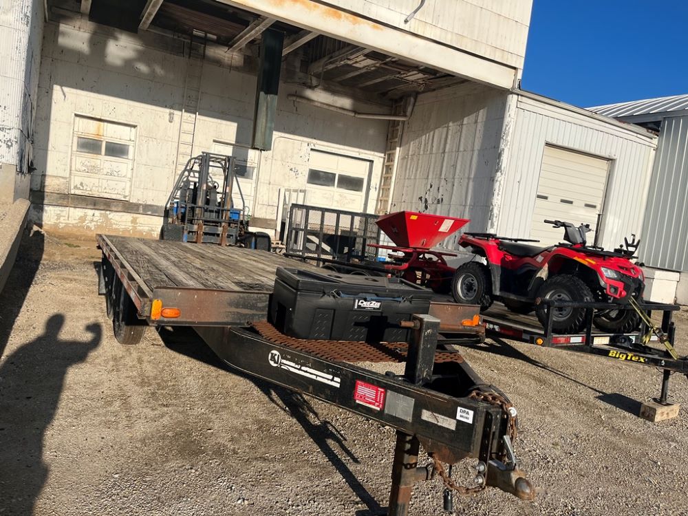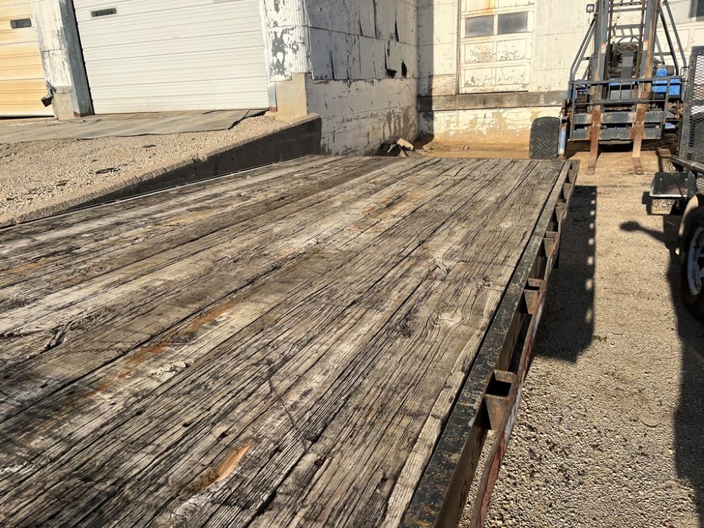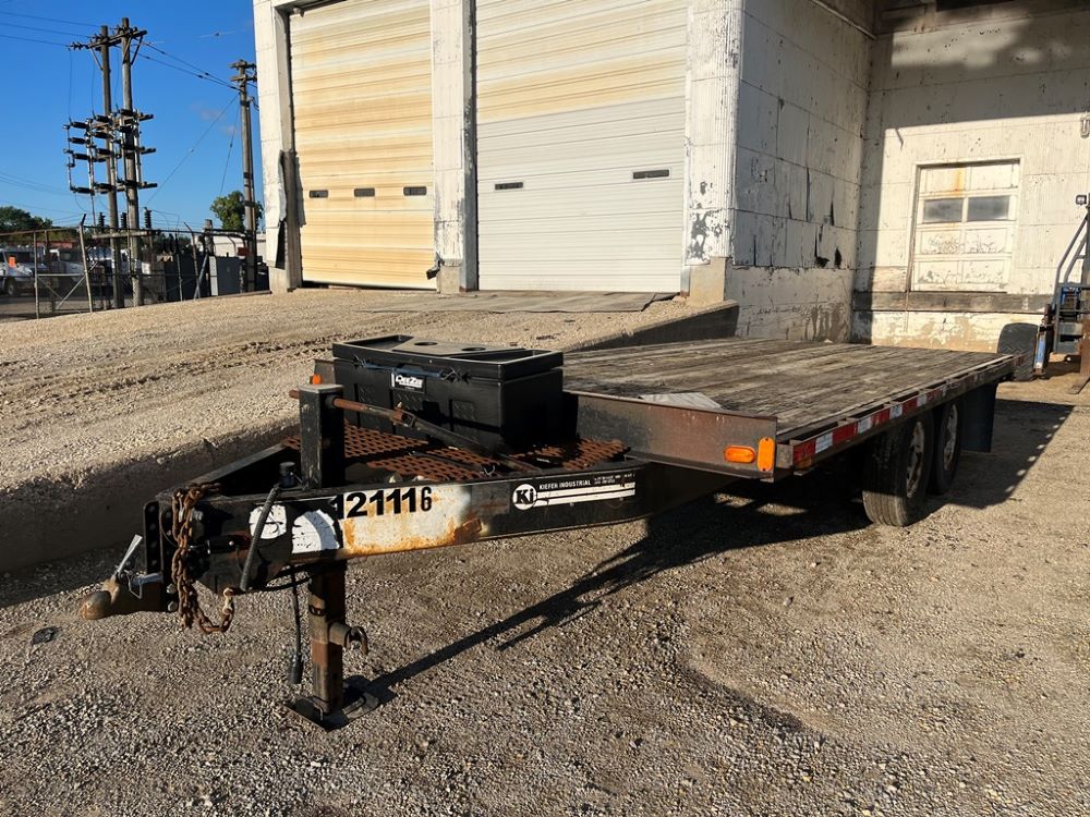 1999 Kiefer Trailer (DR5743), 16' pull type flatbed trailer, wood deck, pull out ramps, tandem axle, 235/85R16 tires, bumper hitch.
