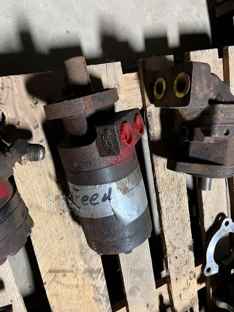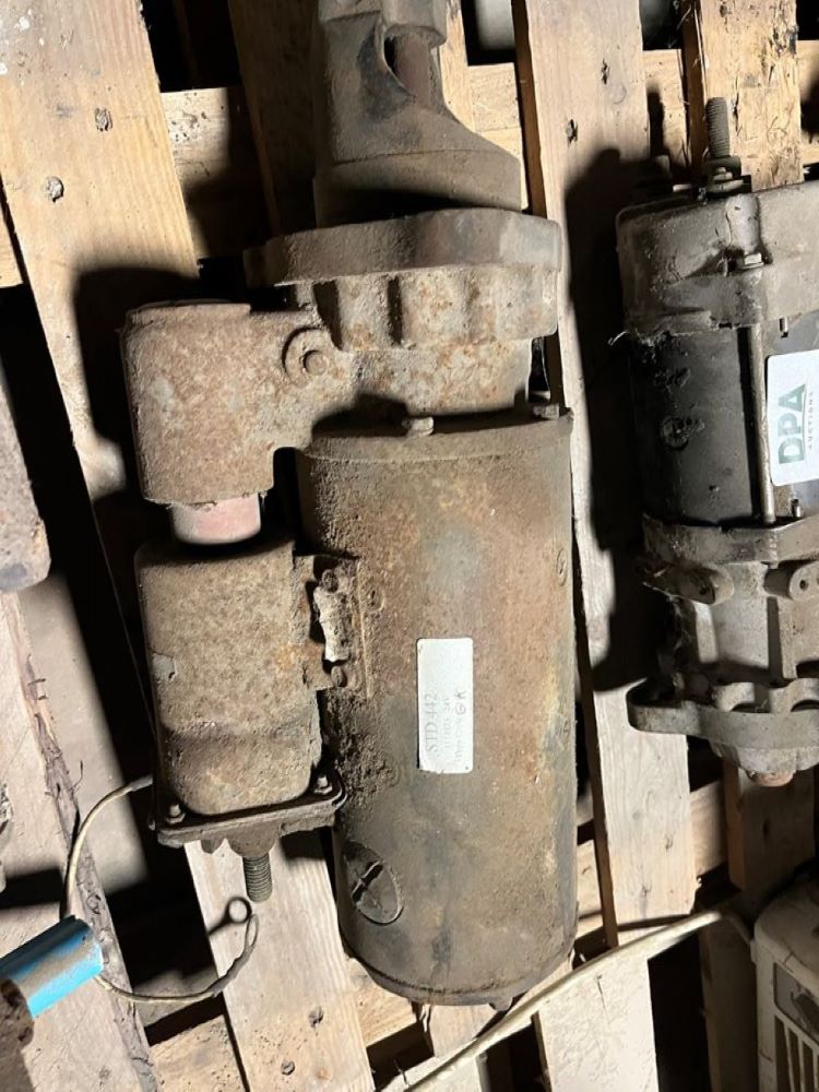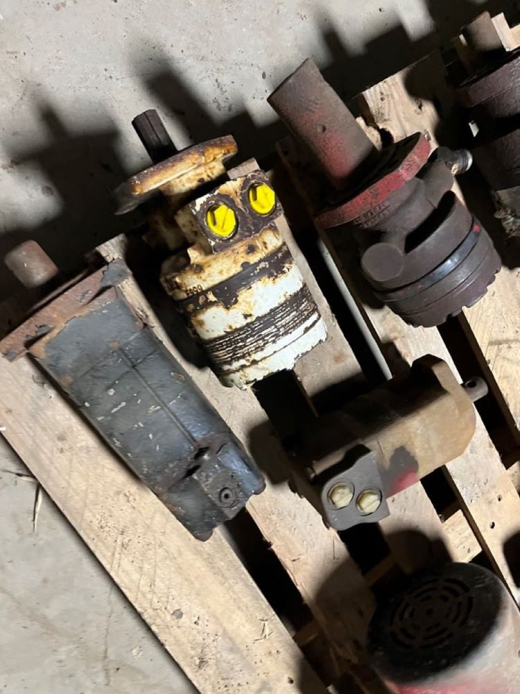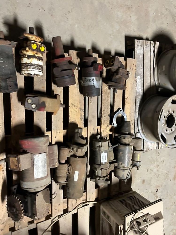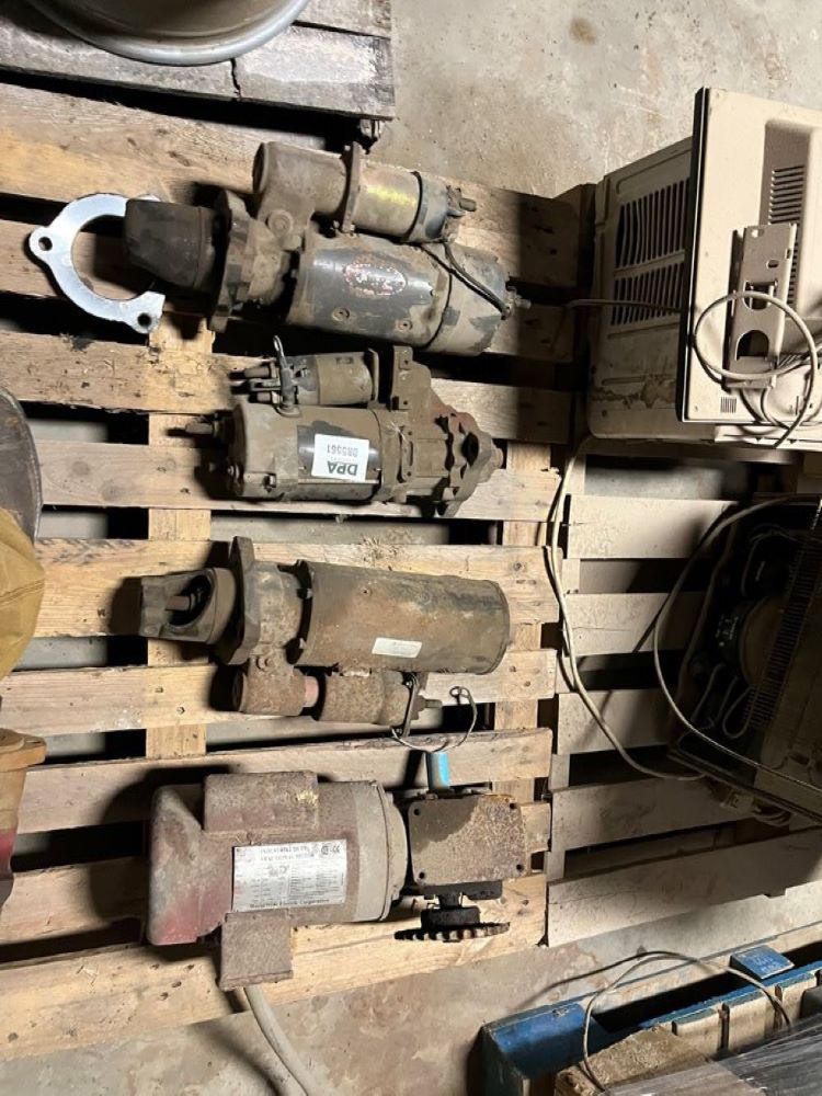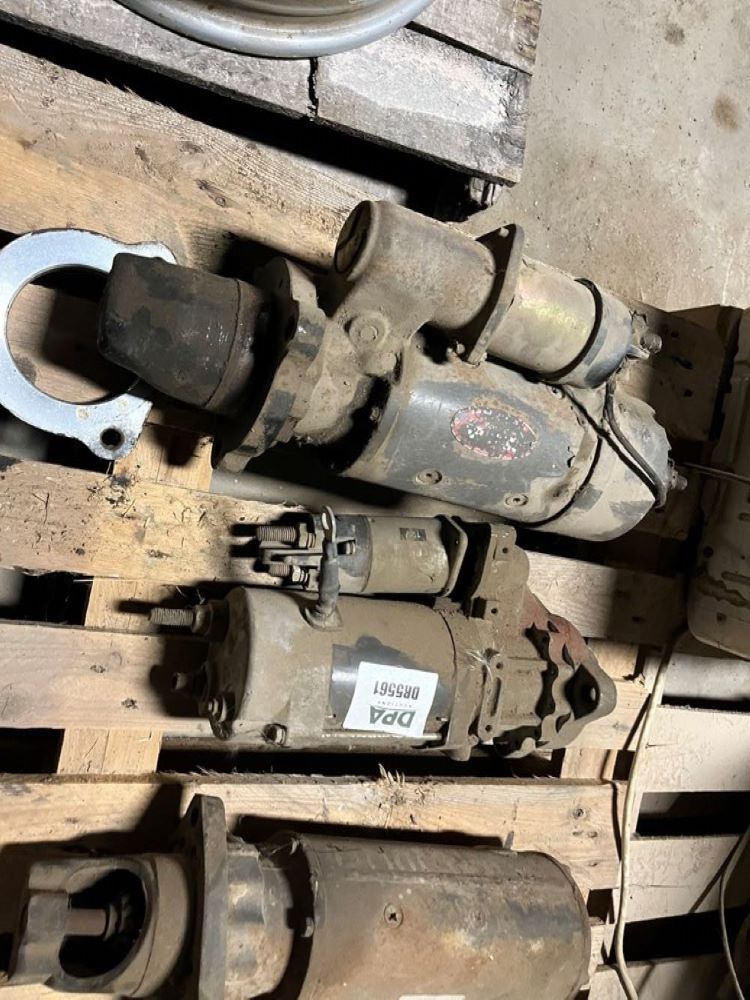 Starters (DR5561), pallet of assorted truck starters take offs and cores, and hydraulic orbit motors.