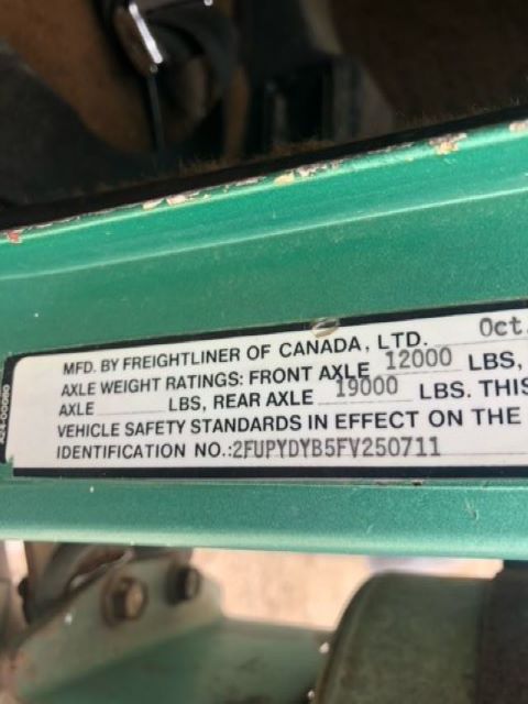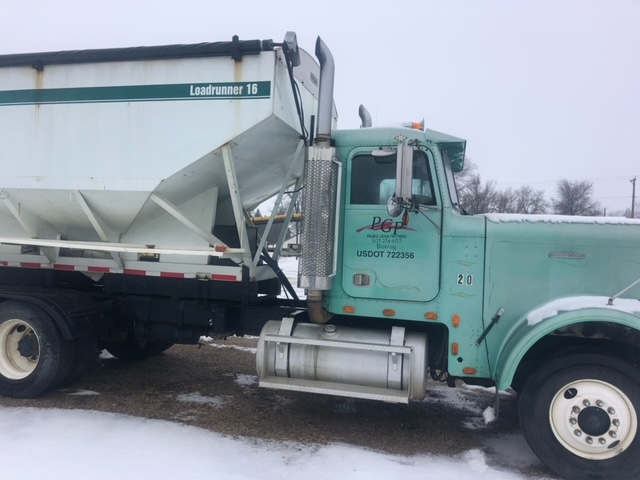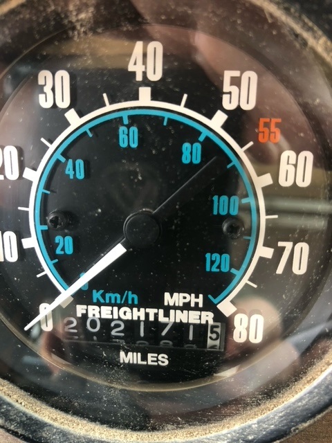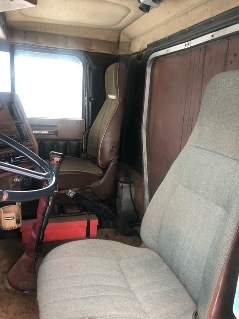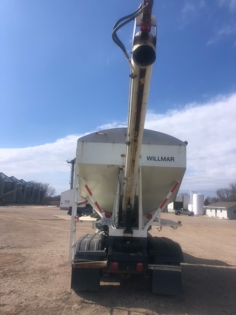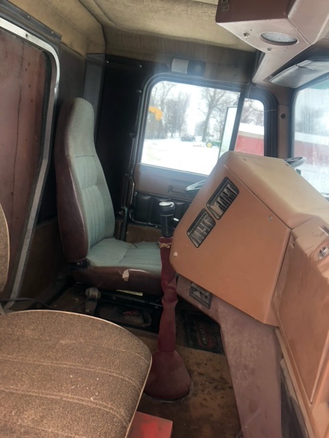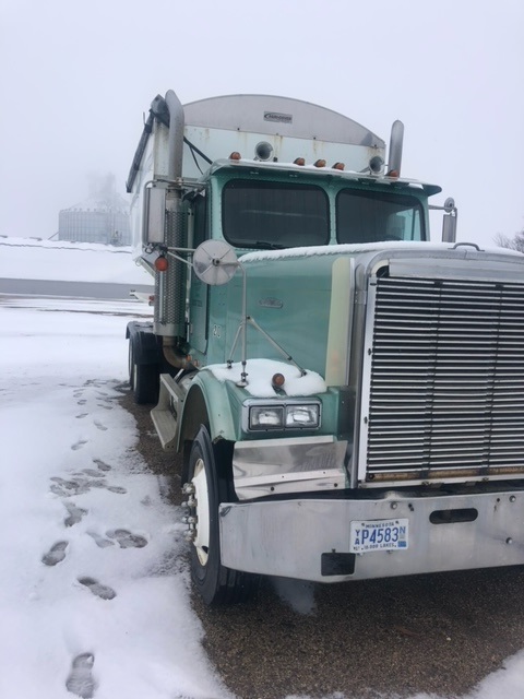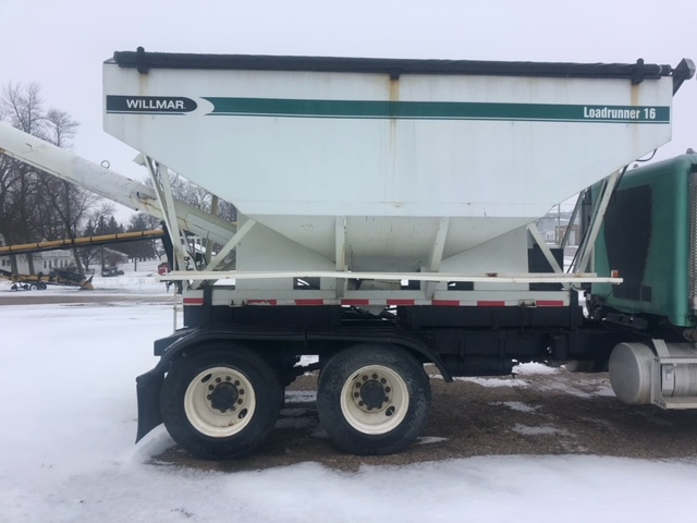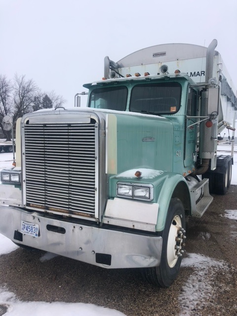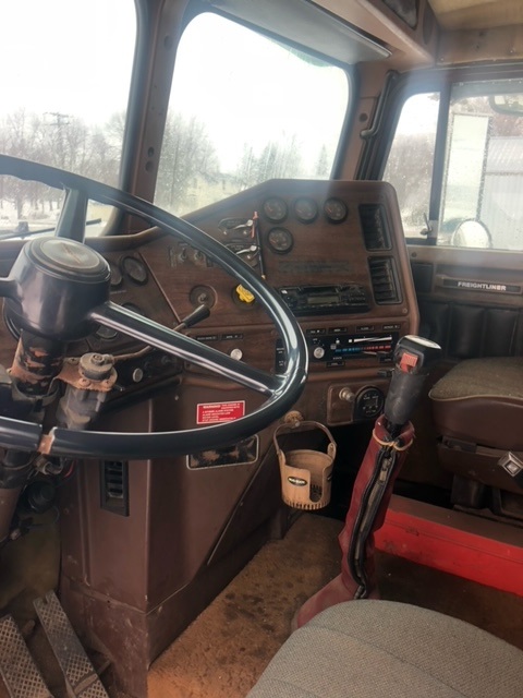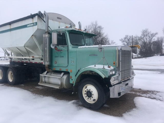1985 Freightliner Tender Truck (ED4183), 1985 Freightliner, 350 Cummins 6 cycle engine, speed transmission, 16 ton rear discharge auger has been extended, Willmar Load Runner 16, 275/80R22.5 tires, shows 202,171 miles.