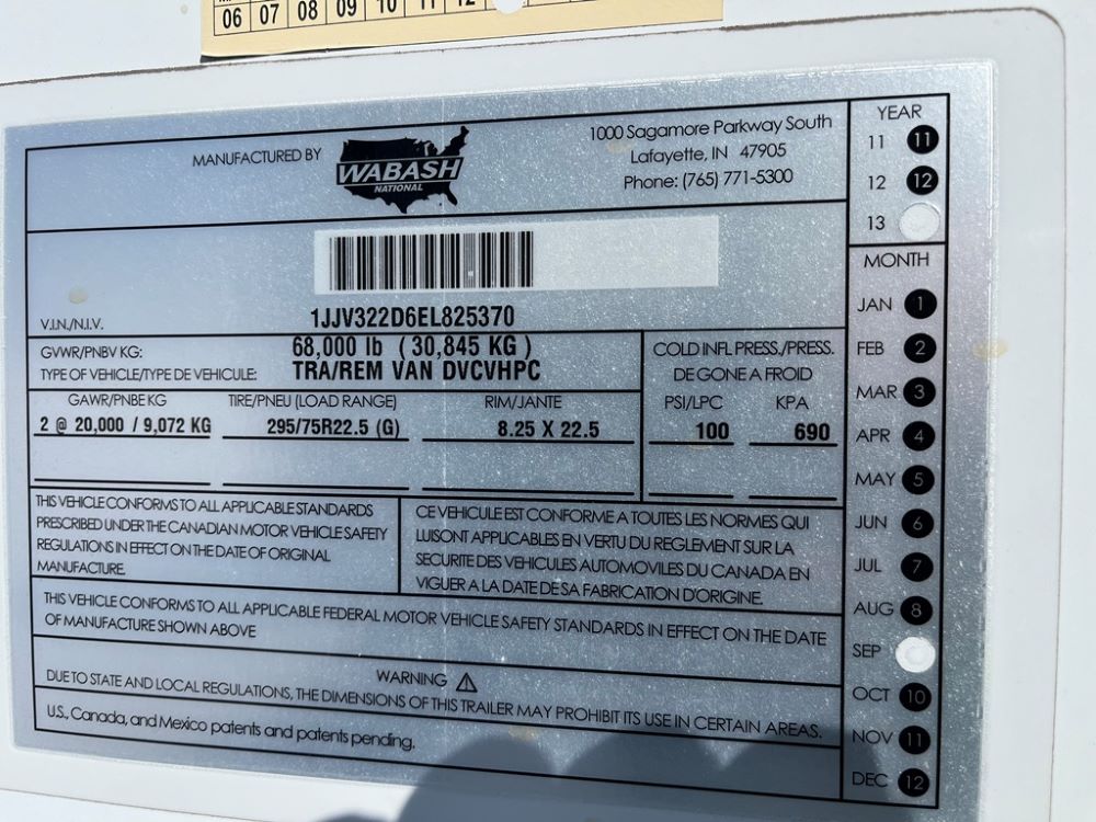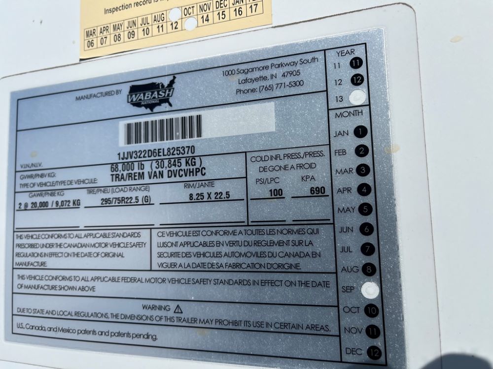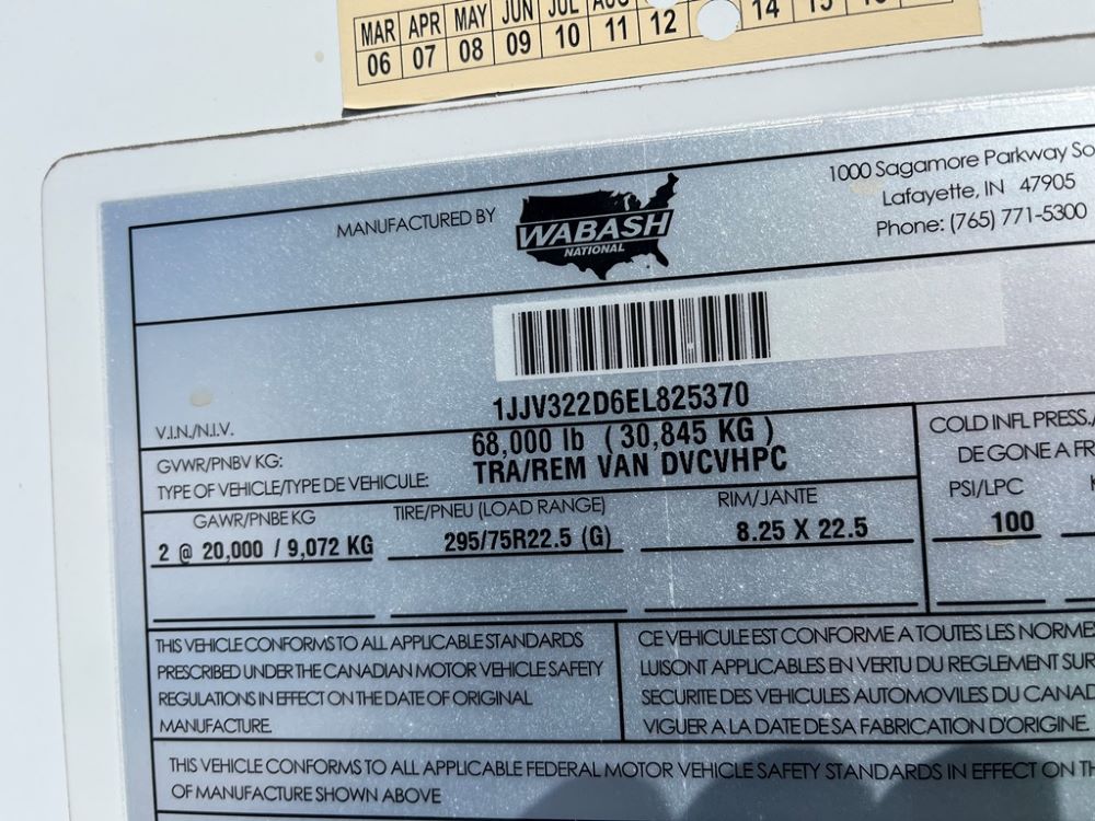 2014 Wabash Van Trailer (DR8107 Unit 5370), 32' dry van trailer, rear electric lift tail gate, sliding tandem axles, air ride suspension, 22.5 tires, all aluminum wheels.