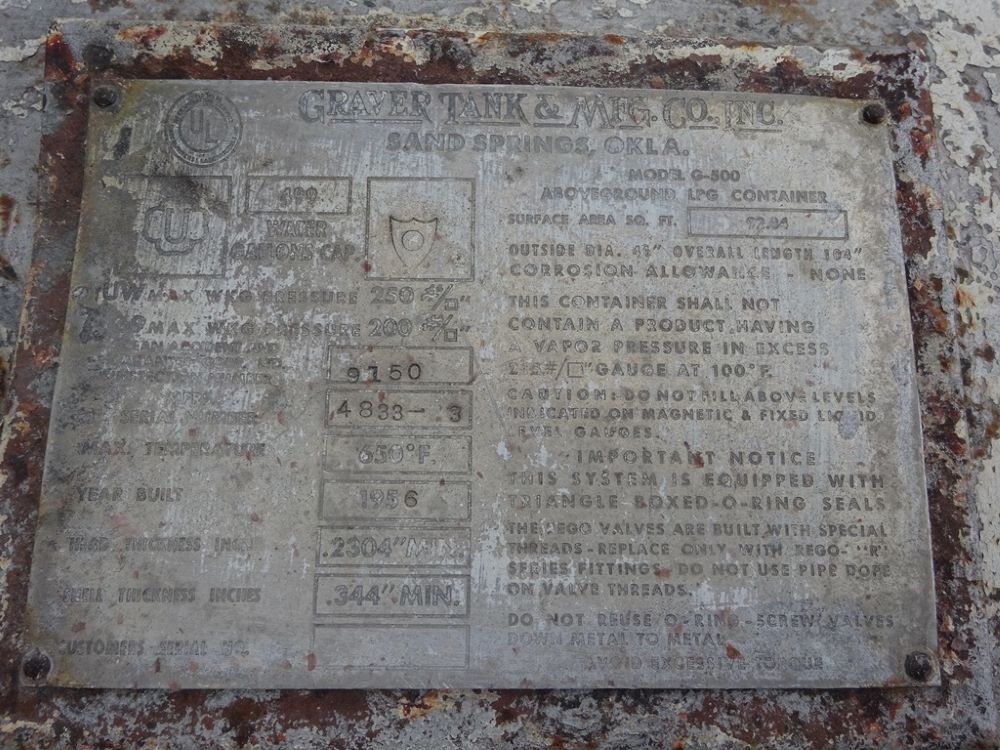 1956 Graver Tank & MFG. LP Tank (PZ12119), 1956 Graver Tank & MFG. 499 gallon LP tank, data plate.