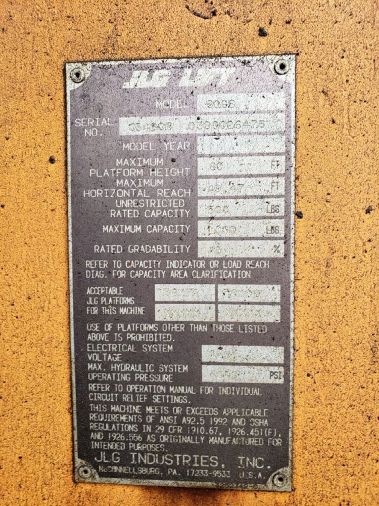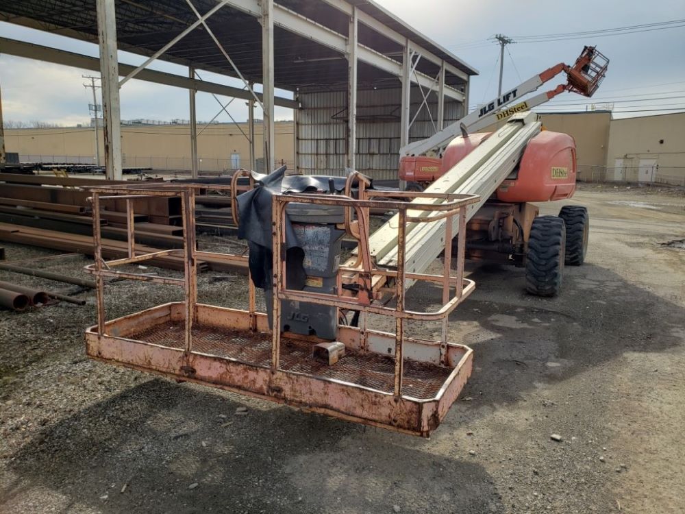 JLG 600S Lift (JM228), GVWR: 22,510 lbs., Deutz diesel engine, max. height- 60 ft., max. horizontal reach- 49.47 ft., unrestricted weight- 500 lbs., max. weight- 1,000 lbs., tires- 15-19.5 N.H.S., shows 8,516 hours.