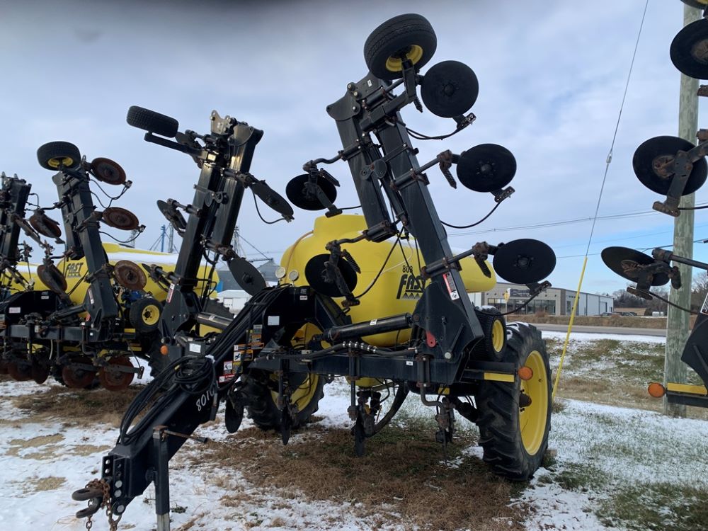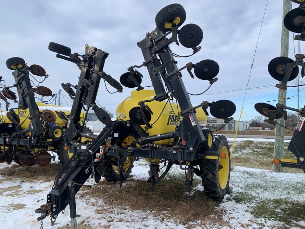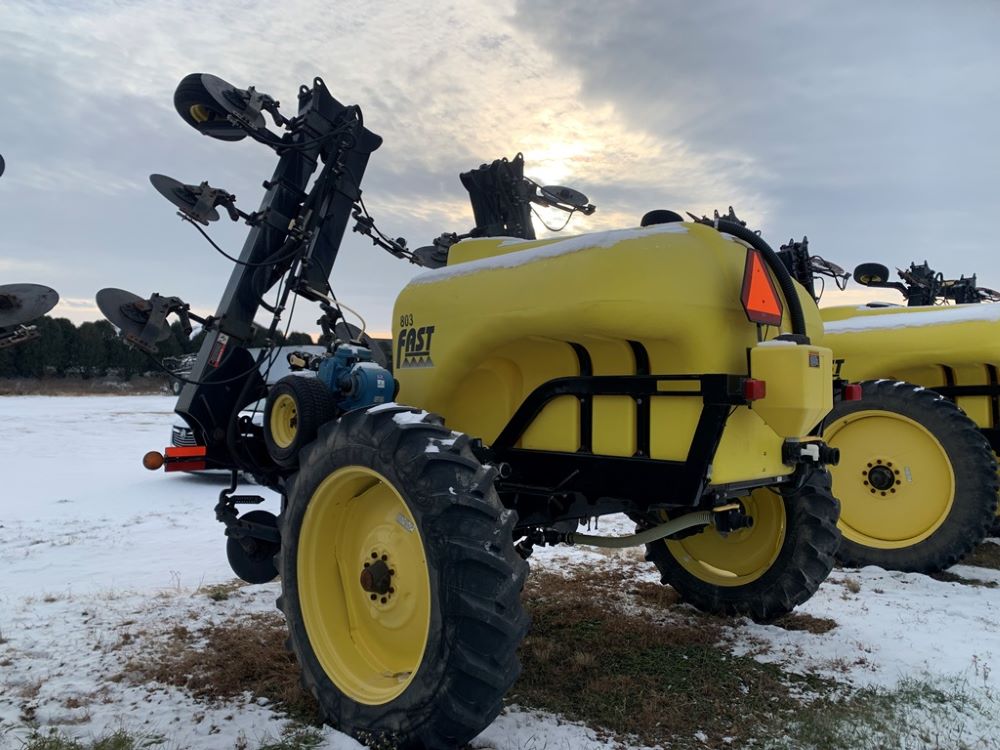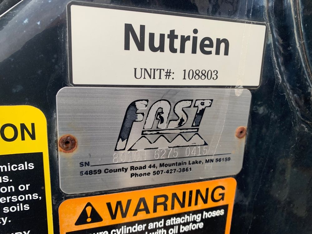 Fast 8010N Liquid Applicator (CP3232, Unit 108803), Fast model 8010N 1000 gallon poly liquid applicator, 15 coulter liquid injection, John Blue ground driven pump, hydraulic wings, poly fresh water tank, Titan 13.6-38 tires.