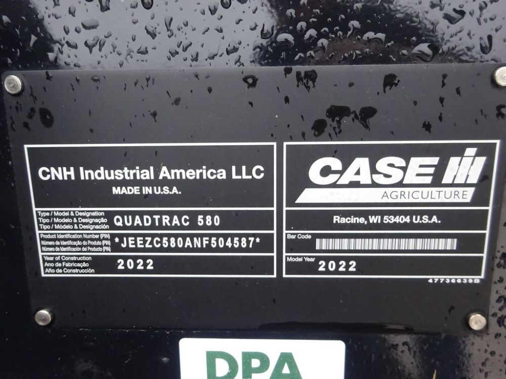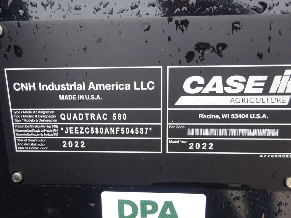 2022 CaseIH Steiger Quadtrac 580 Track Tractor (PZ12130), AFS Connect, Case FPT 12.9L diesel engine, full power shift transmission, 16 forward and 2 reverse, heat, air conditioning, Am/Fm radio, leather driver/buddy seat, power mirrors, Continental TrackMan tracks, approx. 30" tracks, 4 port hydraulics, 57 GPM pump, CAT 5 draw bar, 470 gallon fuel tank, auto track, front and rear camera, AFS Pro 1200 monitor, shows 360 hours.