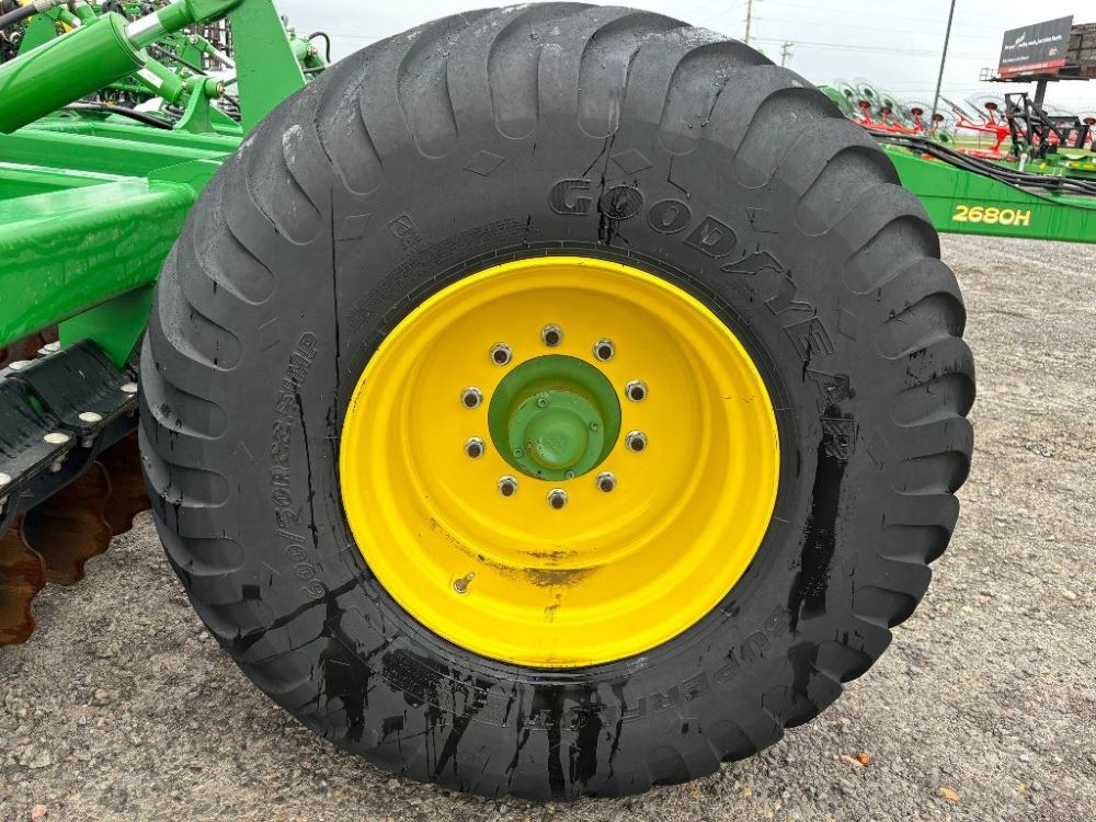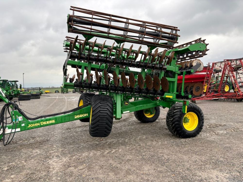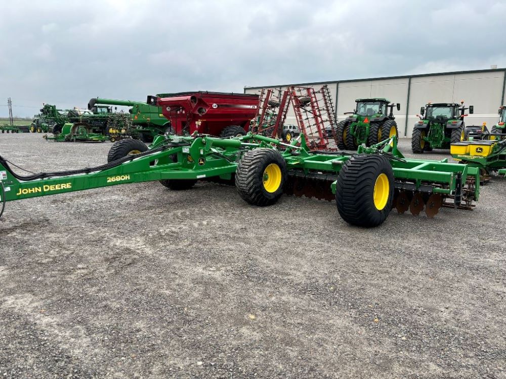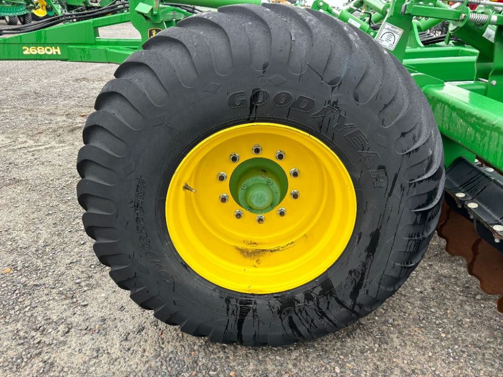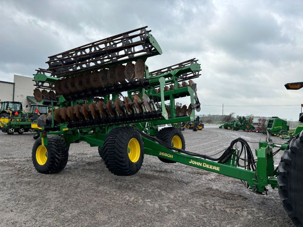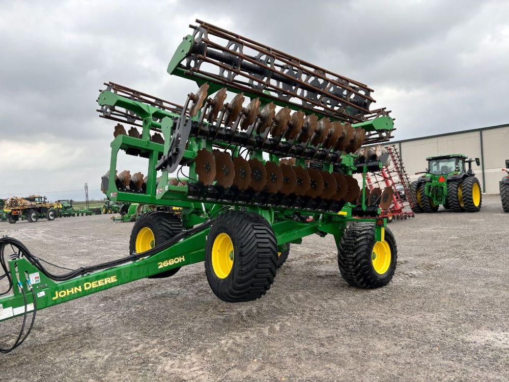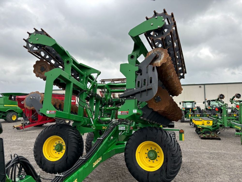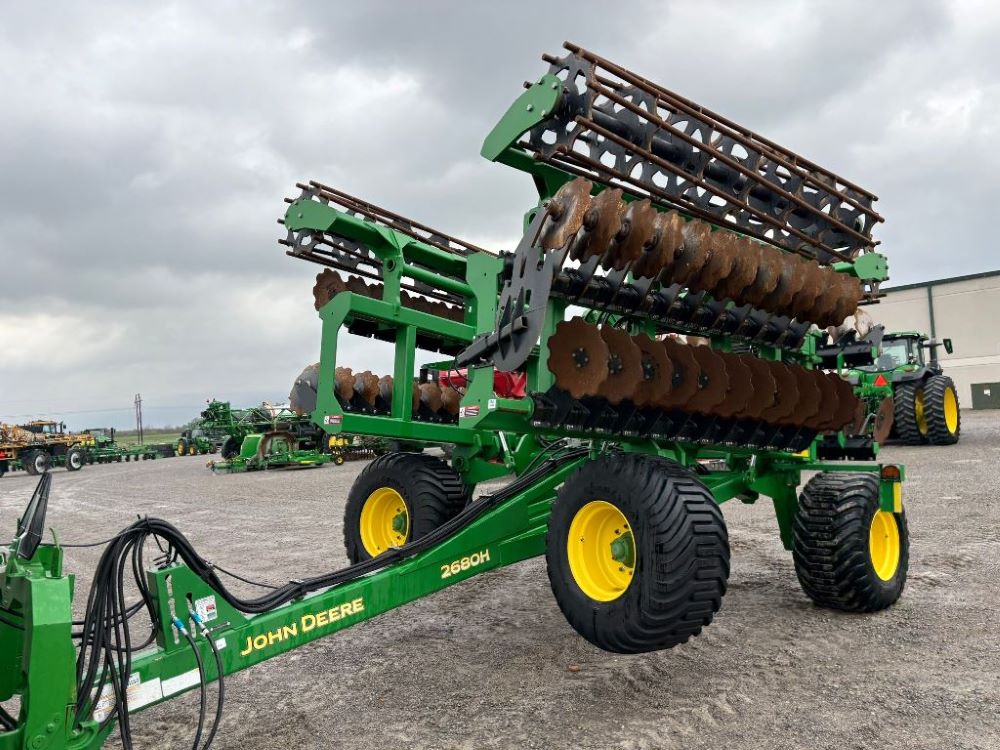 2022 John Deere 2680H High Performance Disk (GP6955), 30' working width, 3 section fold, 13' transport width, independent disk arms with compressed rubber cushion mounts, 20" notched front blades, 20" smooth rear blades, single point depth control, high speed capable up to 11.5MPH (41 acres/hour), 25.5" round bar cage rolling baskets, hydraulic tongue jack, ridge deflectors, Goodyear Superflot 600/50R22.5 tires, CAT 4 single tine hitch.