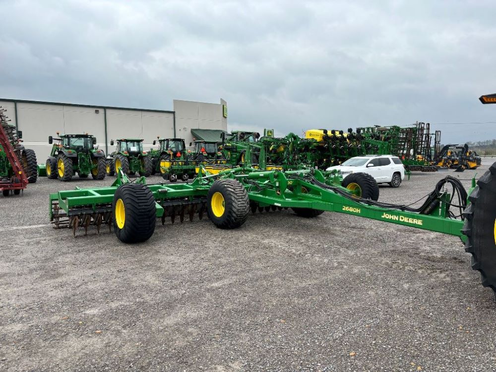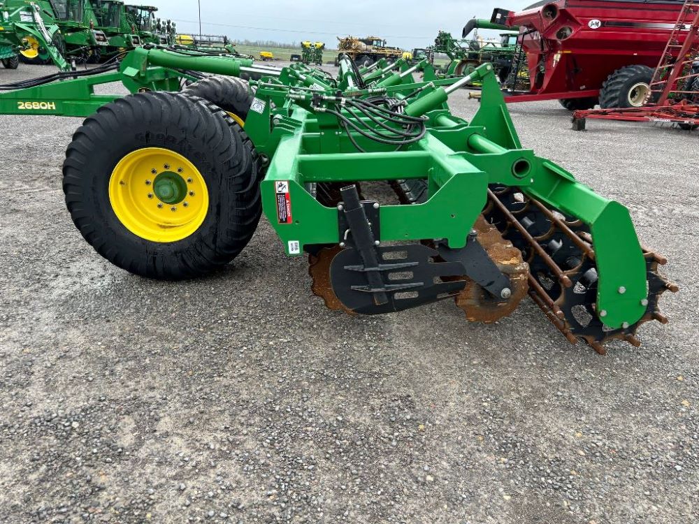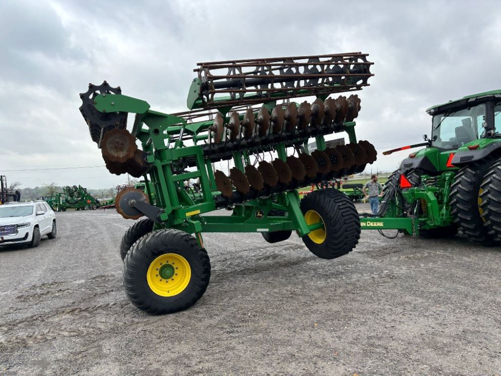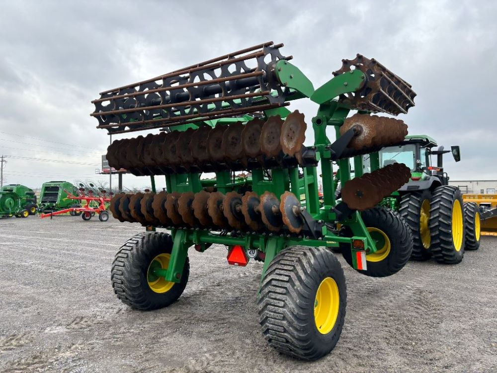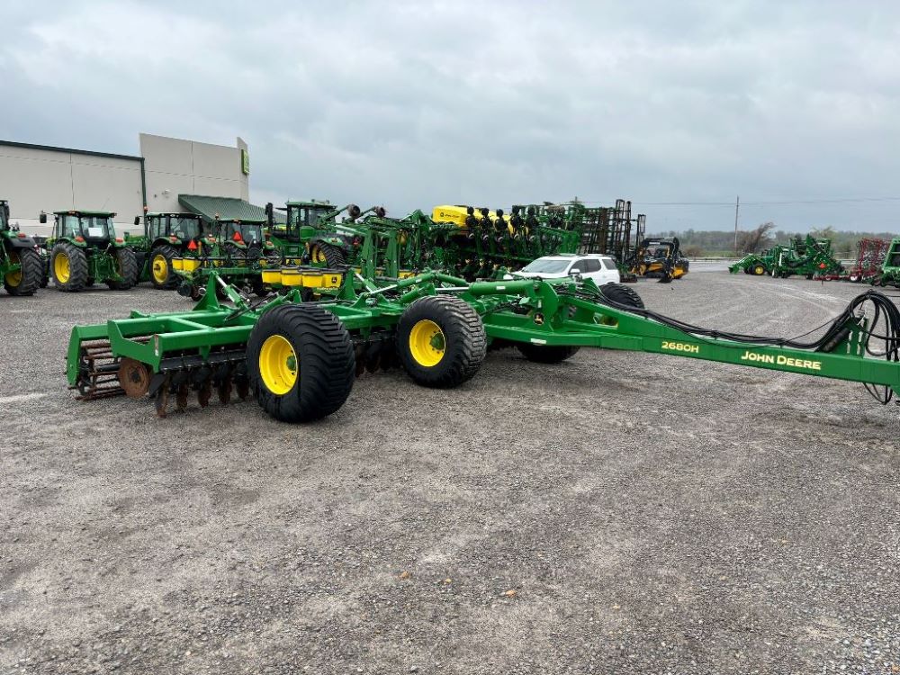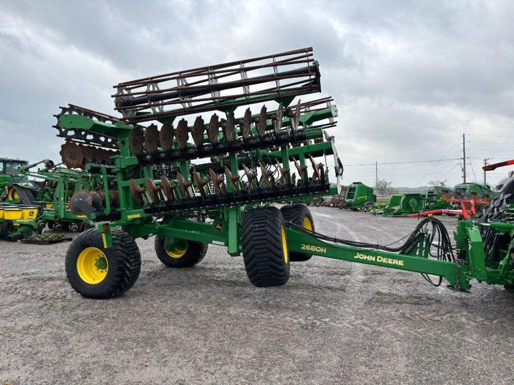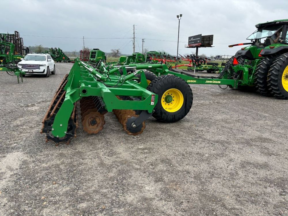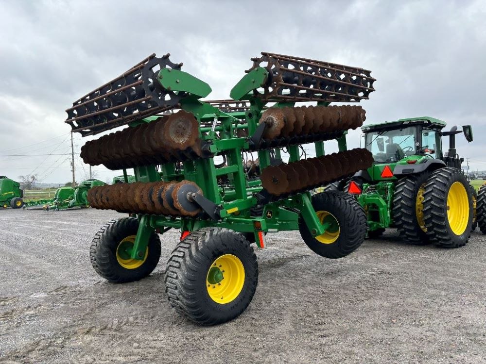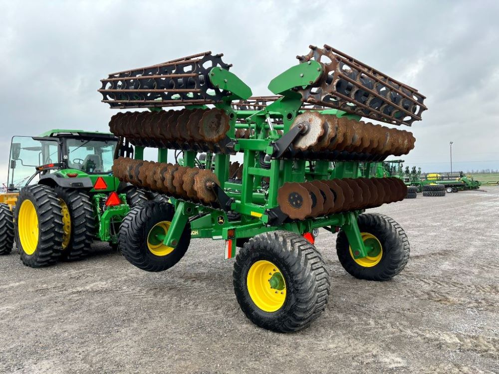 2022 John Deere 2680H High Performance Disk (GP6955), 30' working width, 3 section fold, 13' transport width, independent disk arms with compressed rubber cushion mounts, 20" notched front blades, 20" smooth rear blades, single point depth control, high speed capable up to 11.5MPH (41 acres/hour), 25.5" round bar cage rolling baskets, hydraulic tongue jack, ridge deflectors, Goodyear Superflot 600/50R22.5 tires, CAT 4 single tine hitch.