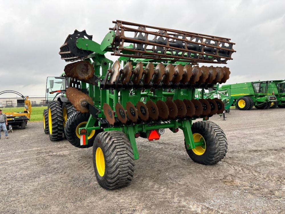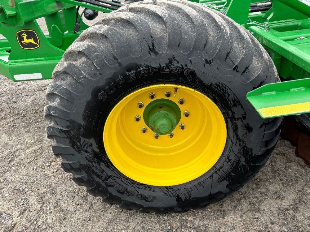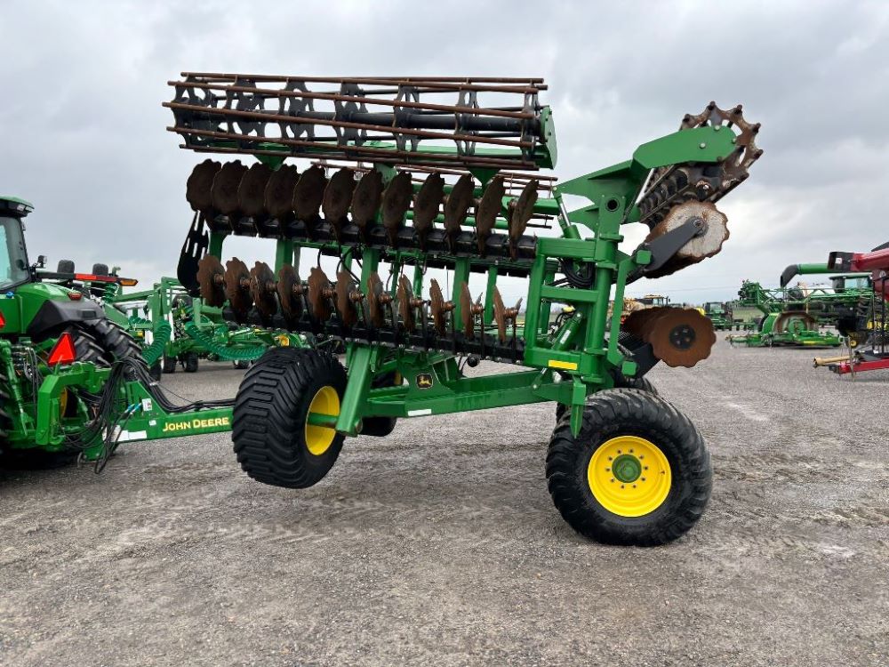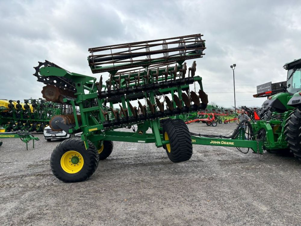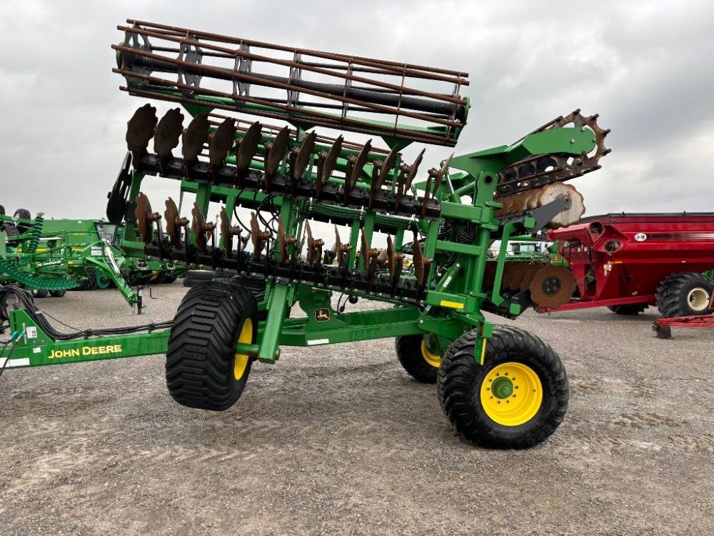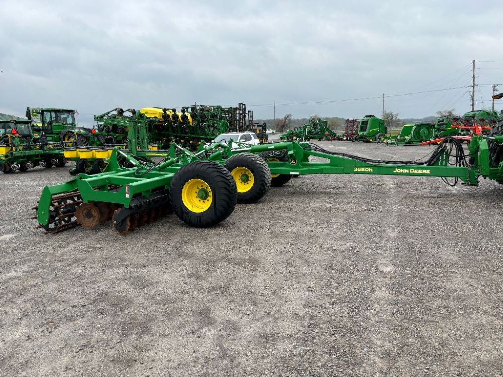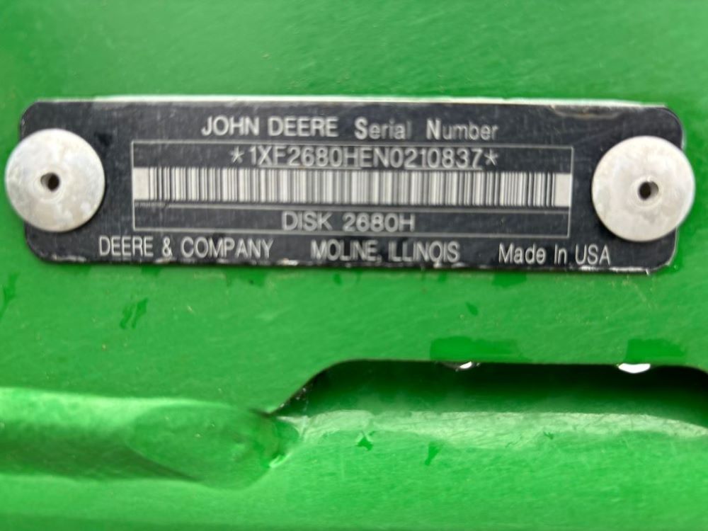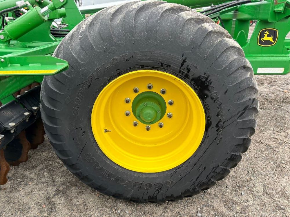 2022 John Deere 2680H High Performance Disk (GP6955), 30' working width, 3 section fold, 13' transport width, independent disk arms with compressed rubber cushion mounts, 20" notched front blades, 20" smooth rear blades, single point depth control, high speed capable up to 11.5MPH (41 acres/hour), 25.5" round bar cage rolling baskets, hydraulic tongue jack, ridge deflectors, Goodyear Superflot 600/50R22.5 tires, CAT 4 single tine hitch.