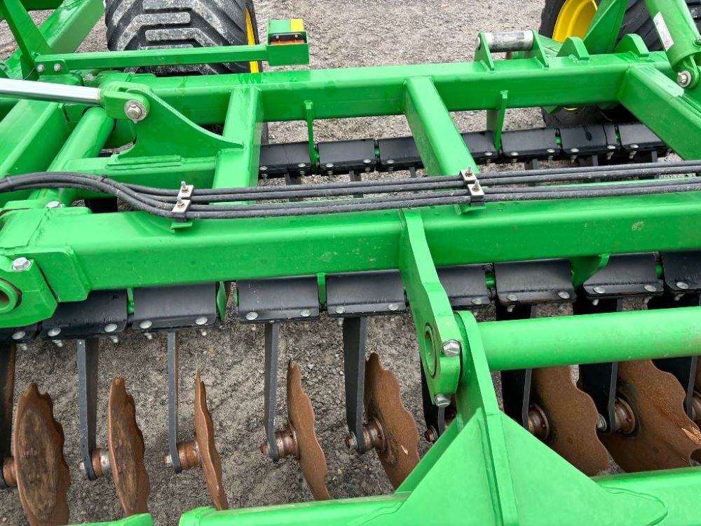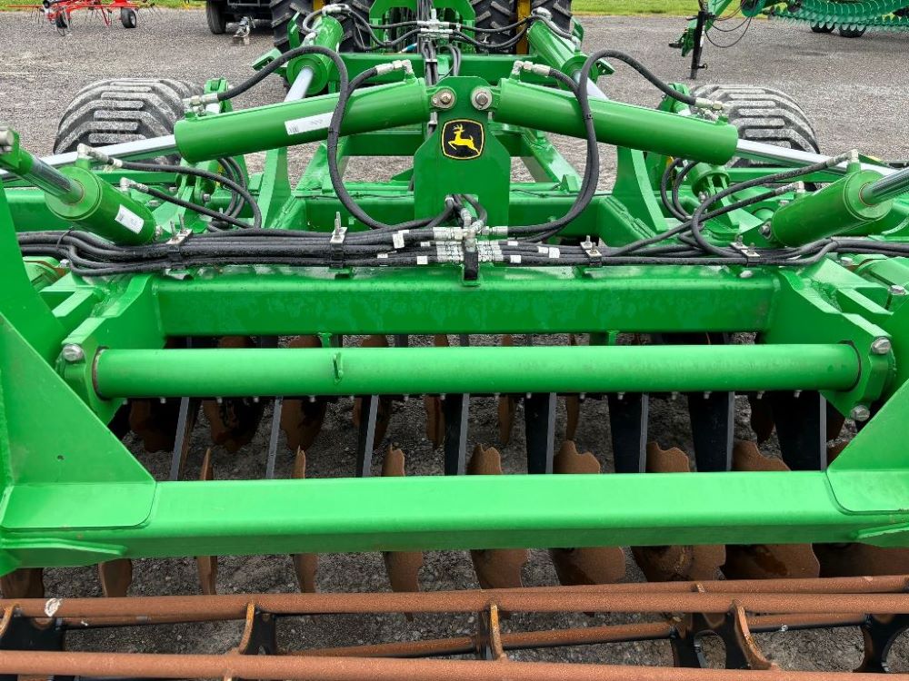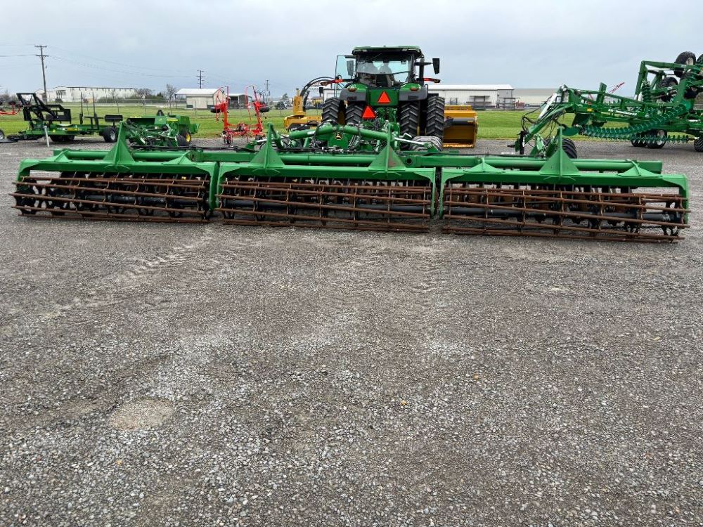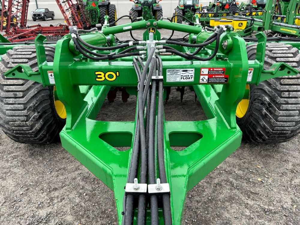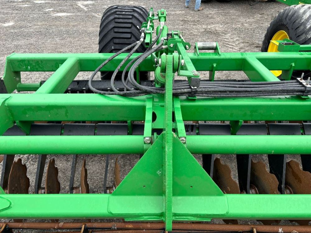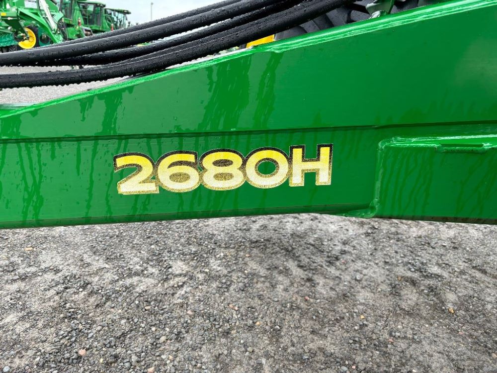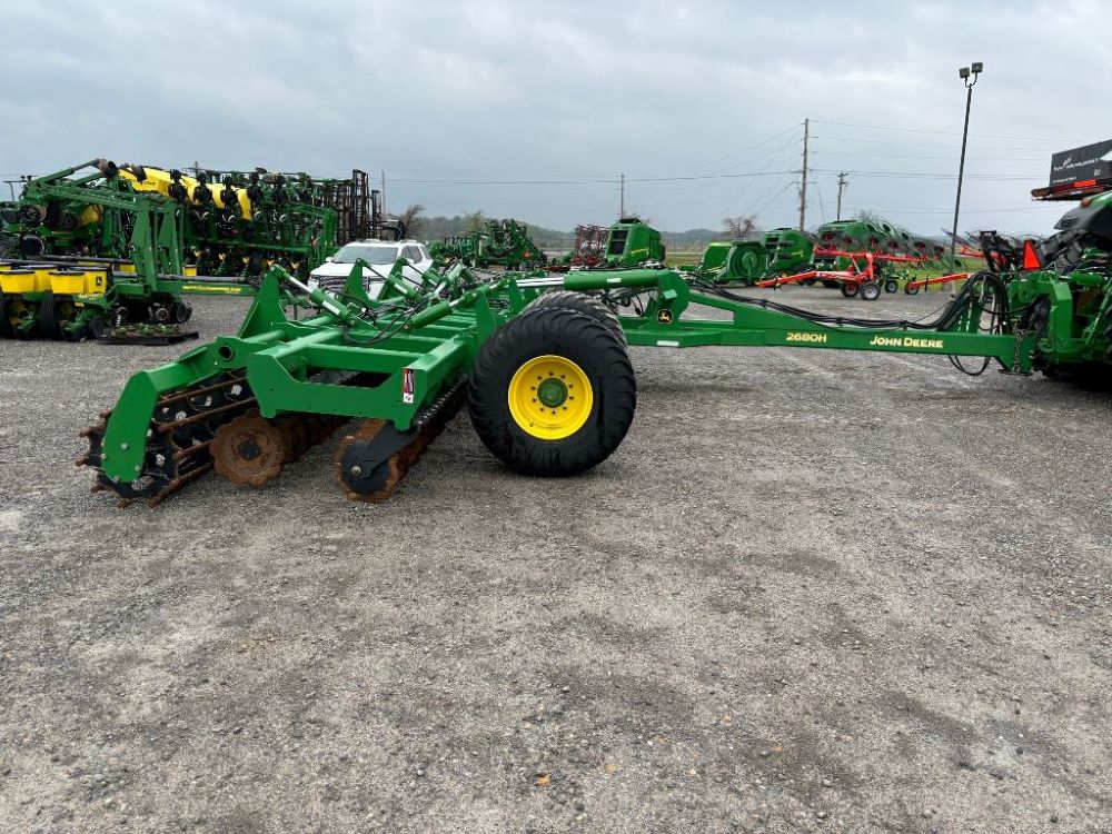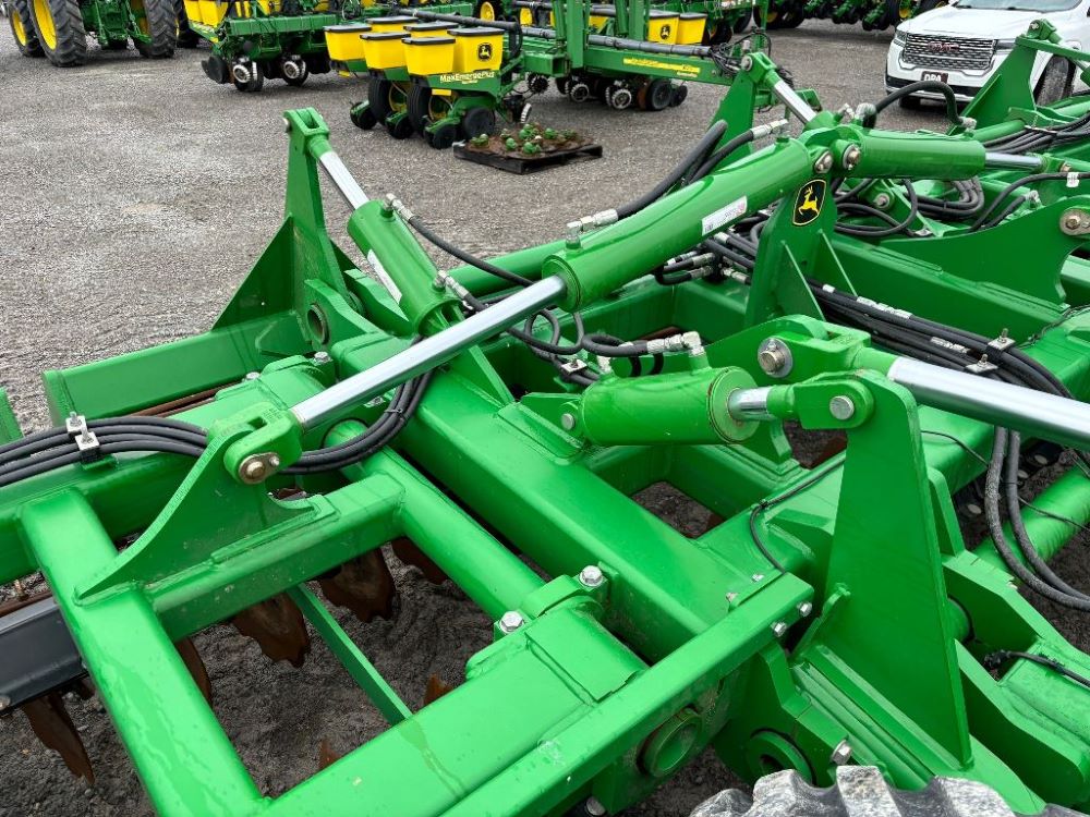 2022 John Deere 2680H High Performance Disk (GP6955), 30' working width, 3 section fold, 13' transport width, independent disk arms with compressed rubber cushion mounts, 20" notched front blades, 20" smooth rear blades, single point depth control, high speed capable up to 11.5MPH (41 acres/hour), 25.5" round bar cage rolling baskets, hydraulic tongue jack, ridge deflectors, Goodyear Superflot 600/50R22.5 tires, CAT 4 single tine hitch.