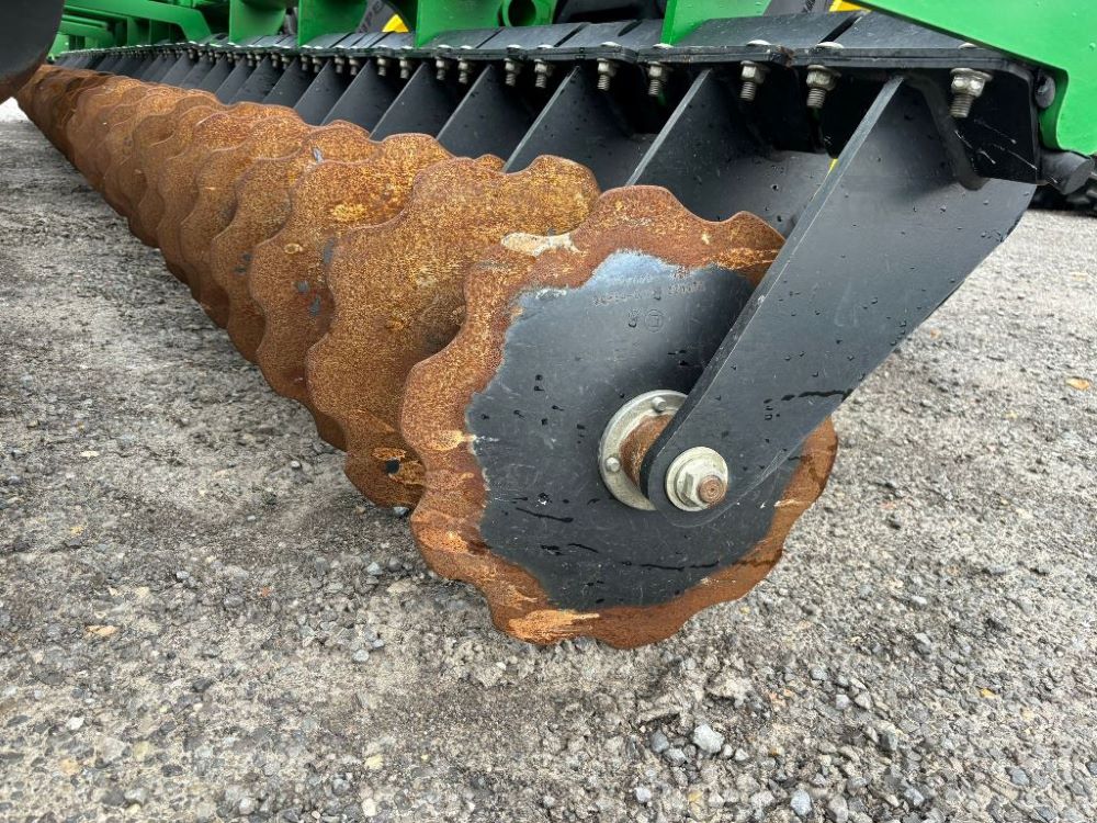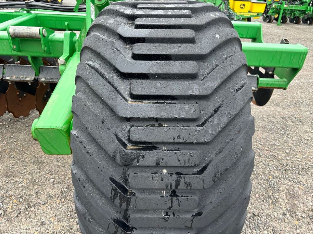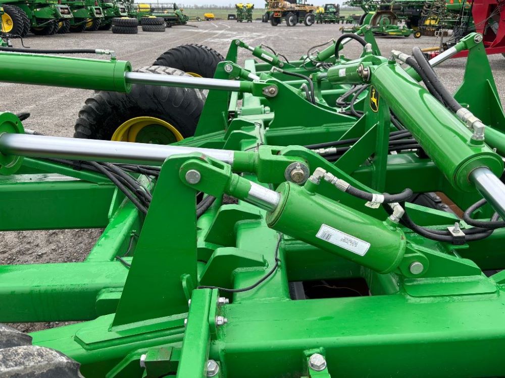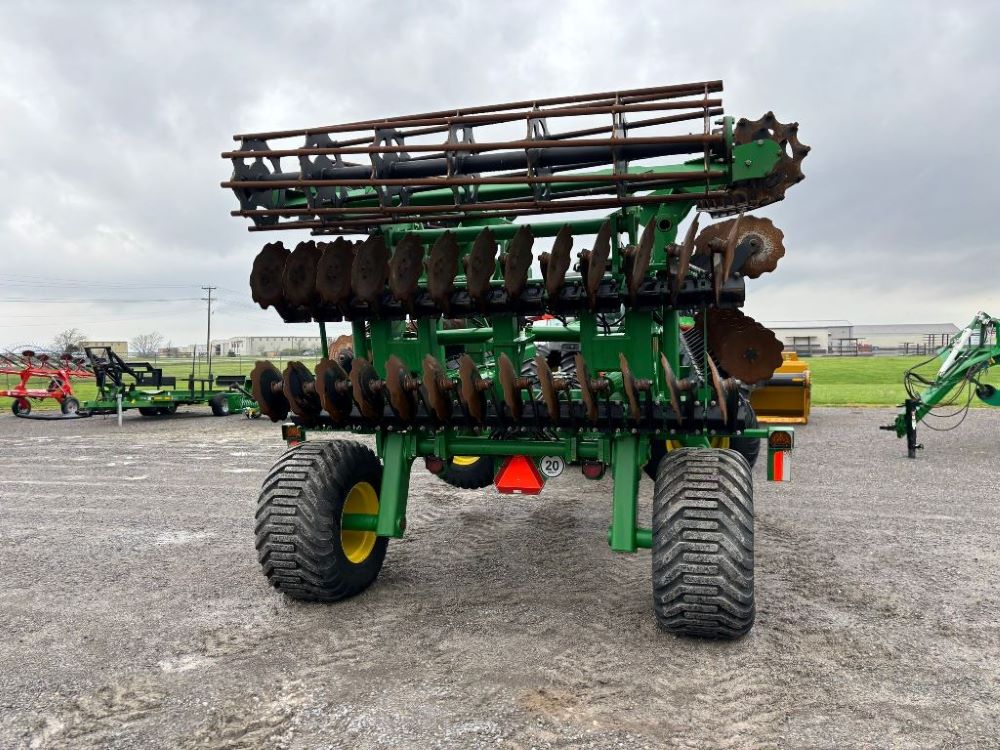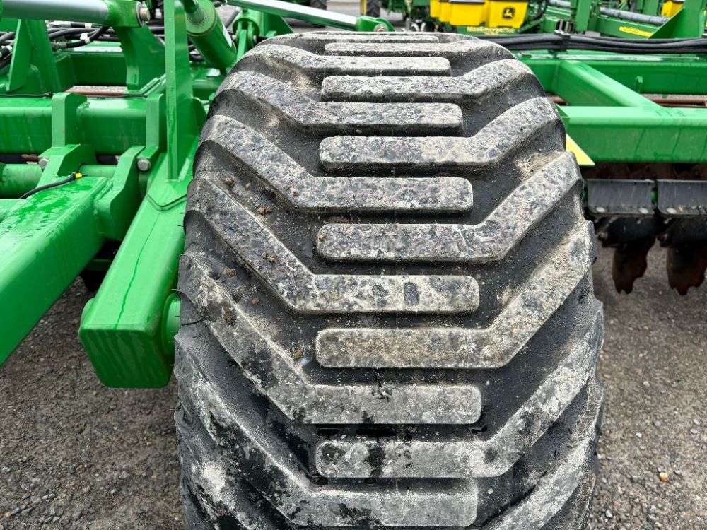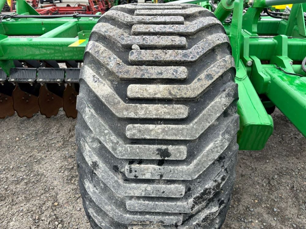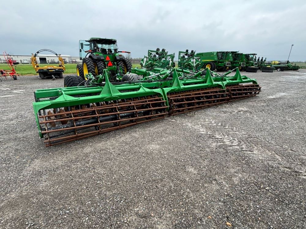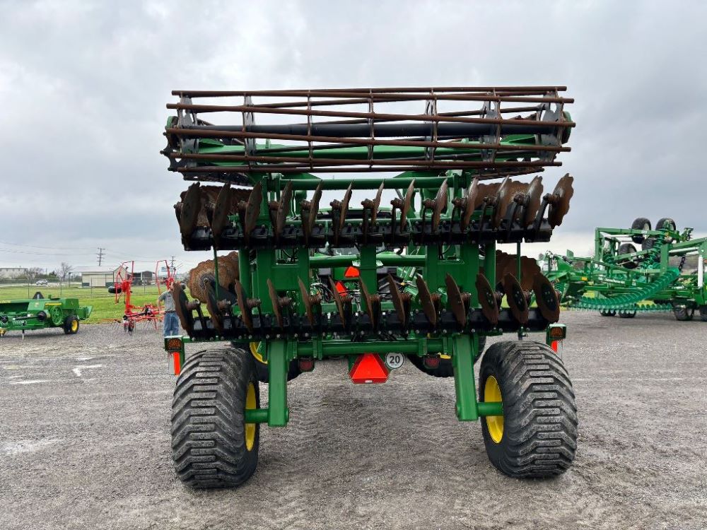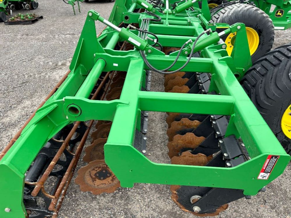2022 John Deere 2680H High Performance Disk (GP6955), 30' working width, 3 section fold, 13' transport width, independent disk arms with compressed rubber cushion mounts, 20" notched front blades, 20" smooth rear blades, single point depth control, high speed capable up to 11.5MPH (41 acres/hour), 25.5" round bar cage rolling baskets, hydraulic tongue jack, ridge deflectors, Goodyear Superflot 600/50R22.5 tires, CAT 4 single tine hitch.