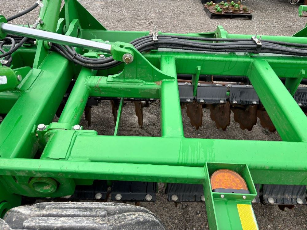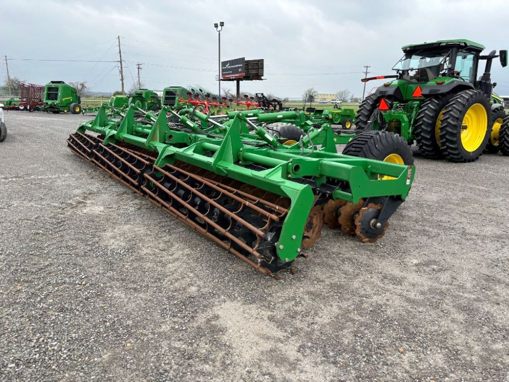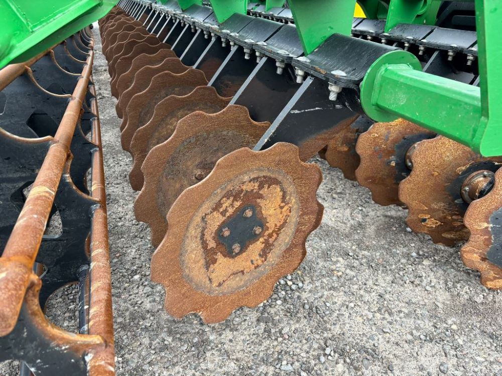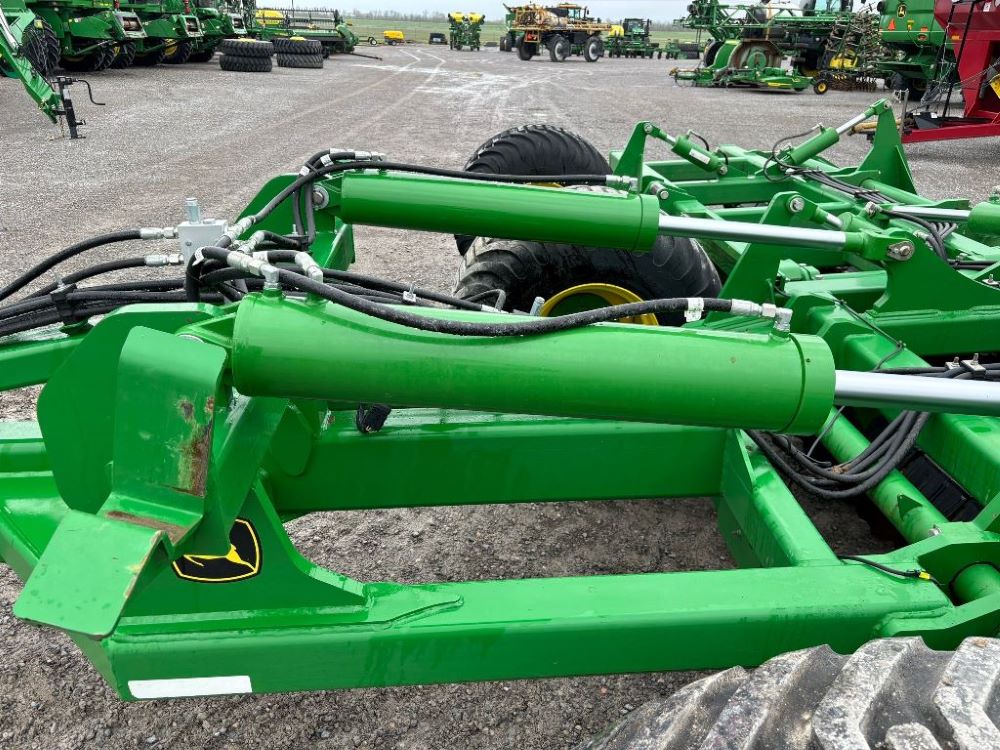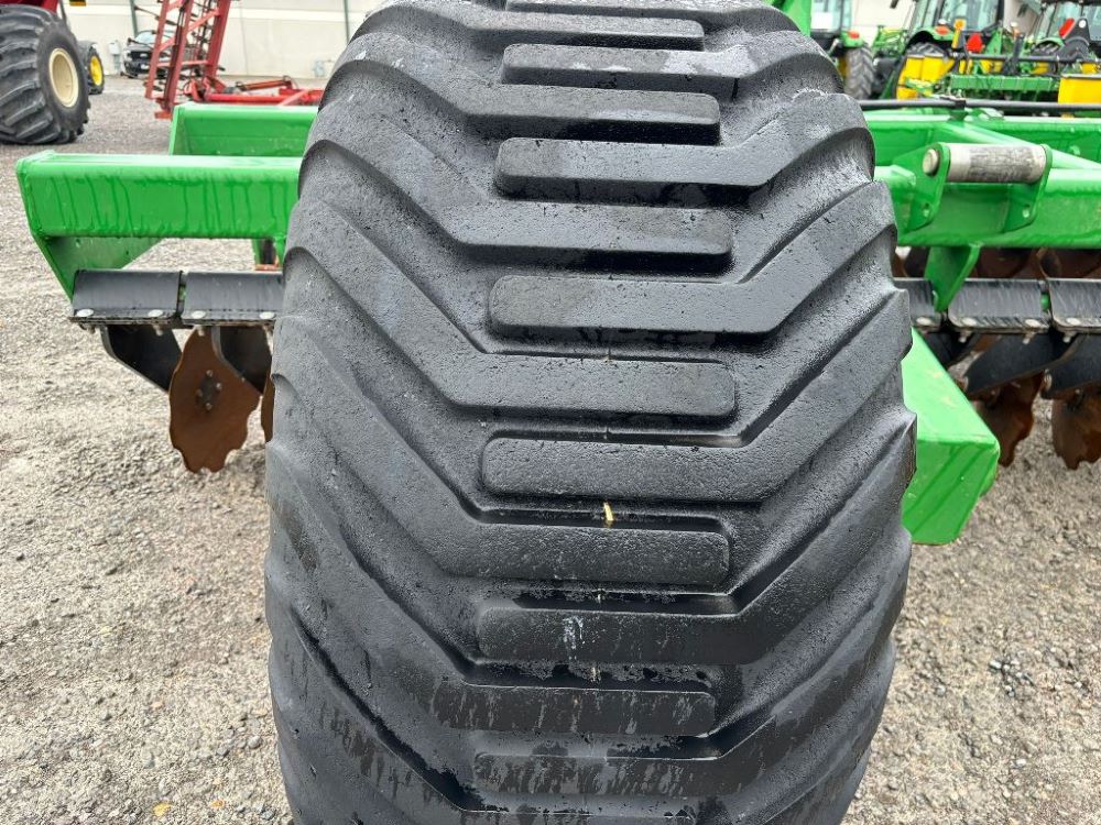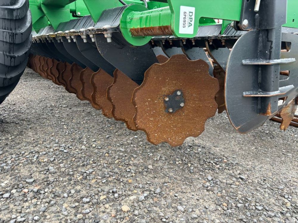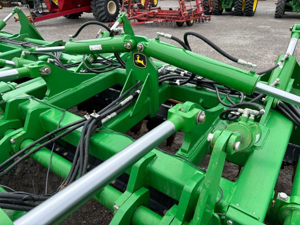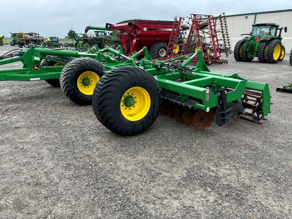 2022 John Deere 2680H High Performance Disk (GP6955), 30' working width, 3 section fold, 13' transport width, independent disk arms with compressed rubber cushion mounts, 20" notched front blades, 20" smooth rear blades, single point depth control, high speed capable up to 11.5MPH (41 acres/hour), 25.5" round bar cage rolling baskets, hydraulic tongue jack, ridge deflectors, Goodyear Superflot 600/50R22.5 tires, CAT 4 single tine hitch.