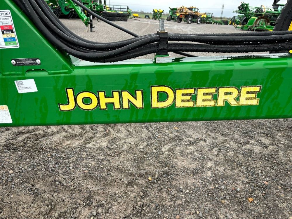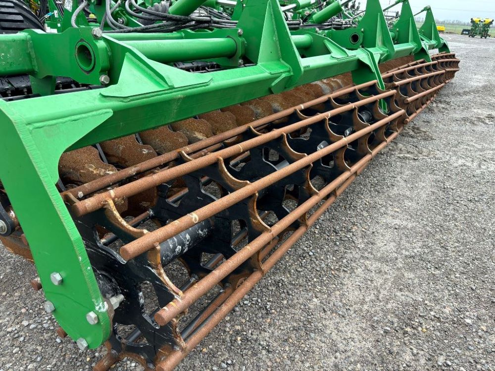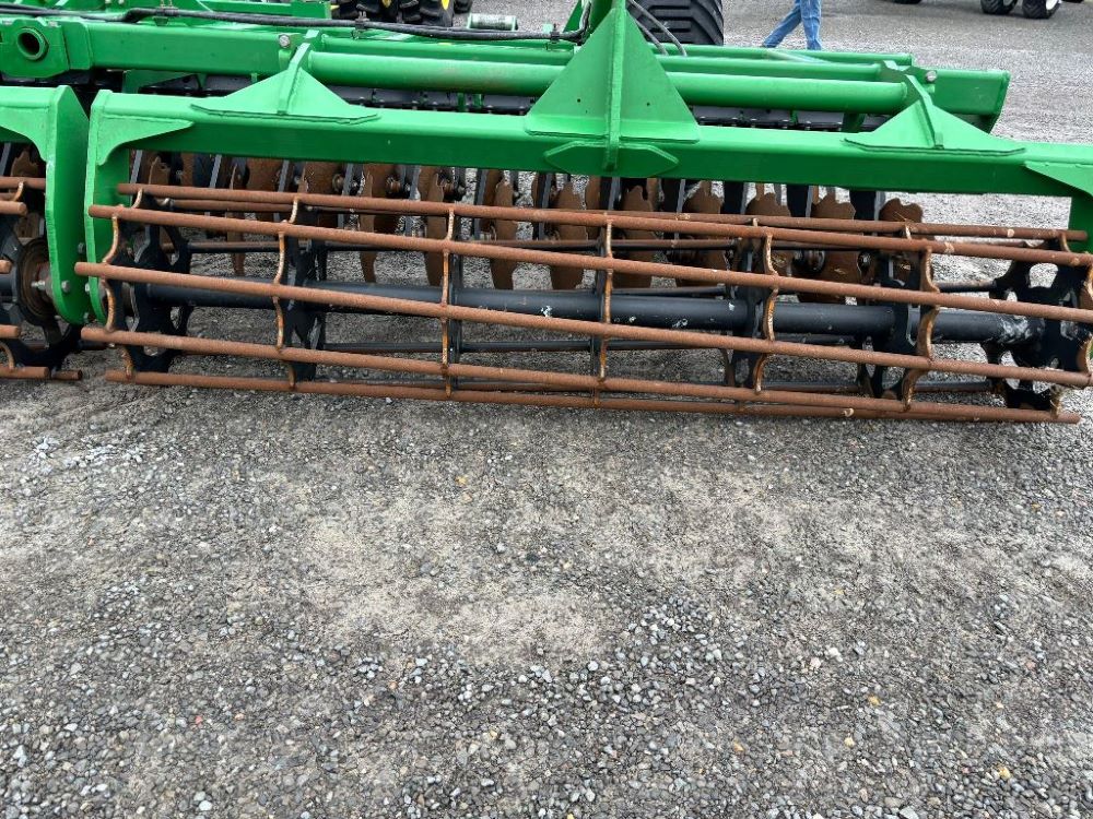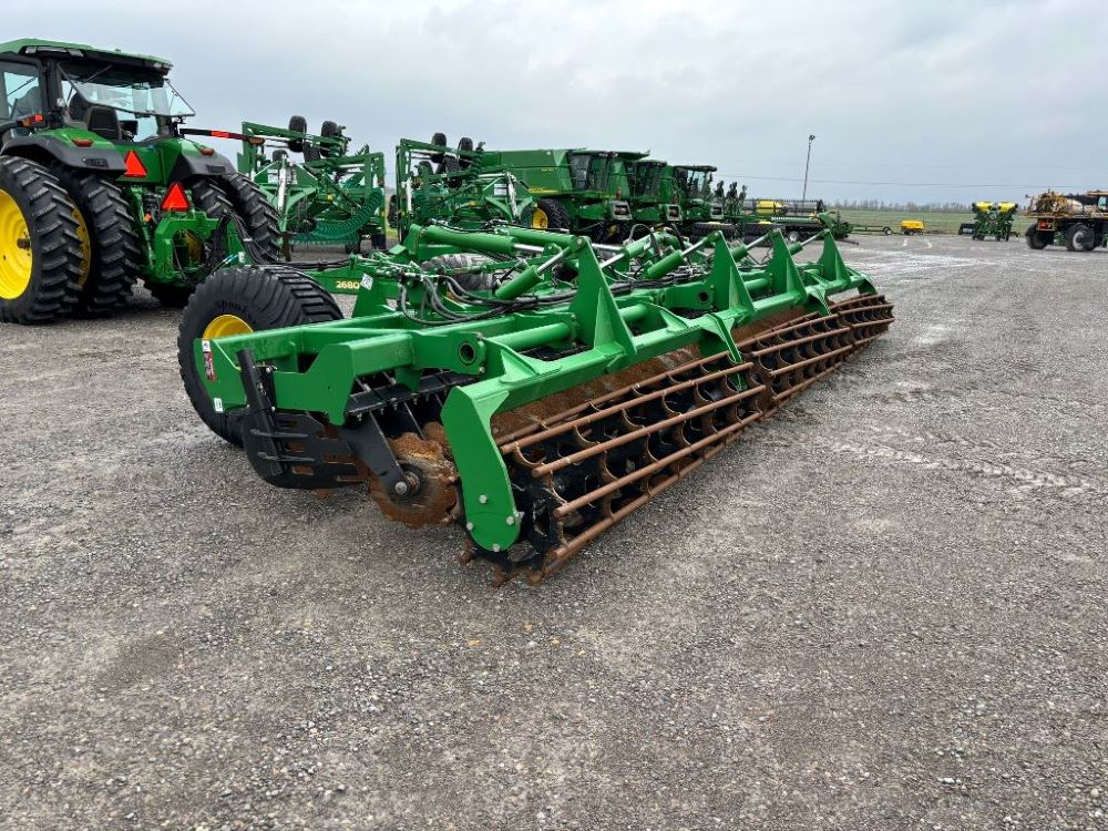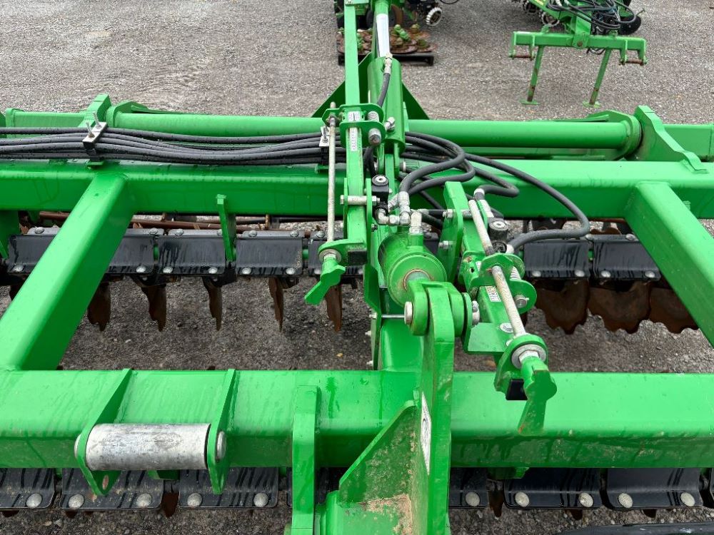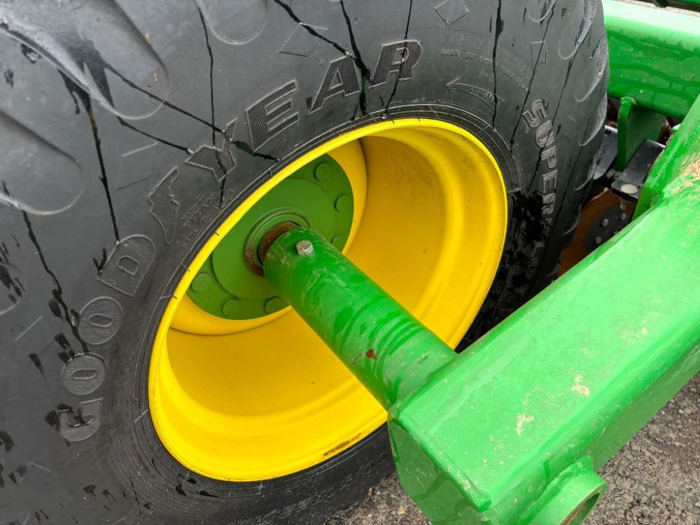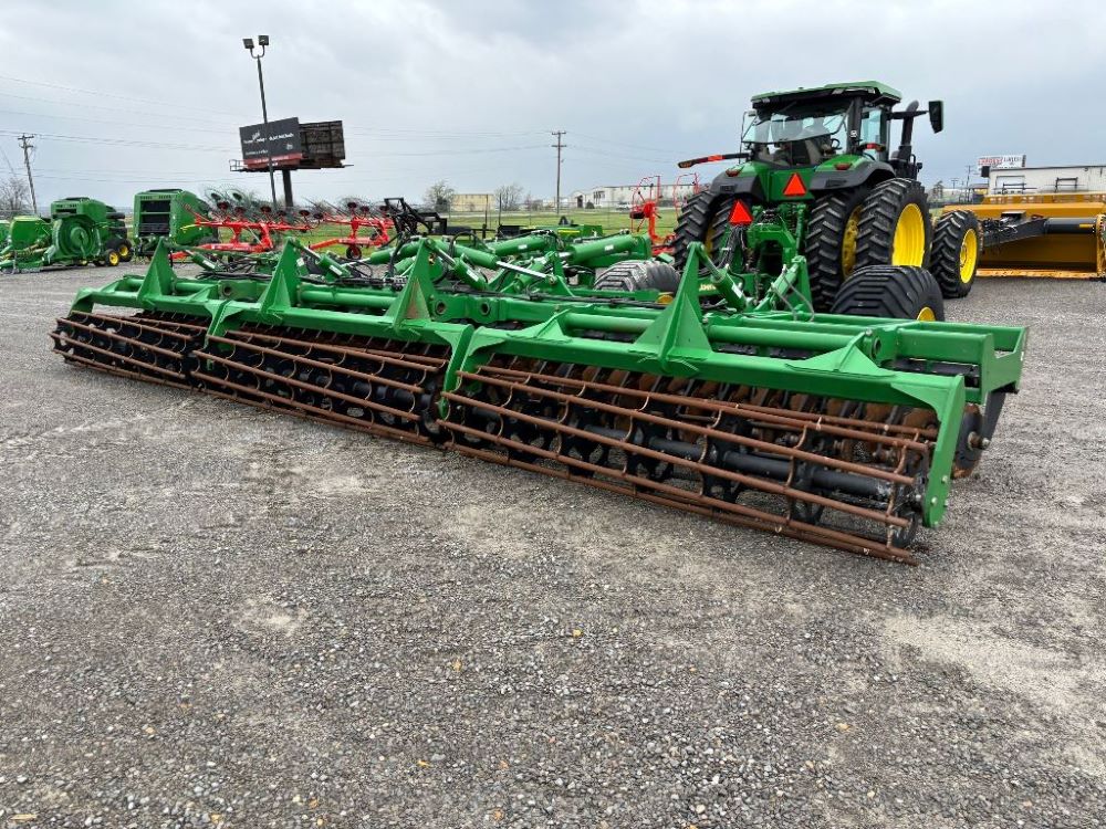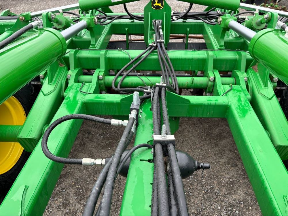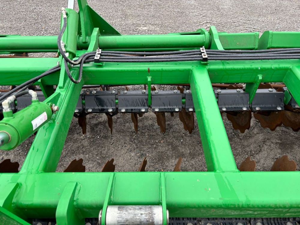 2022 John Deere 2680H High Performance Disk (GP6955), 30' working width, 3 section fold, 13' transport width, independent disk arms with compressed rubber cushion mounts, 20" notched front blades, 20" smooth rear blades, single point depth control, high speed capable up to 11.5MPH (41 acres/hour), 25.5" round bar cage rolling baskets, hydraulic tongue jack, ridge deflectors, Goodyear Superflot 600/50R22.5 tires, CAT 4 single tine hitch.