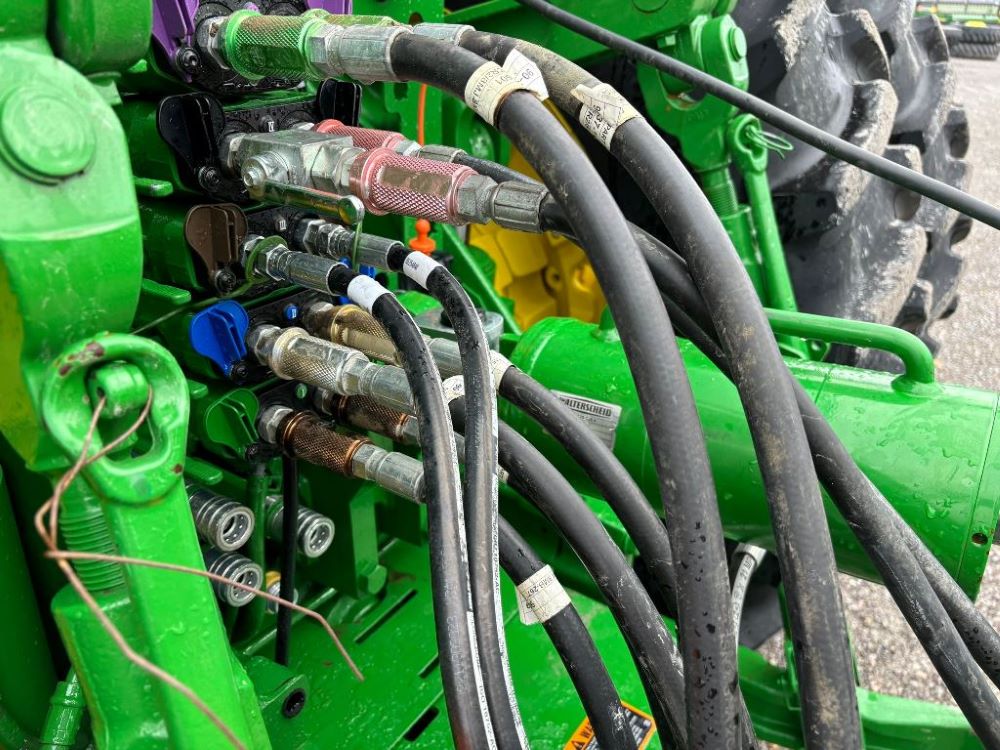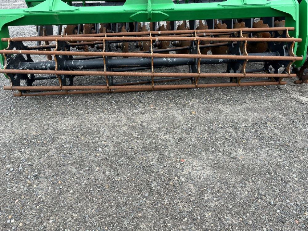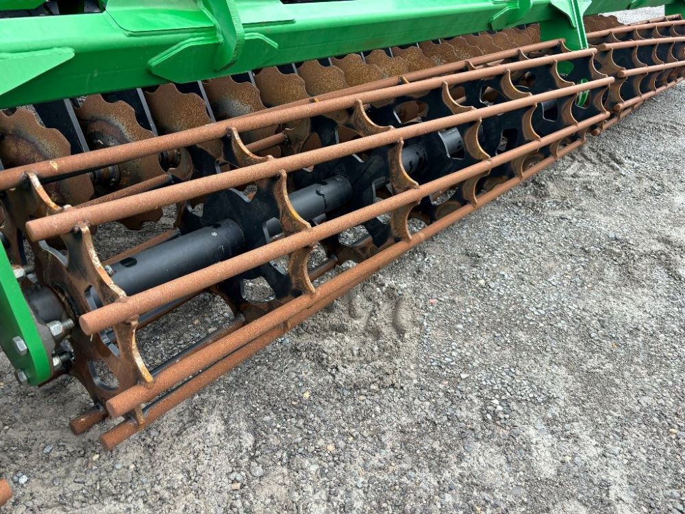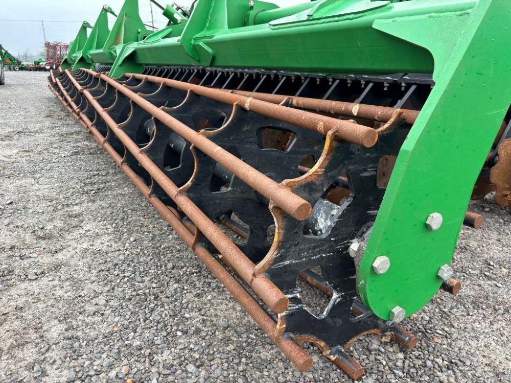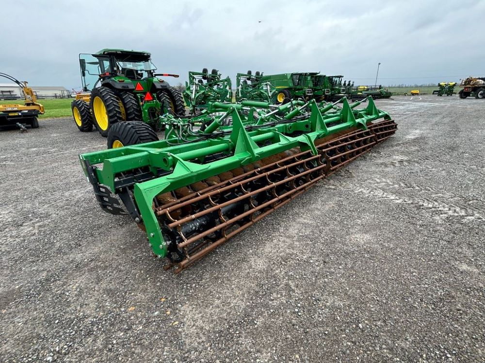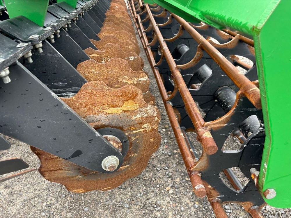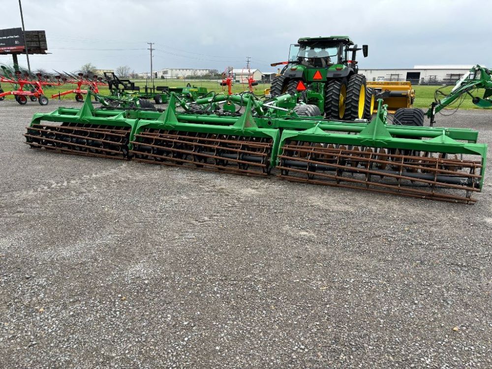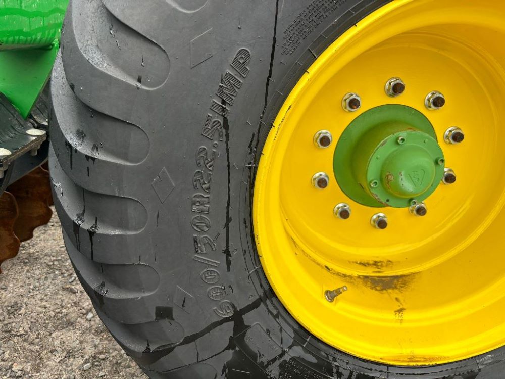 2022 John Deere 2680H High Performance Disk (GP6955), 30' working width, 3 section fold, 13' transport width, independent disk arms with compressed rubber cushion mounts, 20" notched front blades, 20" smooth rear blades, single point depth control, high speed capable up to 11.5MPH (41 acres/hour), 25.5" round bar cage rolling baskets, hydraulic tongue jack, ridge deflectors, Goodyear Superflot 600/50R22.5 tires, CAT 4 single tine hitch.