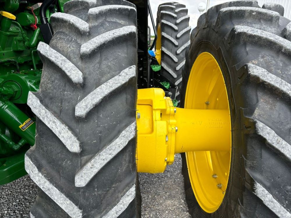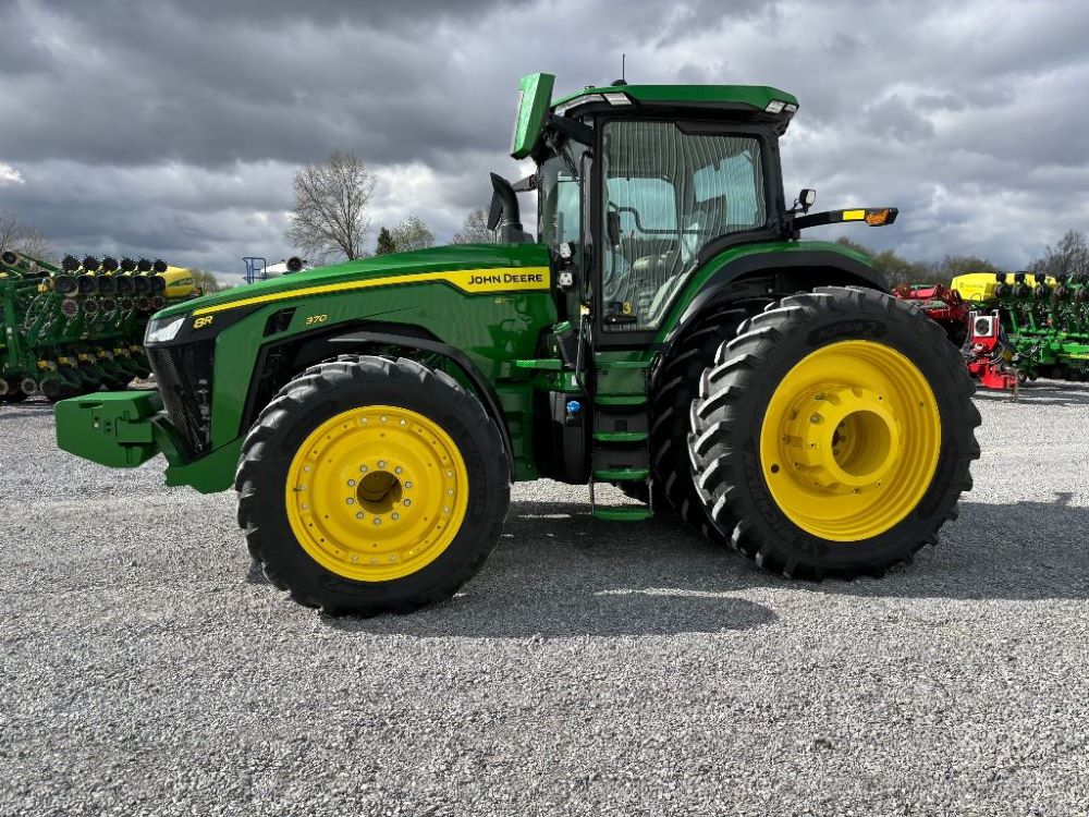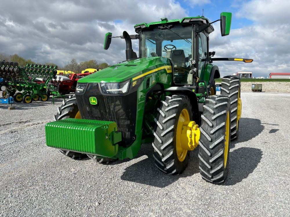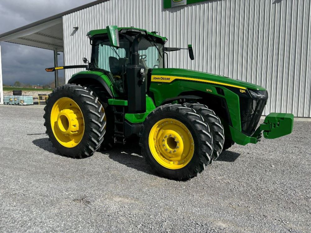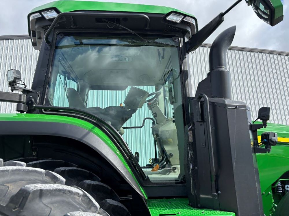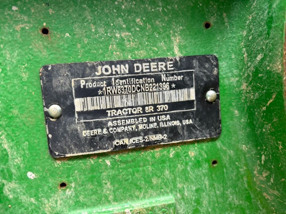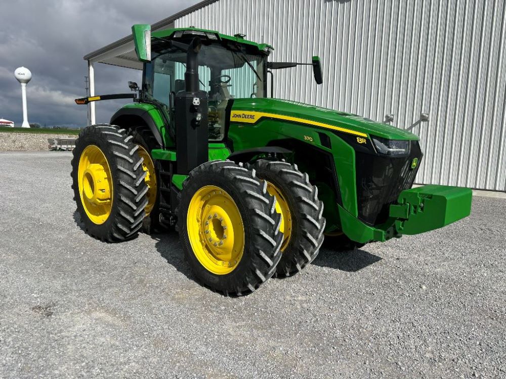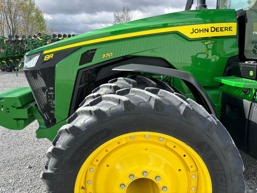 2023 John Deere 8R 370 MFWD Tractor (GP6973), John Deere 370HP 9.0L 6 cylinder diesel engine, signature edition, E23 Power Shift transmission with efficiency manager, right hand reverser with bump to shift controls, Premium cab with cab suspension, heat, air conditioning, Am/Fm radio, ultimate comfort and convenience package, premium leather air driver seat, leather buddy seat, hydraulic power steering, 84 GPM dual hydraulic pump, 5 rear remote hydraulic valves with ISO couplers and high pressure relief levers, 1000 PTO, CAT 4N three point quick hitch with quick coupler, CAT 4 draw bar with HD support, aux case drain coupler, power beyond pressure coupler, load sense coupler, rear differential lock, ILS MFWD front axle dual ready with hydraulic differential lock, (22) front suitcase weights, Michelin 380/80R38 front duals, Michelin 480/80R50 rear duals, Gen 4, 4600 command center (10") color display with automation 4.0 activation for auto-trac, turn automation, implement guidance, senction control, RowSense, data sync & data share (requires JD global position receiver which is NOT included), JD Link MTG, shows 338 hours.