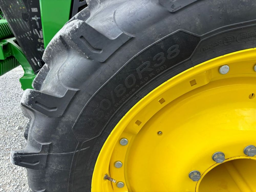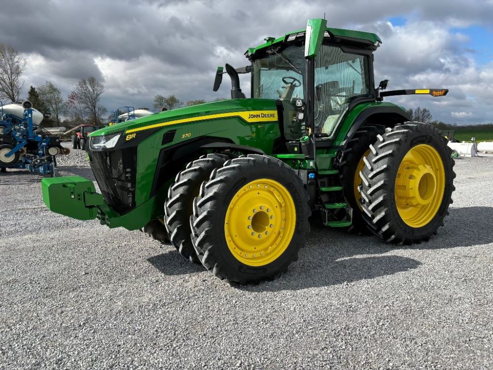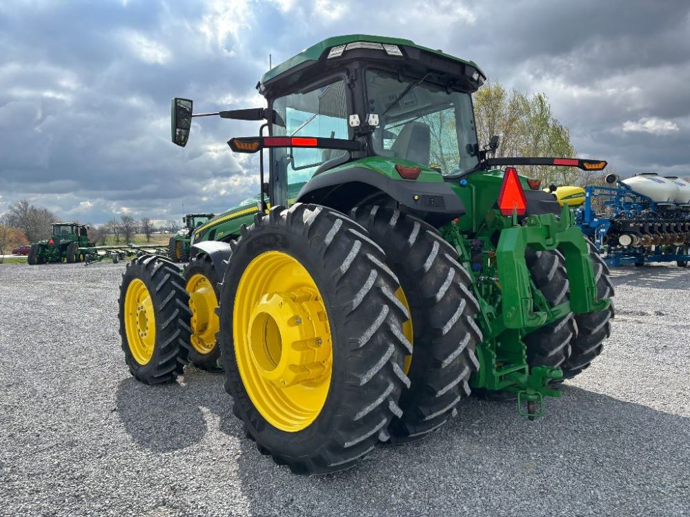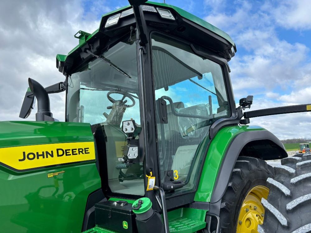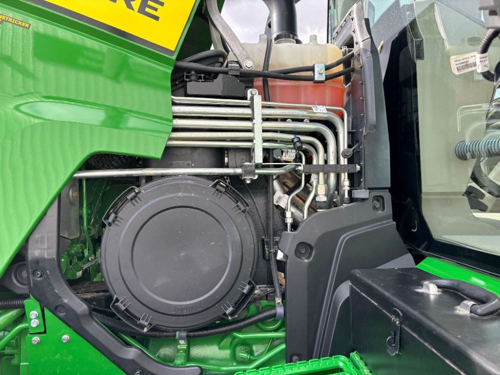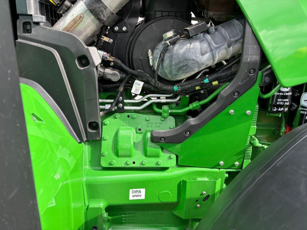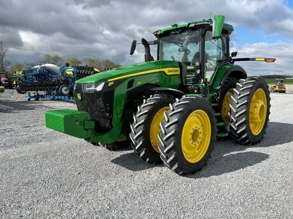 2023 John Deere 8R 370 MFWD Tractor (GP6973), John Deere 370HP 9.0L 6 cylinder diesel engine, signature edition, E23 Power Shift transmission with efficiency manager, right hand reverser with bump to shift controls, Premium cab with cab suspension, heat, air conditioning, Am/Fm radio, ultimate comfort and convenience package, premium leather air driver seat, leather buddy seat, hydraulic power steering, 84 GPM dual hydraulic pump, 5 rear remote hydraulic valves with ISO couplers and high pressure relief levers, 1000 PTO, CAT 4N three point quick hitch with quick coupler, CAT 4 draw bar with HD support, aux case drain coupler, power beyond pressure coupler, load sense coupler, rear differential lock, ILS MFWD front axle dual ready with hydraulic differential lock, (22) front suitcase weights, Michelin 380/80R38 front duals, Michelin 480/80R50 rear duals, Gen 4, 4600 command center (10") color display with automation 4.0 activation for auto-trac, turn automation, implement guidance, senction control, RowSense, data sync & data share (requires JD global position receiver which is NOT included), JD Link MTG, shows 338 hours.