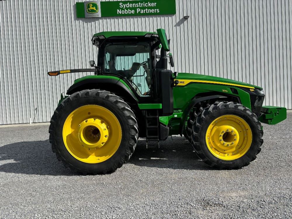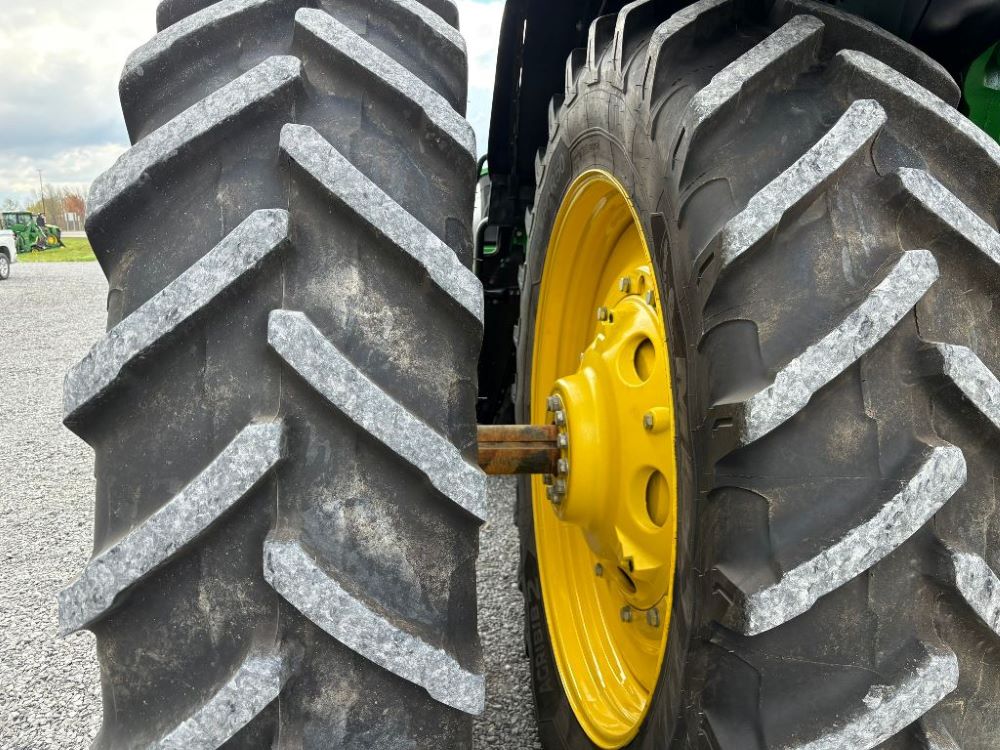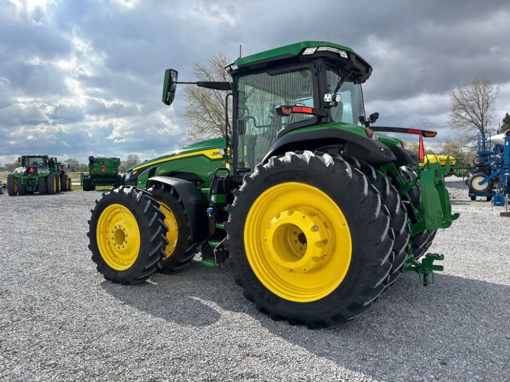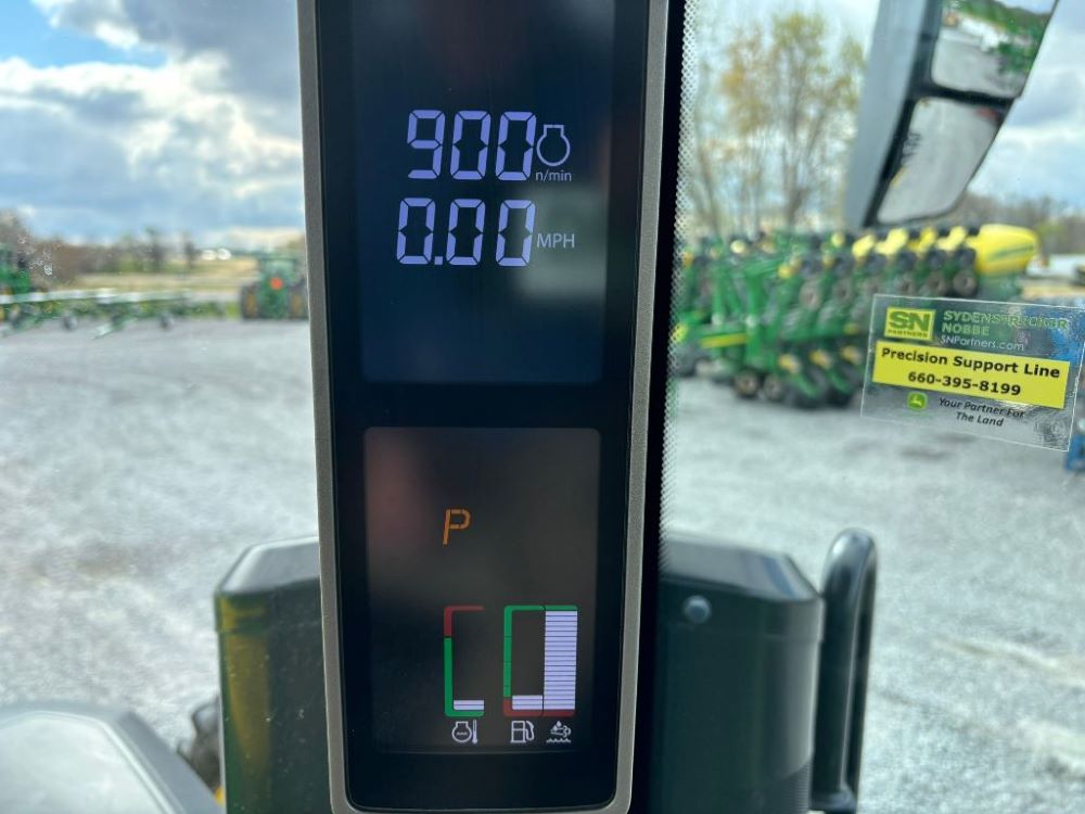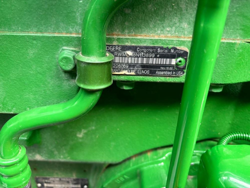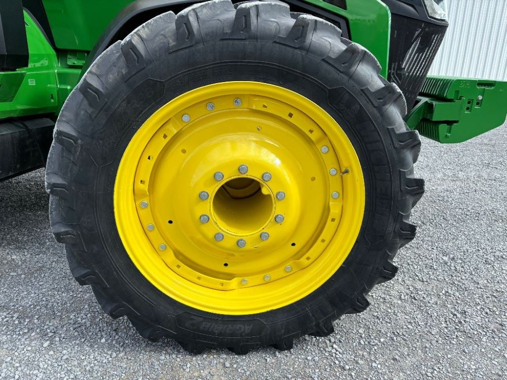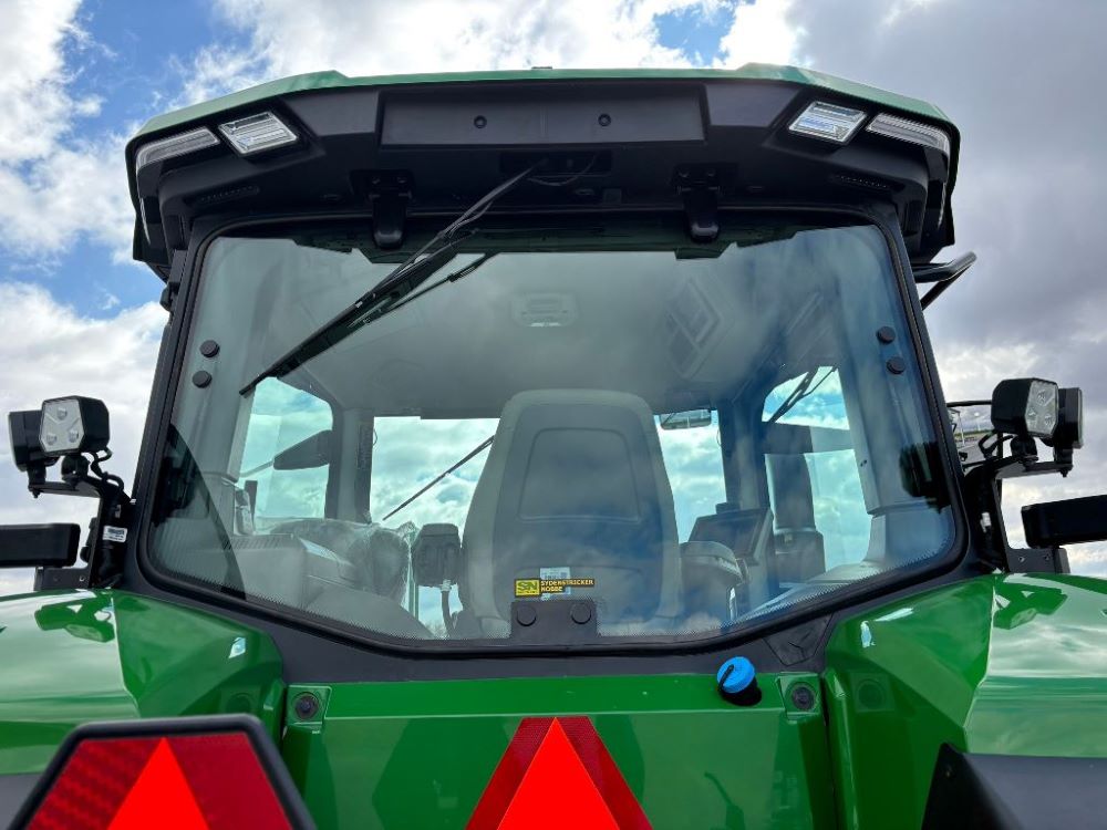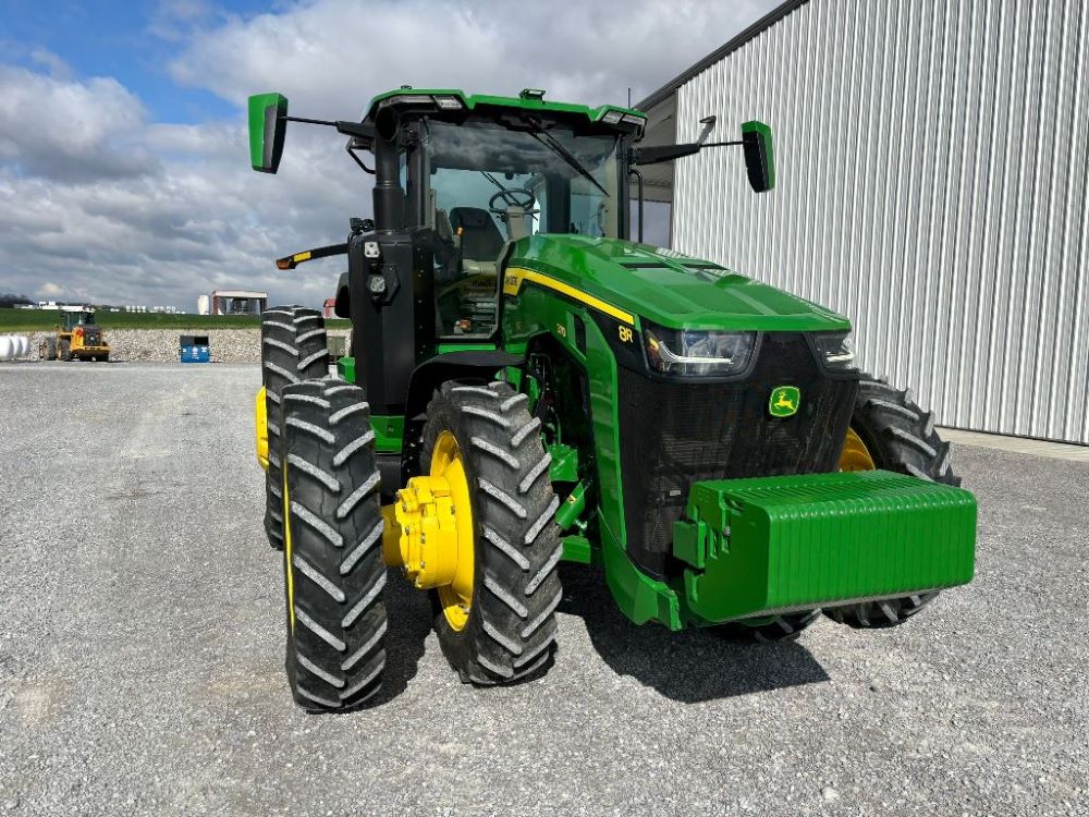 2023 John Deere 8R 370 MFWD Tractor (GP6973), John Deere 370HP 9.0L 6 cylinder diesel engine, signature edition, E23 Power Shift transmission with efficiency manager, right hand reverser with bump to shift controls, Premium cab with cab suspension, heat, air conditioning, Am/Fm radio, ultimate comfort and convenience package, premium leather air driver seat, leather buddy seat, hydraulic power steering, 84 GPM dual hydraulic pump, 5 rear remote hydraulic valves with ISO couplers and high pressure relief levers, 1000 PTO, CAT 4N three point quick hitch with quick coupler, CAT 4 draw bar with HD support, aux case drain coupler, power beyond pressure coupler, load sense coupler, rear differential lock, ILS MFWD front axle dual ready with hydraulic differential lock, (22) front suitcase weights, Michelin 380/80R38 front duals, Michelin 480/80R50 rear duals, Gen 4, 4600 command center (10") color display with automation 4.0 activation for auto-trac, turn automation, implement guidance, senction control, RowSense, data sync & data share (requires JD global position receiver which is NOT included), JD Link MTG, shows 338 hours.