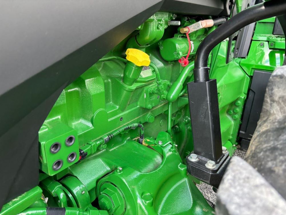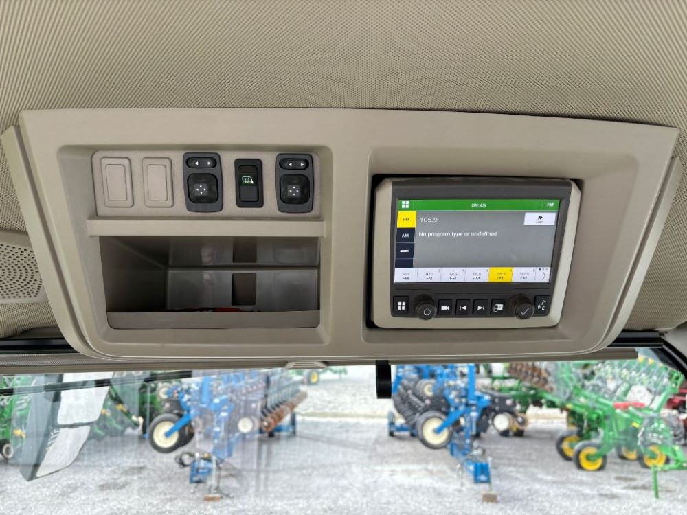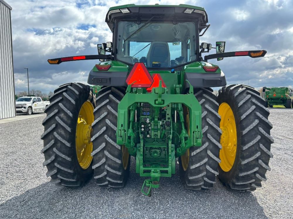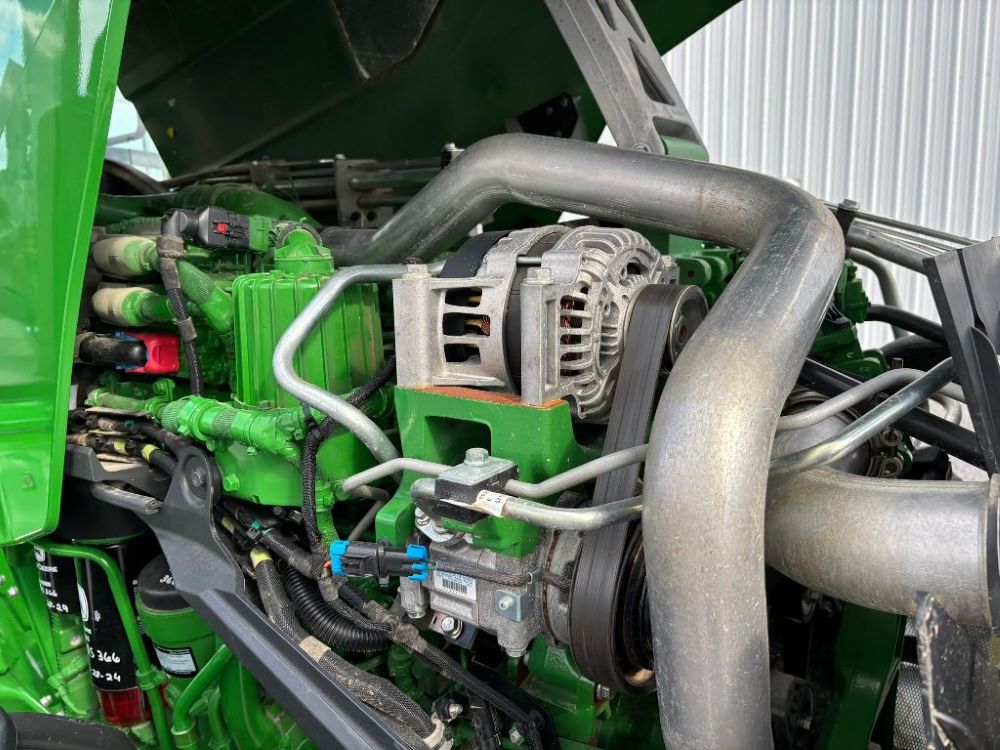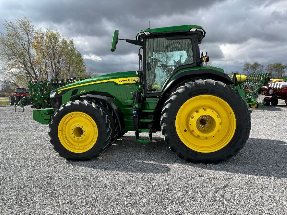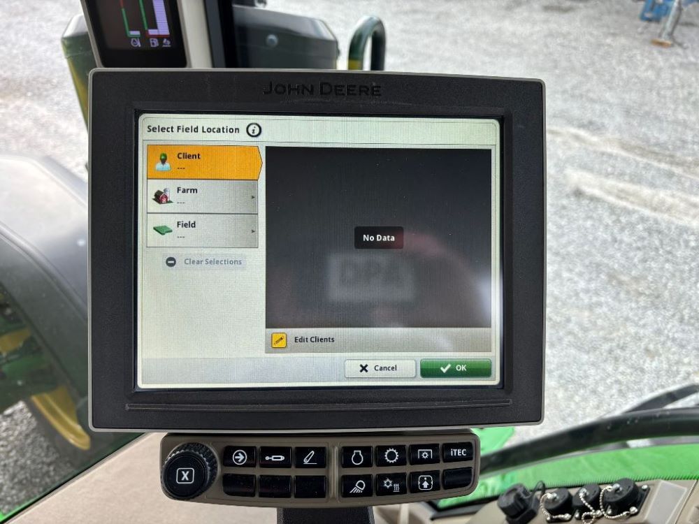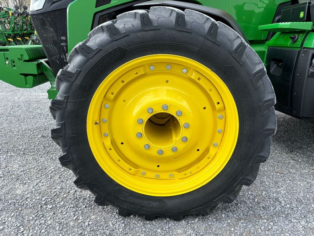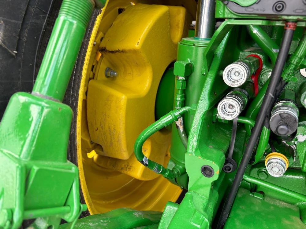 2023 John Deere 8R 370 MFWD Tractor (GP6973), John Deere 370HP 9.0L 6 cylinder diesel engine, signature edition, E23 Power Shift transmission with efficiency manager, right hand reverser with bump to shift controls, Premium cab with cab suspension, heat, air conditioning, Am/Fm radio, ultimate comfort and convenience package, premium leather air driver seat, leather buddy seat, hydraulic power steering, 84 GPM dual hydraulic pump, 5 rear remote hydraulic valves with ISO couplers and high pressure relief levers, 1000 PTO, CAT 4N three point quick hitch with quick coupler, CAT 4 draw bar with HD support, aux case drain coupler, power beyond pressure coupler, load sense coupler, rear differential lock, ILS MFWD front axle dual ready with hydraulic differential lock, (22) front suitcase weights, Michelin 380/80R38 front duals, Michelin 480/80R50 rear duals, Gen 4, 4600 command center (10") color display with automation 4.0 activation for auto-trac, turn automation, implement guidance, senction control, RowSense, data sync & data share (requires JD global position receiver which is NOT included), JD Link MTG, shows 338 hours.