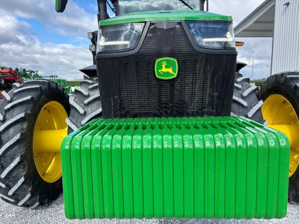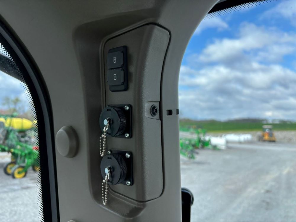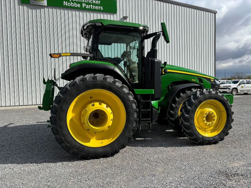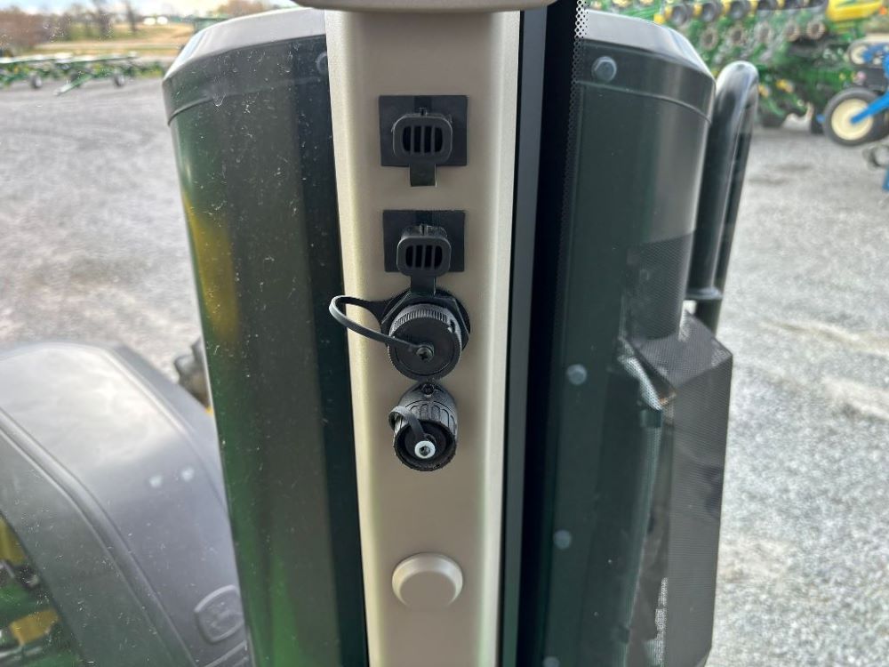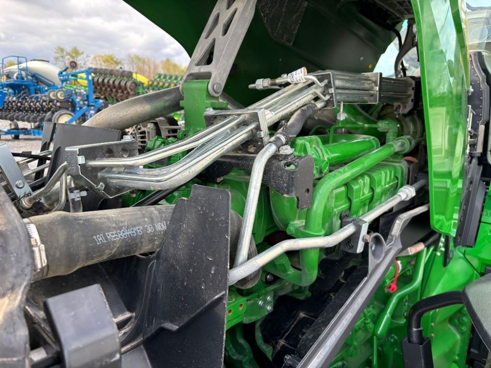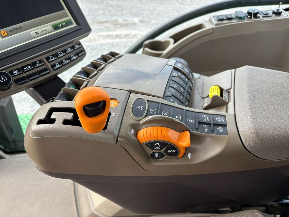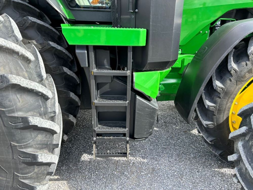 2023 John Deere 8R 370 MFWD Tractor (GP6973), John Deere 370HP 9.0L 6 cylinder diesel engine, signature edition, E23 Power Shift transmission with efficiency manager, right hand reverser with bump to shift controls, Premium cab with cab suspension, heat, air conditioning, Am/Fm radio, ultimate comfort and convenience package, premium leather air driver seat, leather buddy seat, hydraulic power steering, 84 GPM dual hydraulic pump, 5 rear remote hydraulic valves with ISO couplers and high pressure relief levers, 1000 PTO, CAT 4N three point quick hitch with quick coupler, CAT 4 draw bar with HD support, aux case drain coupler, power beyond pressure coupler, load sense coupler, rear differential lock, ILS MFWD front axle dual ready with hydraulic differential lock, (22) front suitcase weights, Michelin 380/80R38 front duals, Michelin 480/80R50 rear duals, Gen 4, 4600 command center (10") color display with automation 4.0 activation for auto-trac, turn automation, implement guidance, senction control, RowSense, data sync & data share (requires JD global position receiver which is NOT included), JD Link MTG, shows 338 hours.