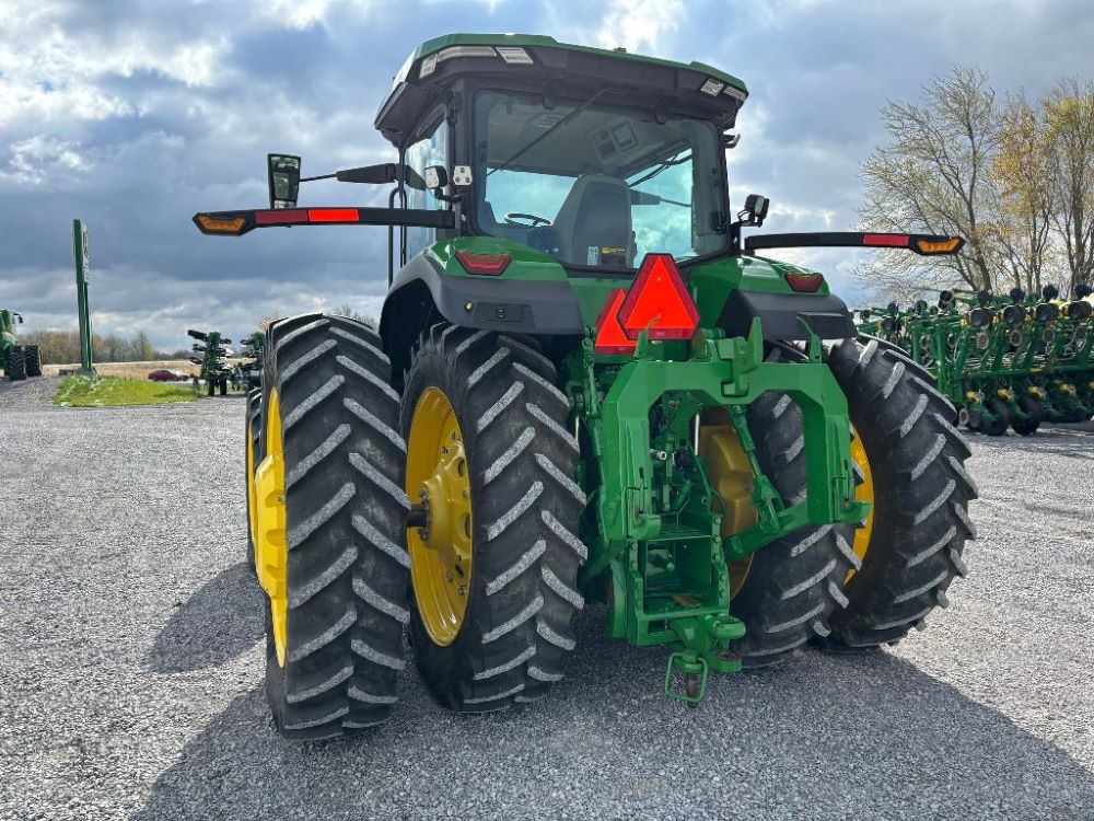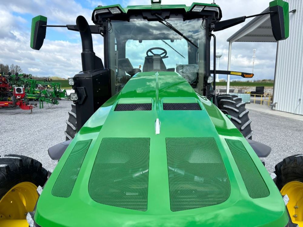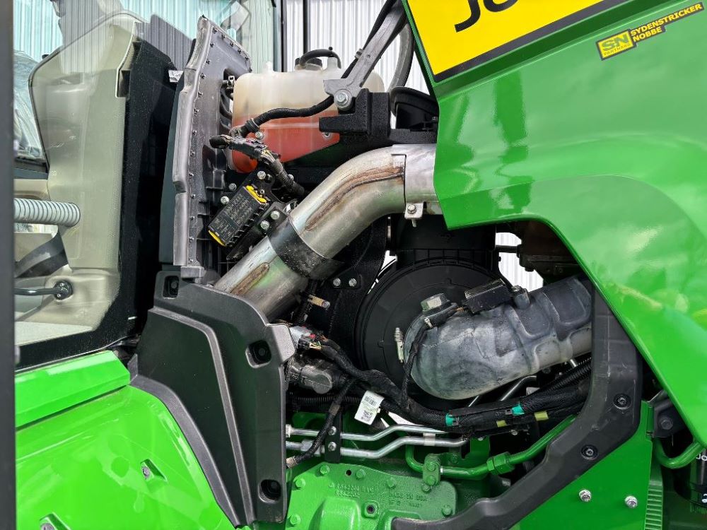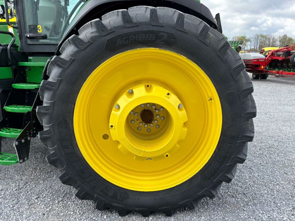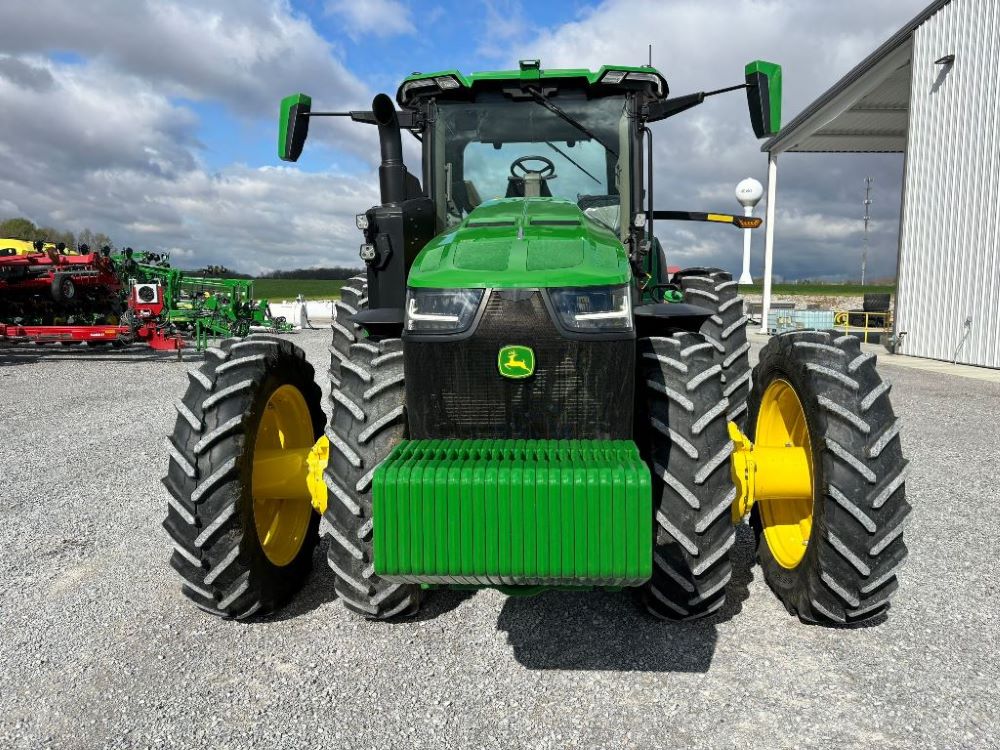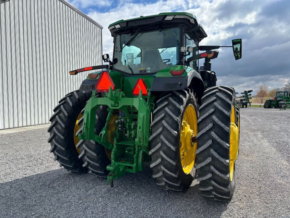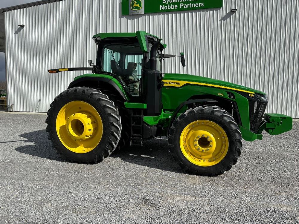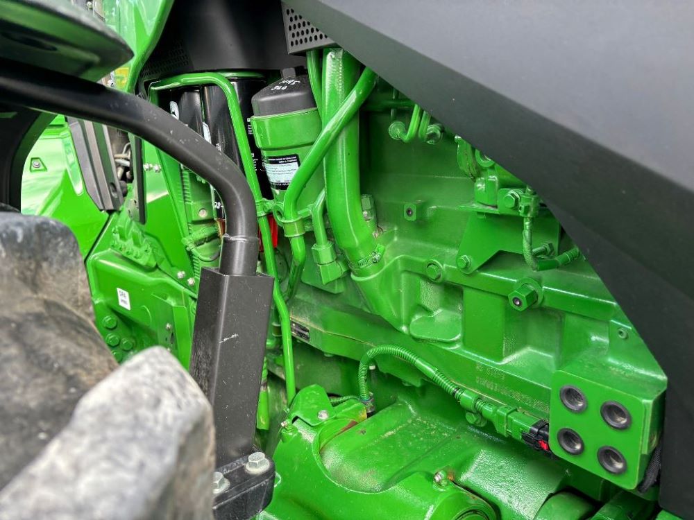 2023 John Deere 8R 370 MFWD Tractor (GP6973), John Deere 370HP 9.0L 6 cylinder diesel engine, signature edition, E23 Power Shift transmission with efficiency manager, right hand reverser with bump to shift controls, Premium cab with cab suspension, heat, air conditioning, Am/Fm radio, ultimate comfort and convenience package, premium leather air driver seat, leather buddy seat, hydraulic power steering, 84 GPM dual hydraulic pump, 5 rear remote hydraulic valves with ISO couplers and high pressure relief levers, 1000 PTO, CAT 4N three point quick hitch with quick coupler, CAT 4 draw bar with HD support, aux case drain coupler, power beyond pressure coupler, load sense coupler, rear differential lock, ILS MFWD front axle dual ready with hydraulic differential lock, (22) front suitcase weights, Michelin 380/80R38 front duals, Michelin 480/80R50 rear duals, Gen 4, 4600 command center (10") color display with automation 4.0 activation for auto-trac, turn automation, implement guidance, senction control, RowSense, data sync & data share (requires JD global position receiver which is NOT included), JD Link MTG, shows 338 hours.