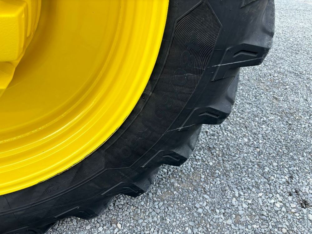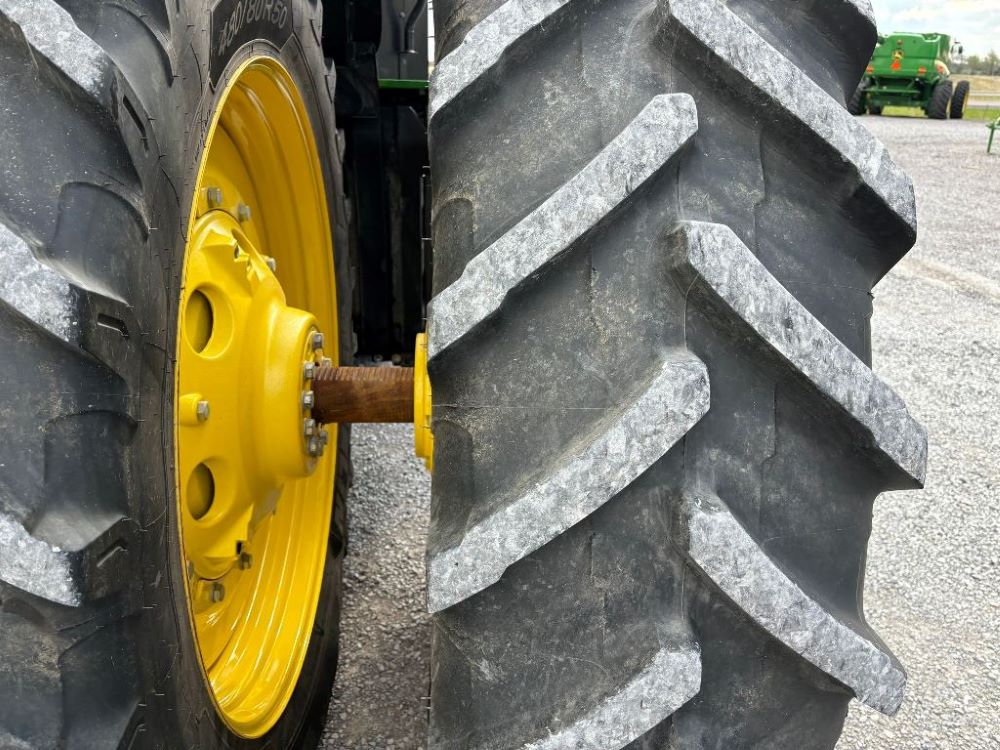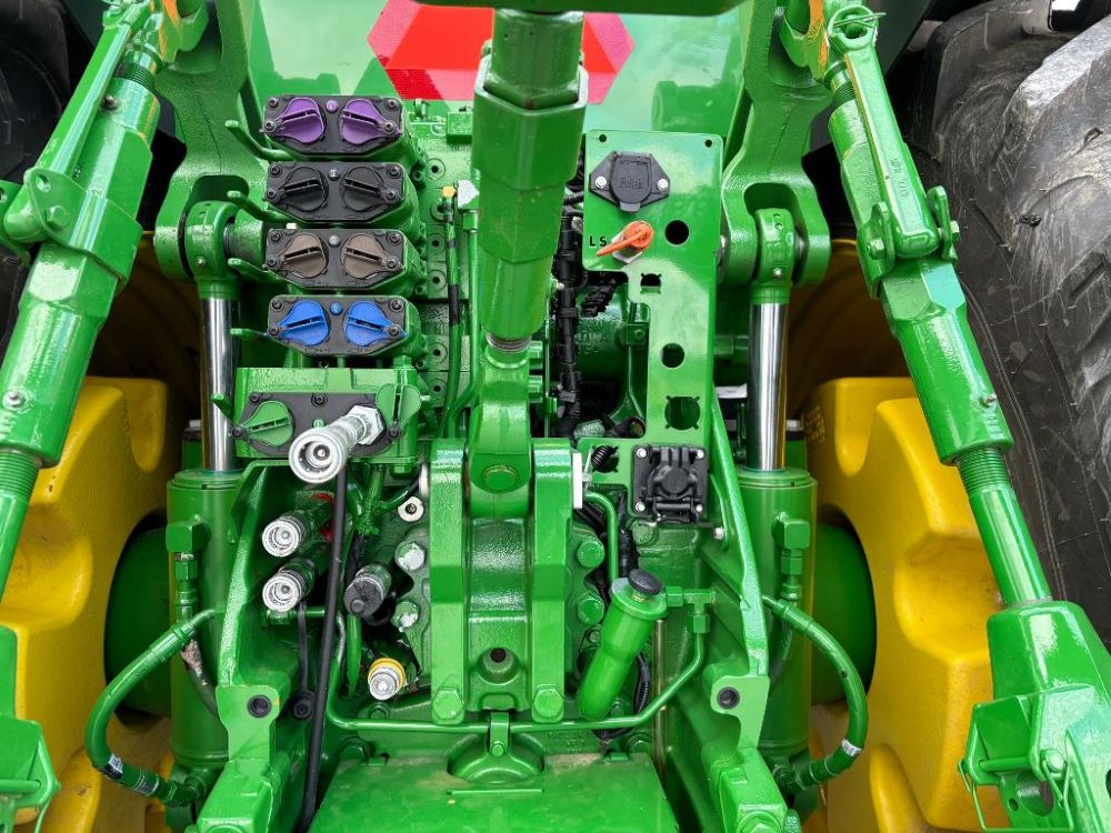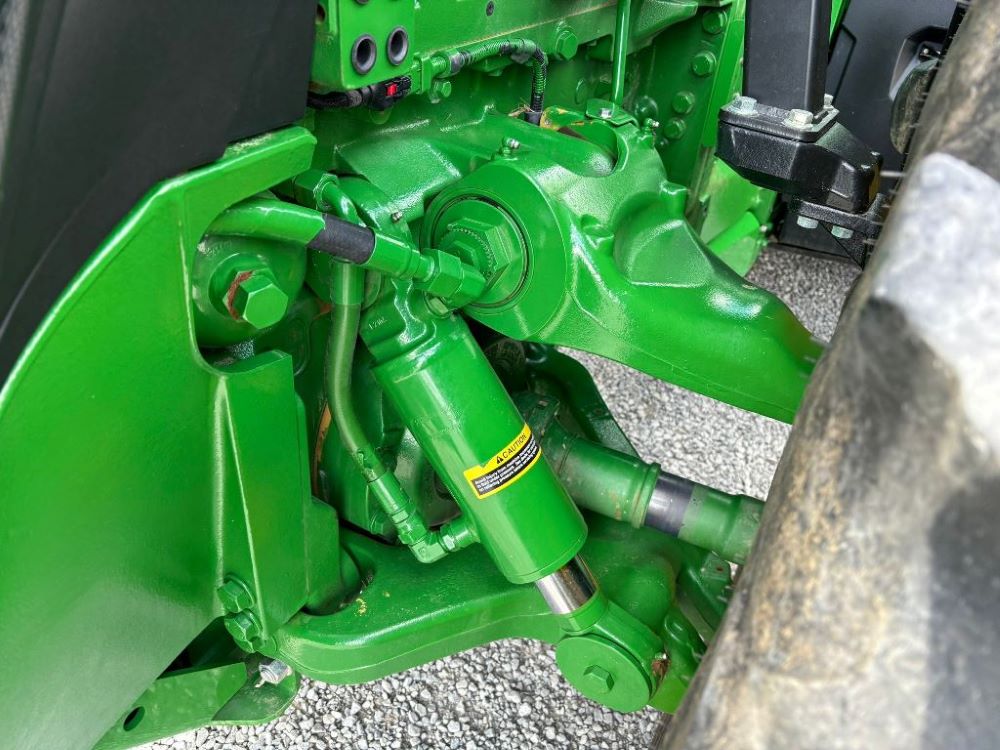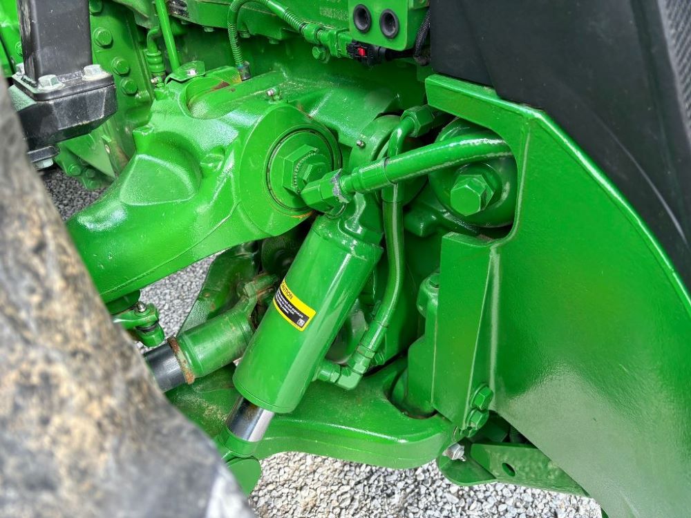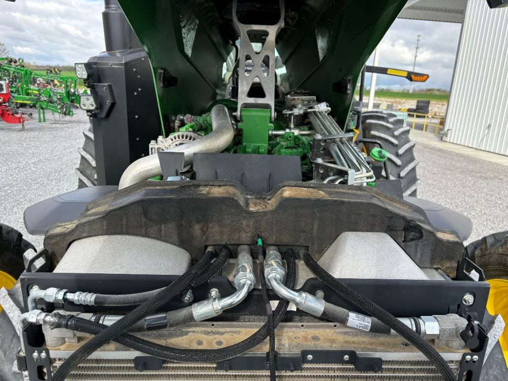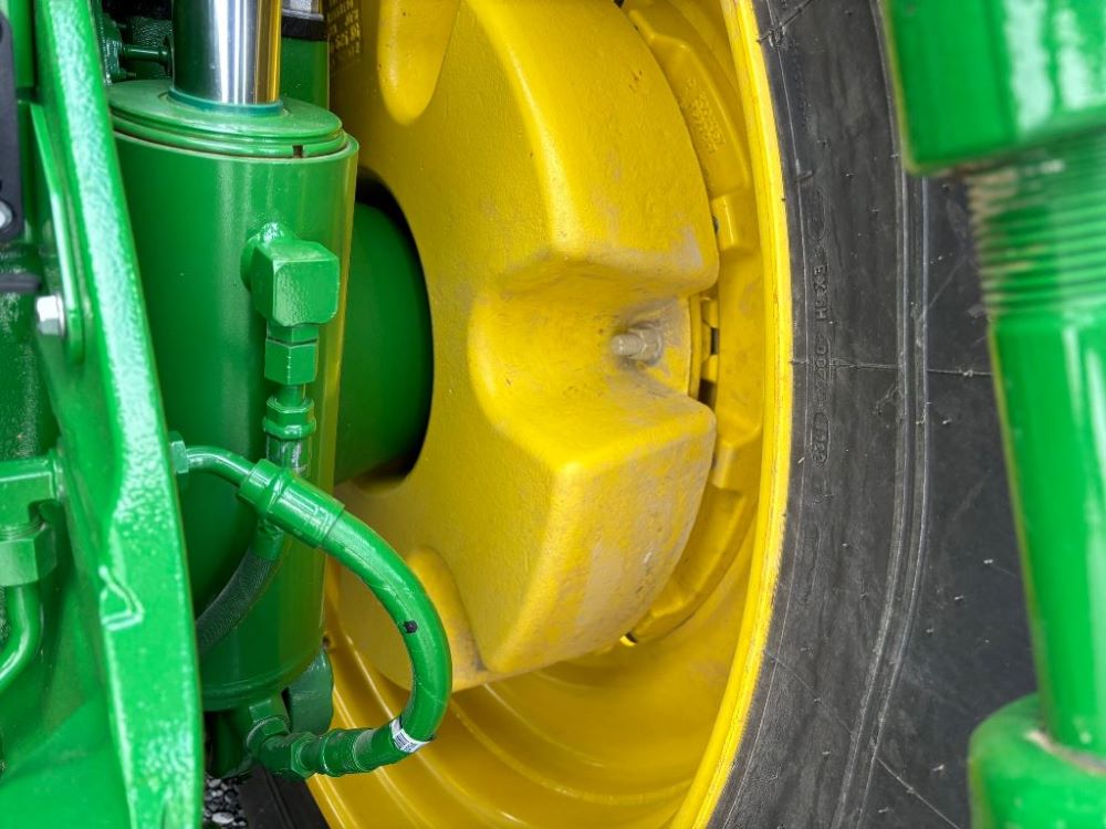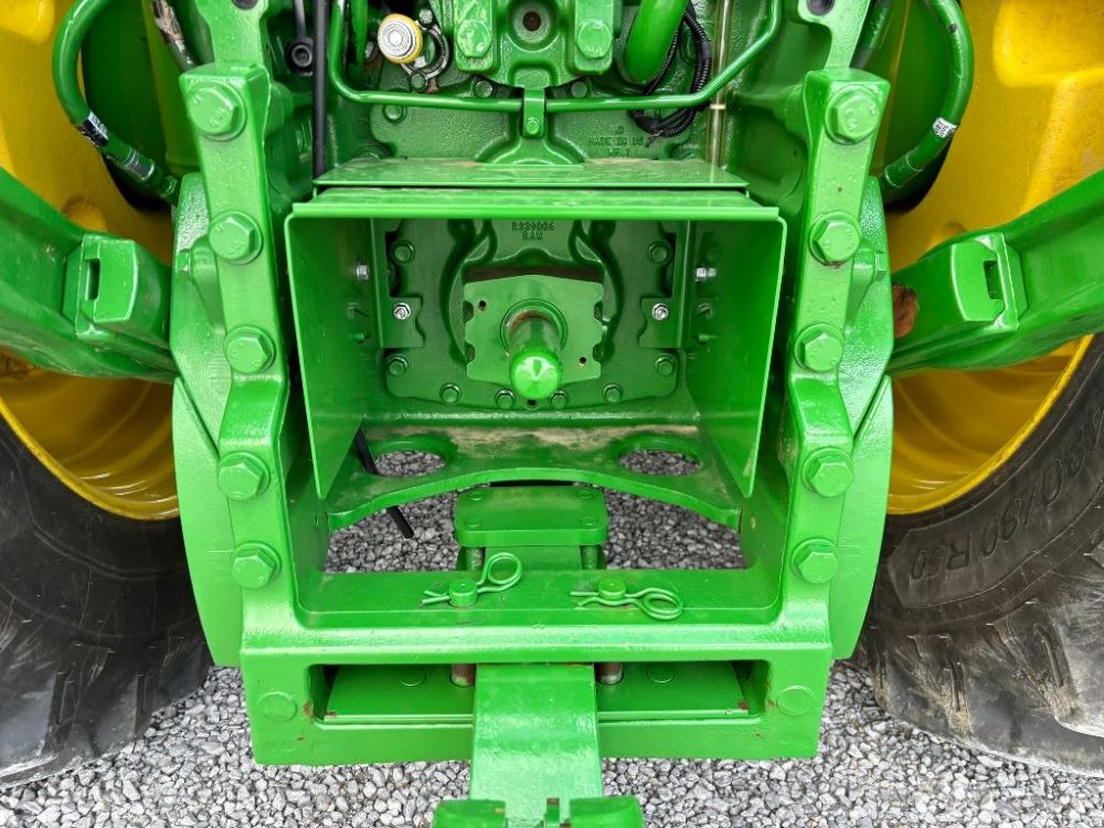 2023 John Deere 8R 370 MFWD Tractor (GP6973), John Deere 370HP 9.0L 6 cylinder diesel engine, signature edition, E23 Power Shift transmission with efficiency manager, right hand reverser with bump to shift controls, Premium cab with cab suspension, heat, air conditioning, Am/Fm radio, ultimate comfort and convenience package, premium leather air driver seat, leather buddy seat, hydraulic power steering, 84 GPM dual hydraulic pump, 5 rear remote hydraulic valves with ISO couplers and high pressure relief levers, 1000 PTO, CAT 4N three point quick hitch with quick coupler, CAT 4 draw bar with HD support, aux case drain coupler, power beyond pressure coupler, load sense coupler, rear differential lock, ILS MFWD front axle dual ready with hydraulic differential lock, (22) front suitcase weights, Michelin 380/80R38 front duals, Michelin 480/80R50 rear duals, Gen 4, 4600 command center (10") color display with automation 4.0 activation for auto-trac, turn automation, implement guidance, senction control, RowSense, data sync & data share (requires JD global position receiver which is NOT included), JD Link MTG, shows 338 hours.