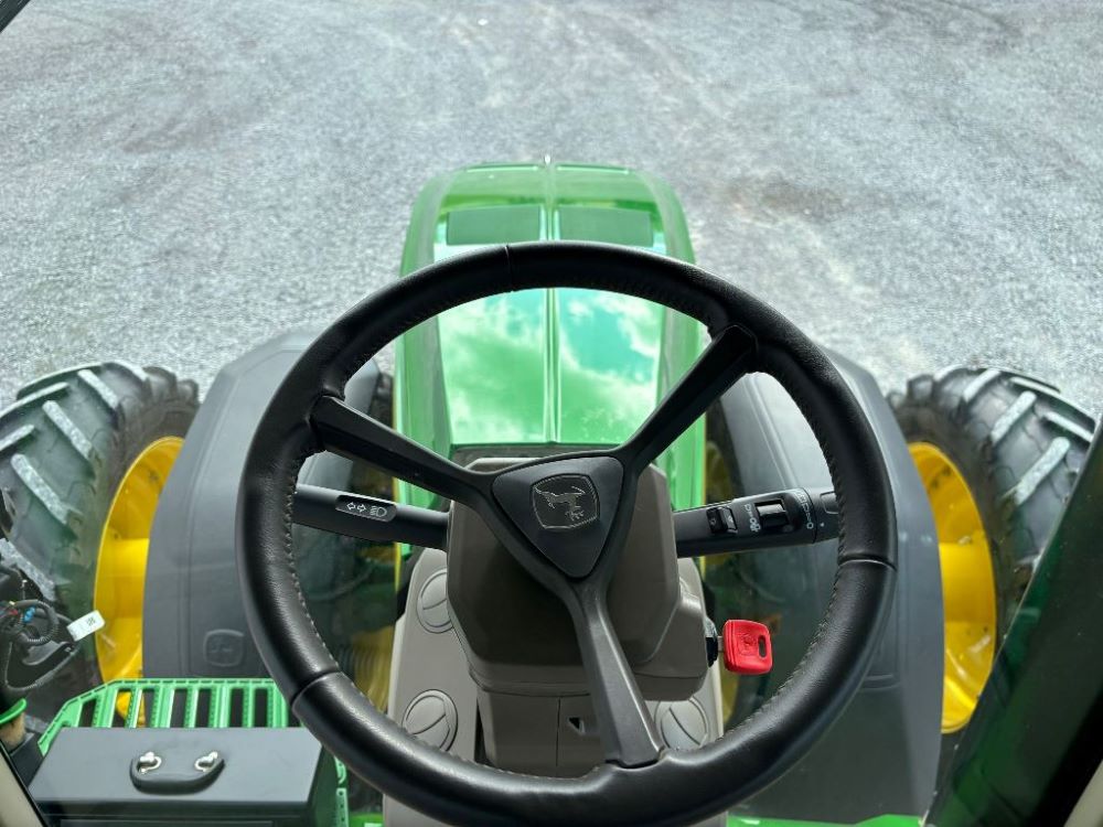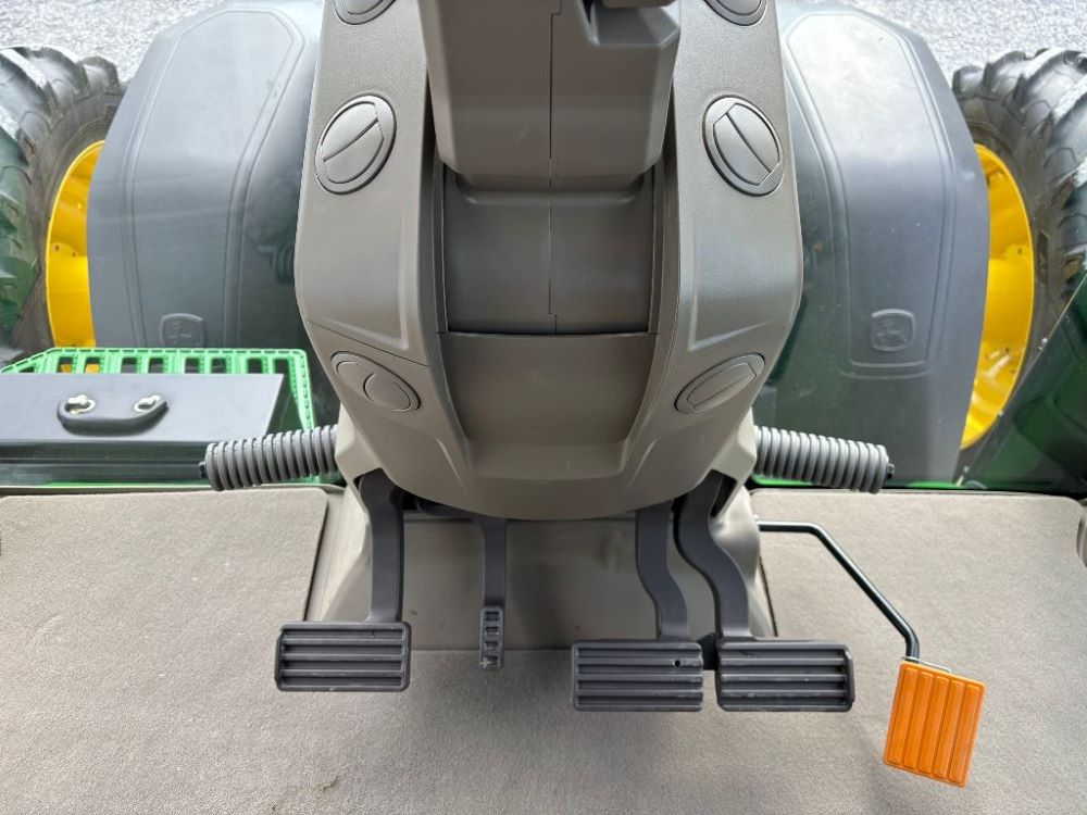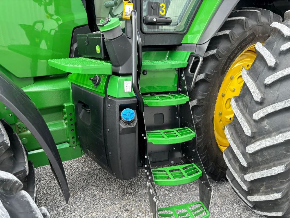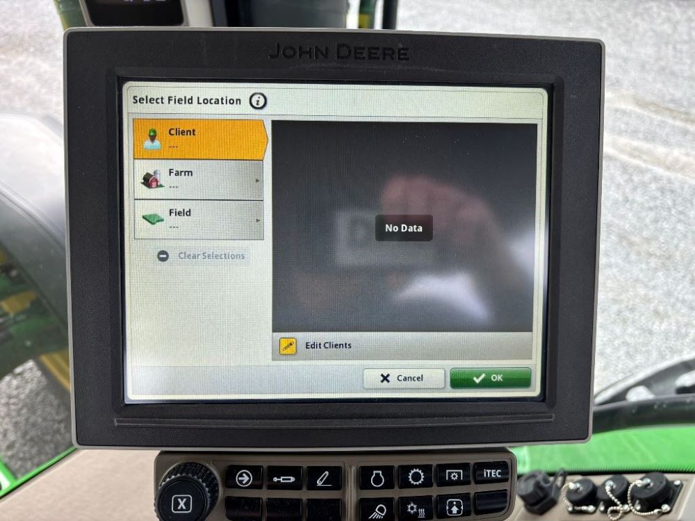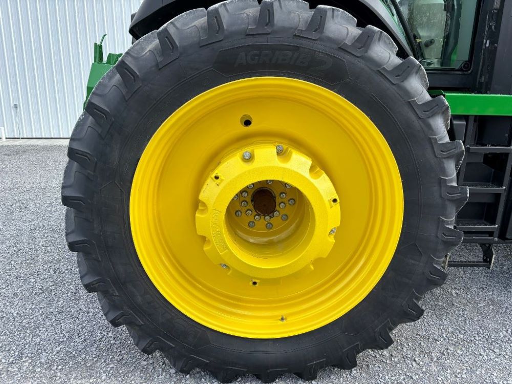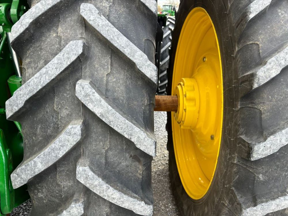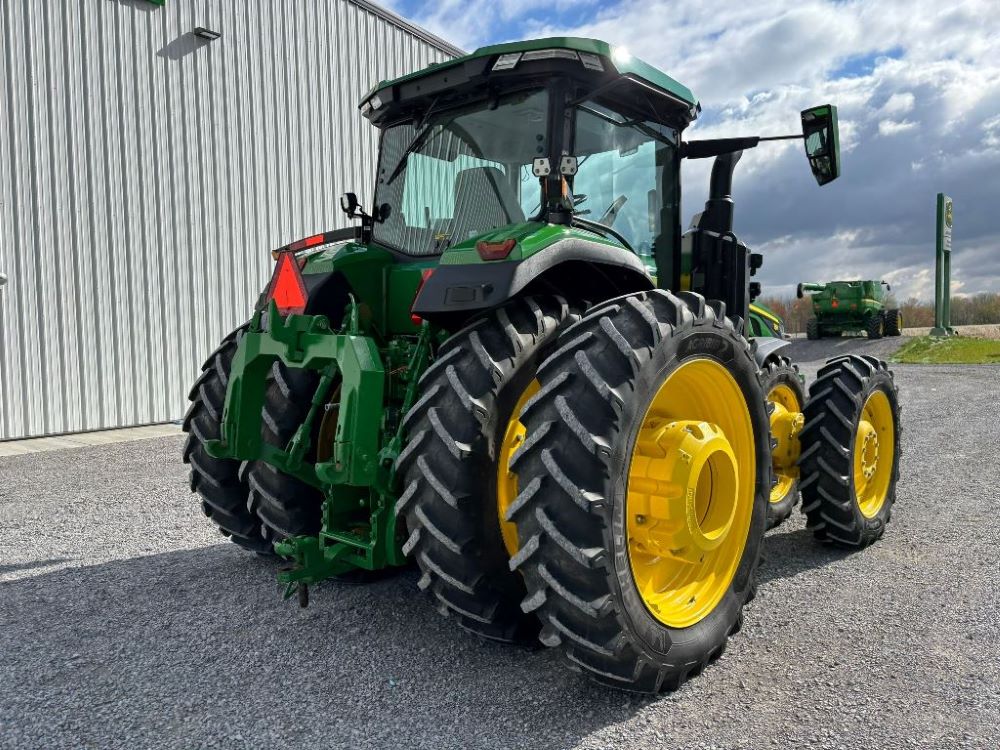2023 John Deere 8R 370 MFWD Tractor (GP6973), John Deere 370HP 9.0L 6 cylinder diesel engine, signature edition, E23 Power Shift transmission with efficiency manager, right hand reverser with bump to shift controls, Premium cab with cab suspension, heat, air conditioning, Am/Fm radio, ultimate comfort and convenience package, premium leather air driver seat, leather buddy seat, hydraulic power steering, 84 GPM dual hydraulic pump, 5 rear remote hydraulic valves with ISO couplers and high pressure relief levers, 1000 PTO, CAT 4N three point quick hitch with quick coupler, CAT 4 draw bar with HD support, aux case drain coupler, power beyond pressure coupler, load sense coupler, rear differential lock, ILS MFWD front axle dual ready with hydraulic differential lock, (22) front suitcase weights, Michelin 380/80R38 front duals, Michelin 480/80R50 rear duals, Gen 4, 4600 command center (10") color display with automation 4.0 activation for auto-trac, turn automation, implement guidance, senction control, RowSense, data sync & data share (requires JD global position receiver which is NOT included), JD Link MTG, shows 338 hours.
