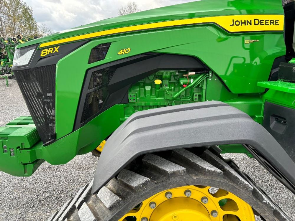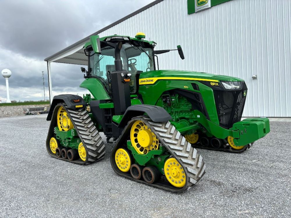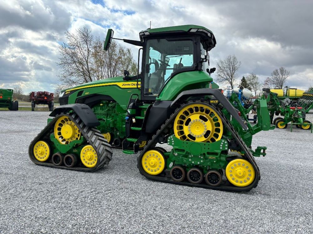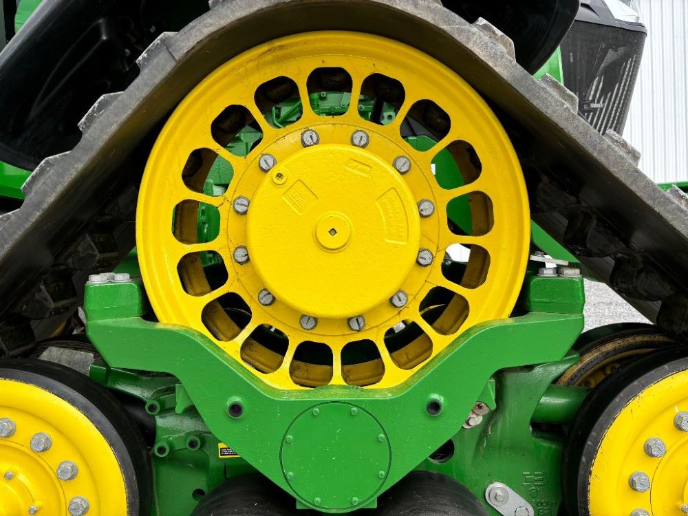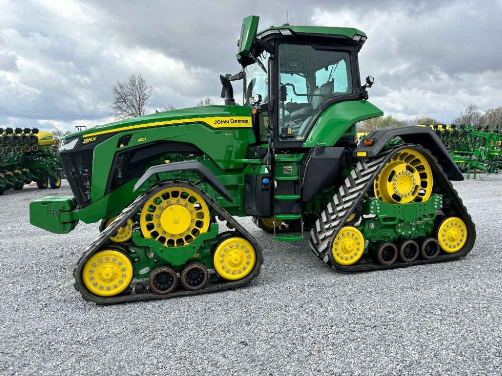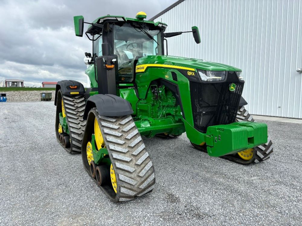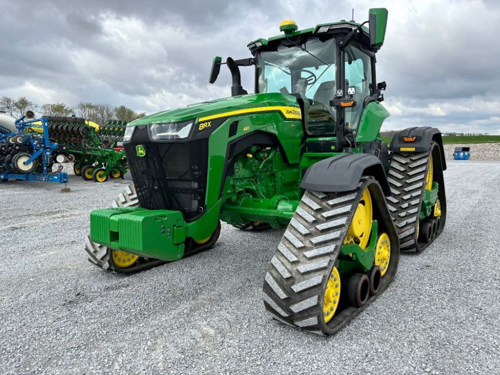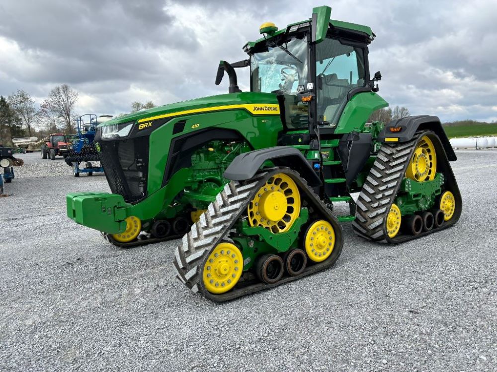 2023 John Deere 8RX 410 Tractor (GP6972), John Deere diesel engine, signature edition E23 transmission, right hand reverser with bump to shift controls, leather air drivers seat, leather buddy seat, cab suspension, CAMSO 24" tracks, 120" tread spacing, 5 port hydraulic outlets, 1000 PTO, CAT 4 adjustable swing, quick hitch, foot operated speed control, (18) front suitcase weights, 4600 command center, automation 4.0, StarFire 6000 receiver, shows 390 hours.
