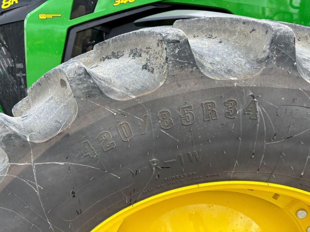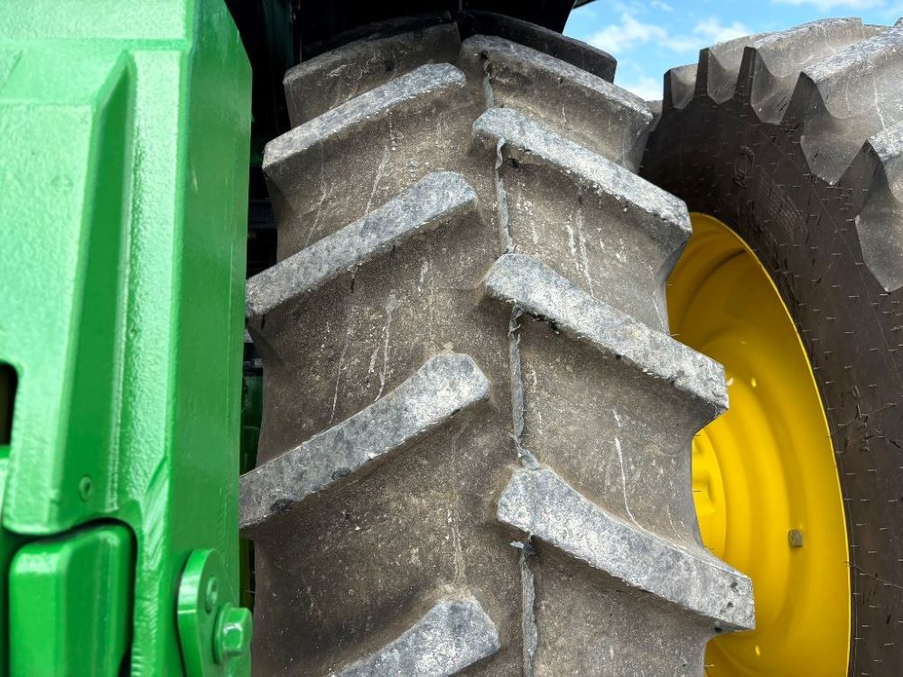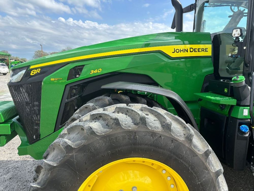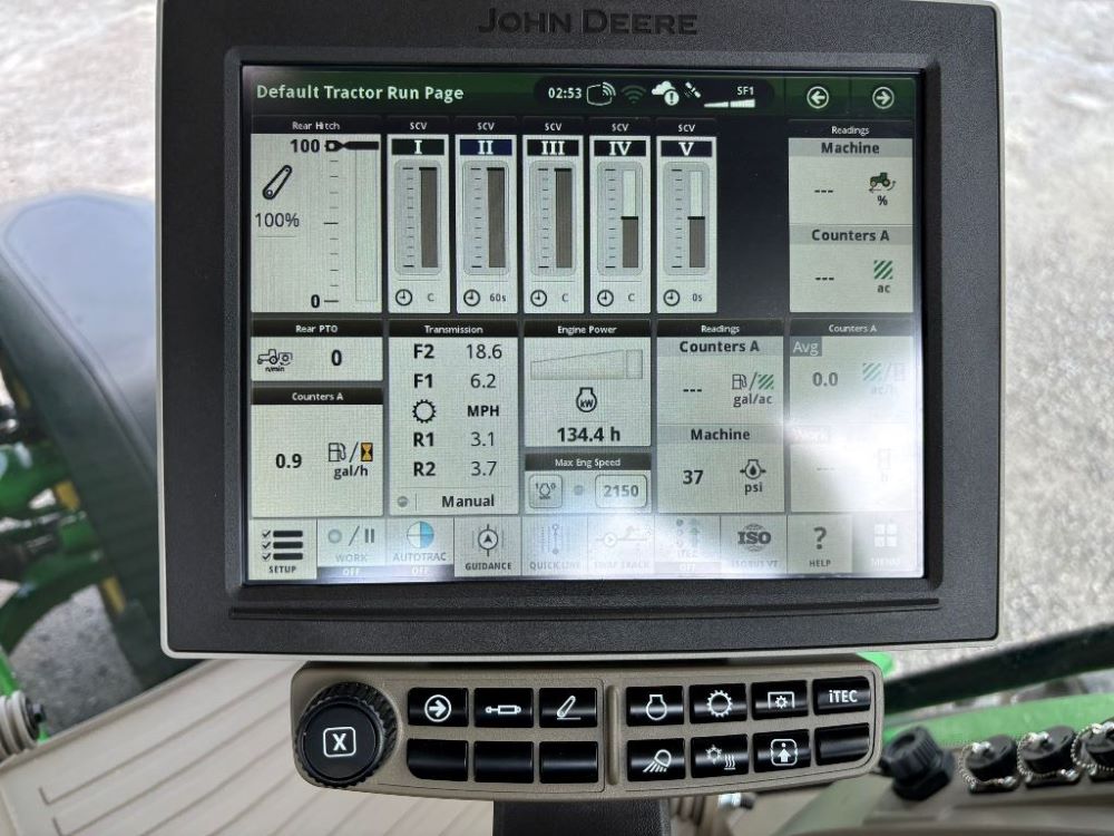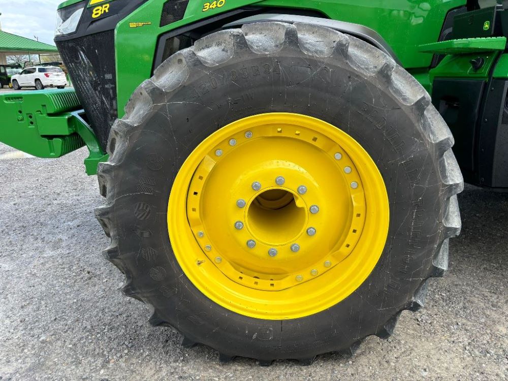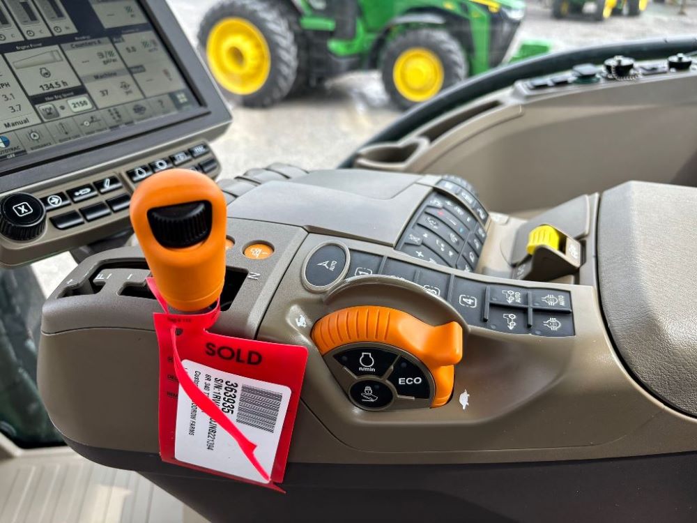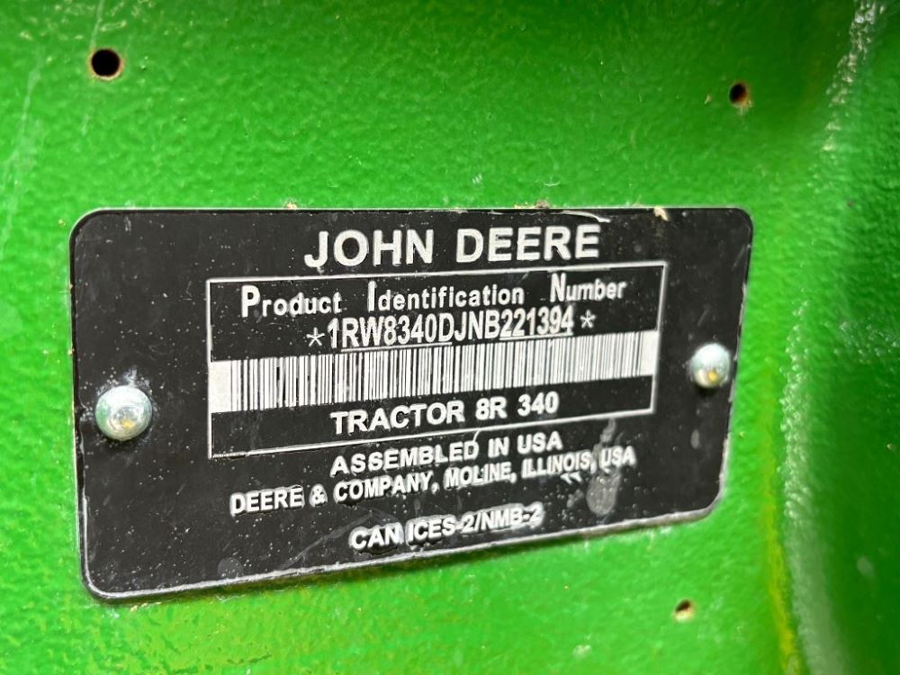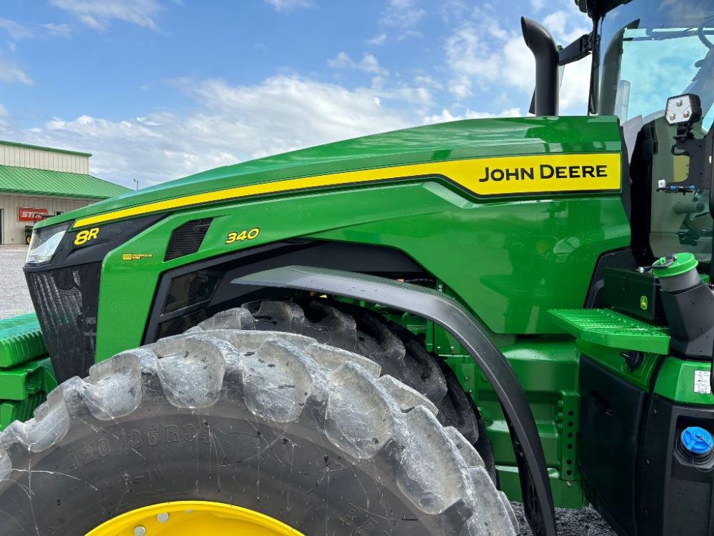 2023 John Deere 8R 340 MFWD Tractor (GP6966), John Deere 340HP 9.0L 6 cylinder diesel engine, E23 power shift transmission with efficiency manager, righ hand reverser with bump to shift controls, Premium cab with cab suspension, premium comfort and convenience package, heat, air conditioning, Am/Fm radio, cloth air driver seat, buddy seat, 5 port hydraulics with ISO couplers and high pressure relief levers, 1000 PTO, (22) CAT 4N/3 three point hitch with quick coupler, Cat 4 drawbar with HD support, aux case drain coupler, power beyond pressure coupler, load sense coupler, front suitcase weights, Firestone 420/85R34 front duals, Firestone 480/80R50 rear duals, rear wheel weights, hydraulic power steering, 60 GPM hyraulic pump, Gen 4, 4600 command center (10") color display with Premium 3.0 activation for auto-trac, section control, RowSense, data sync & data share, JD Link MTG (requires global position receiver which is NOT included), shows 134 hours.