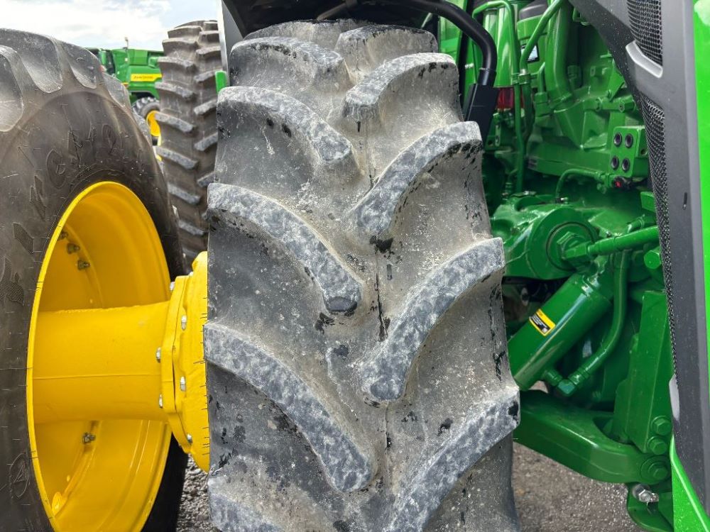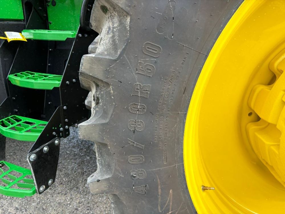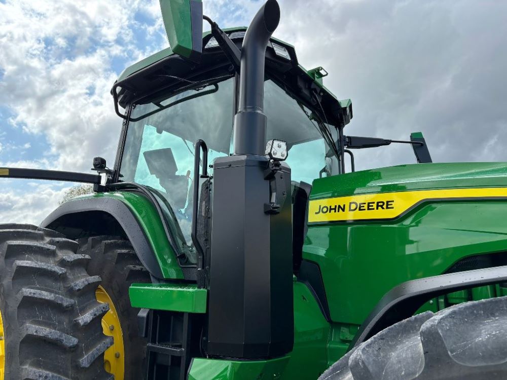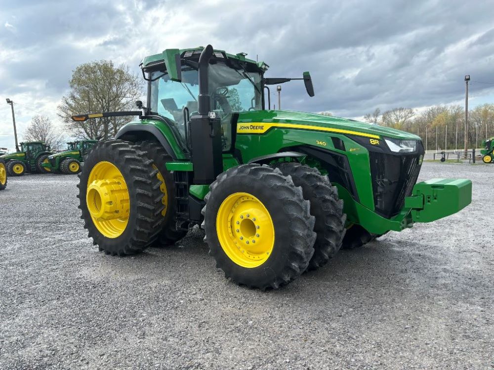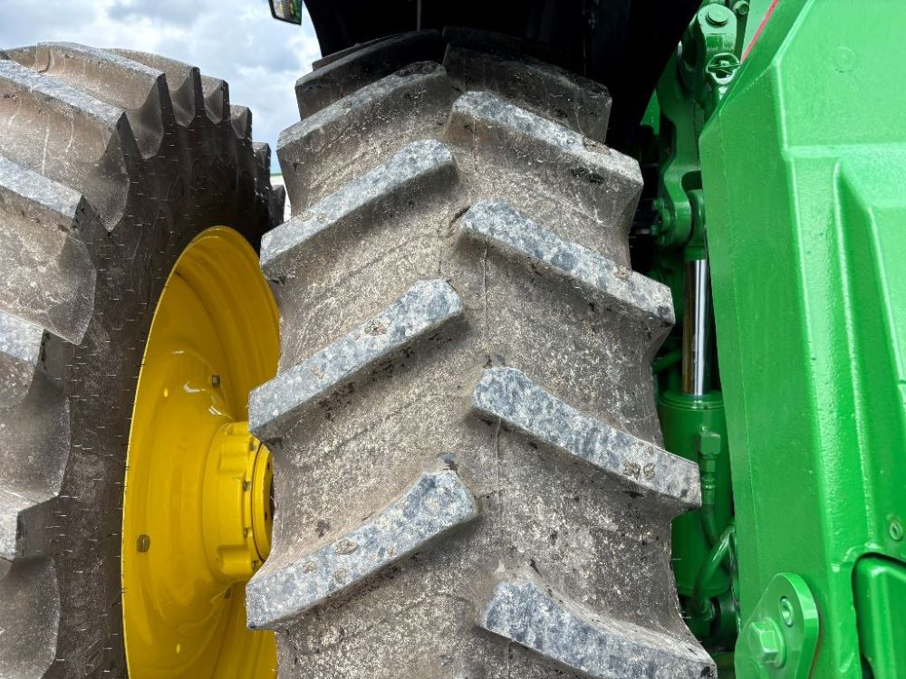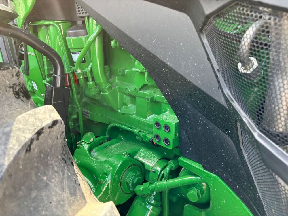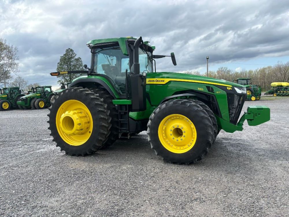 2023 John Deere 8R 340 MFWD Tractor (GP6966), John Deere 340HP 9.0L 6 cylinder diesel engine, E23 power shift transmission with efficiency manager, righ hand reverser with bump to shift controls, Premium cab with cab suspension, premium comfort and convenience package, heat, air conditioning, Am/Fm radio, cloth air driver seat, buddy seat, 5 port hydraulics with ISO couplers and high pressure relief levers, 1000 PTO, (22) CAT 4N/3 three point hitch with quick coupler, Cat 4 drawbar with HD support, aux case drain coupler, power beyond pressure coupler, load sense coupler, front suitcase weights, Firestone 420/85R34 front duals, Firestone 480/80R50 rear duals, rear wheel weights, hydraulic power steering, 60 GPM hyraulic pump, Gen 4, 4600 command center (10") color display with Premium 3.0 activation for auto-trac, section control, RowSense, data sync & data share, JD Link MTG (requires global position receiver which is NOT included), shows 134 hours.