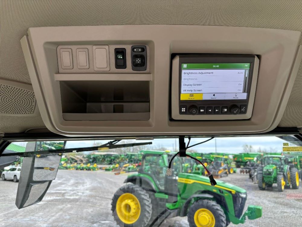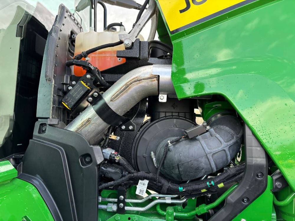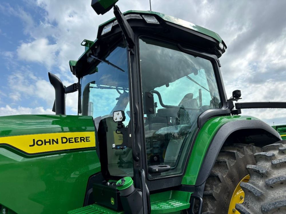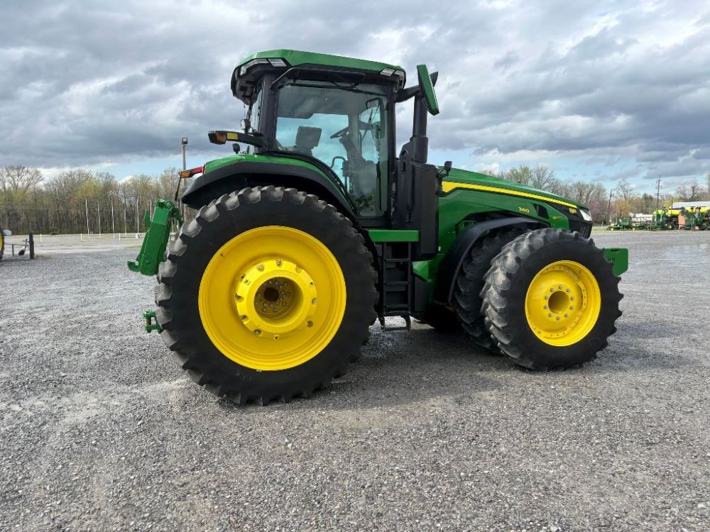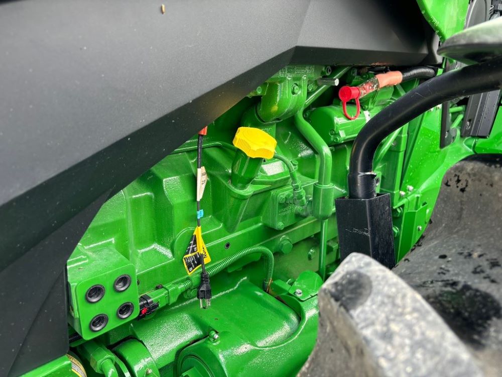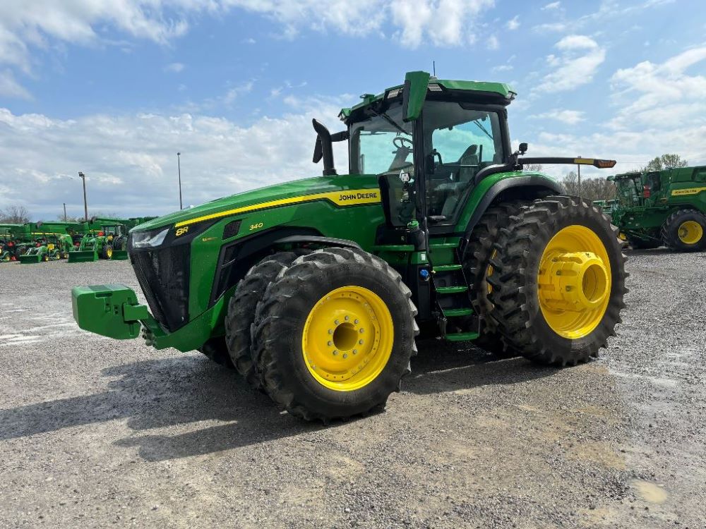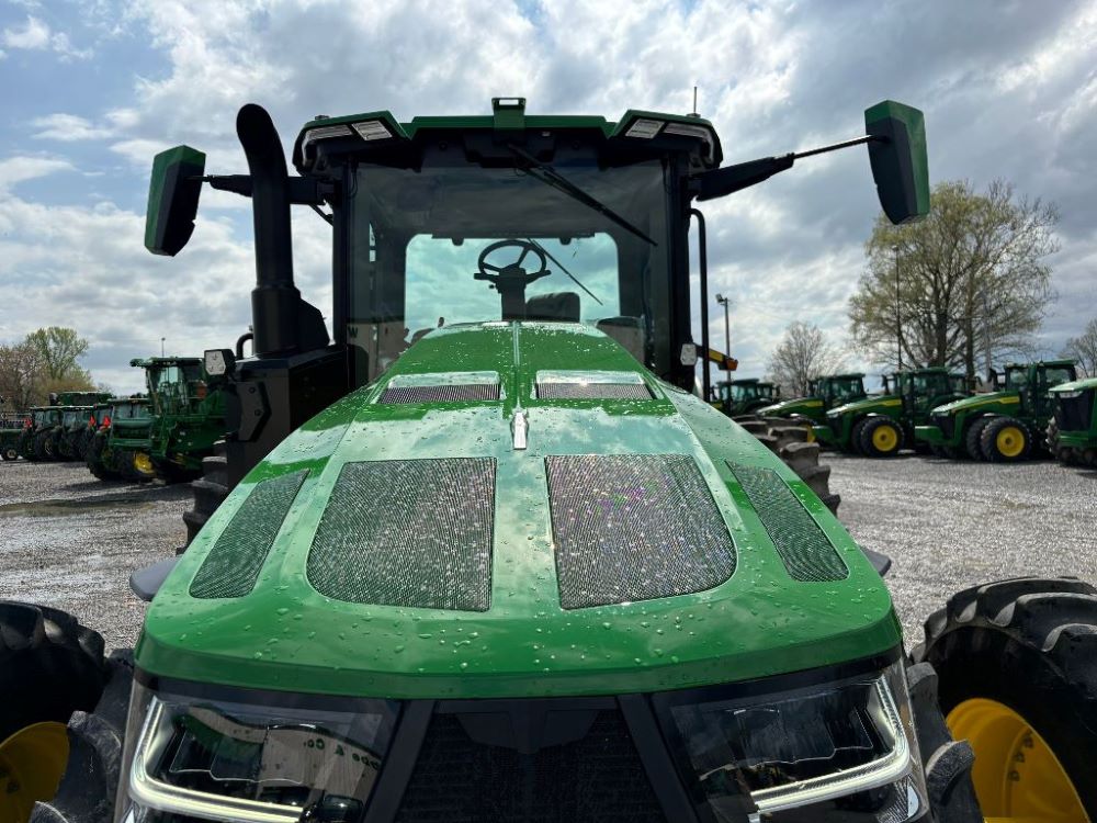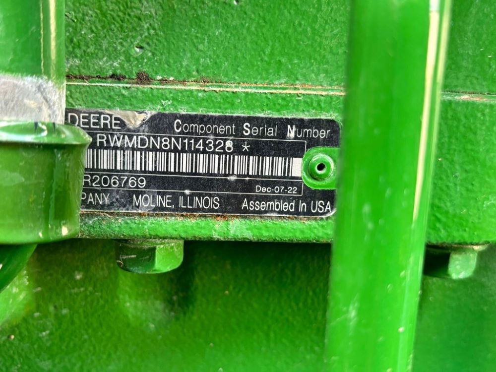 2023 John Deere 8R 340 MFWD Tractor (GP6966), John Deere 340HP 9.0L 6 cylinder diesel engine, E23 power shift transmission with efficiency manager, righ hand reverser with bump to shift controls, Premium cab with cab suspension, premium comfort and convenience package, heat, air conditioning, Am/Fm radio, cloth air driver seat, buddy seat, 5 port hydraulics with ISO couplers and high pressure relief levers, 1000 PTO, (22) CAT 4N/3 three point hitch with quick coupler, Cat 4 drawbar with HD support, aux case drain coupler, power beyond pressure coupler, load sense coupler, front suitcase weights, Firestone 420/85R34 front duals, Firestone 480/80R50 rear duals, rear wheel weights, hydraulic power steering, 60 GPM hyraulic pump, Gen 4, 4600 command center (10") color display with Premium 3.0 activation for auto-trac, section control, RowSense, data sync & data share, JD Link MTG (requires global position receiver which is NOT included), shows 134 hours.
