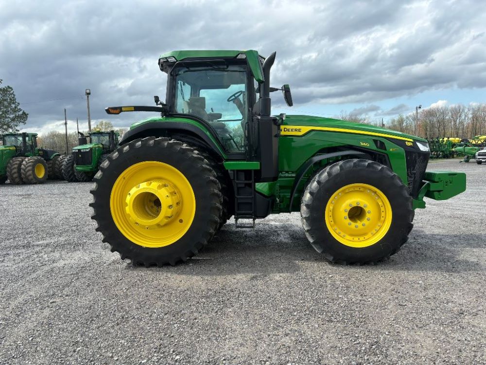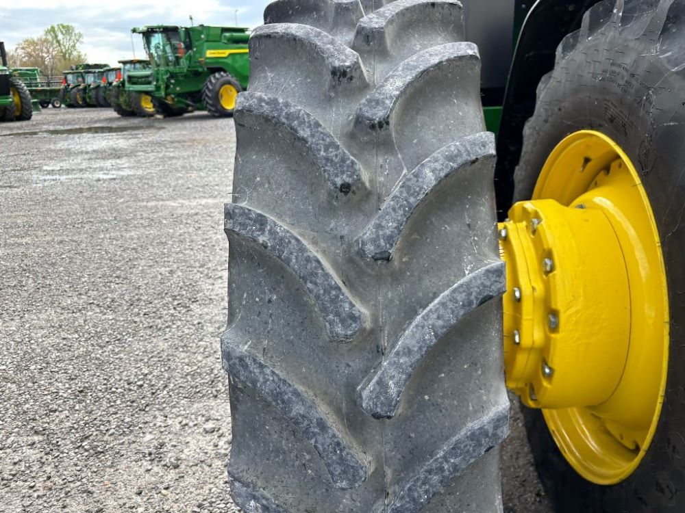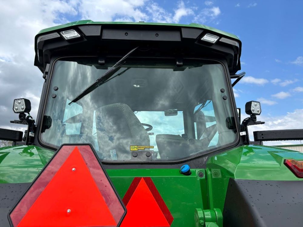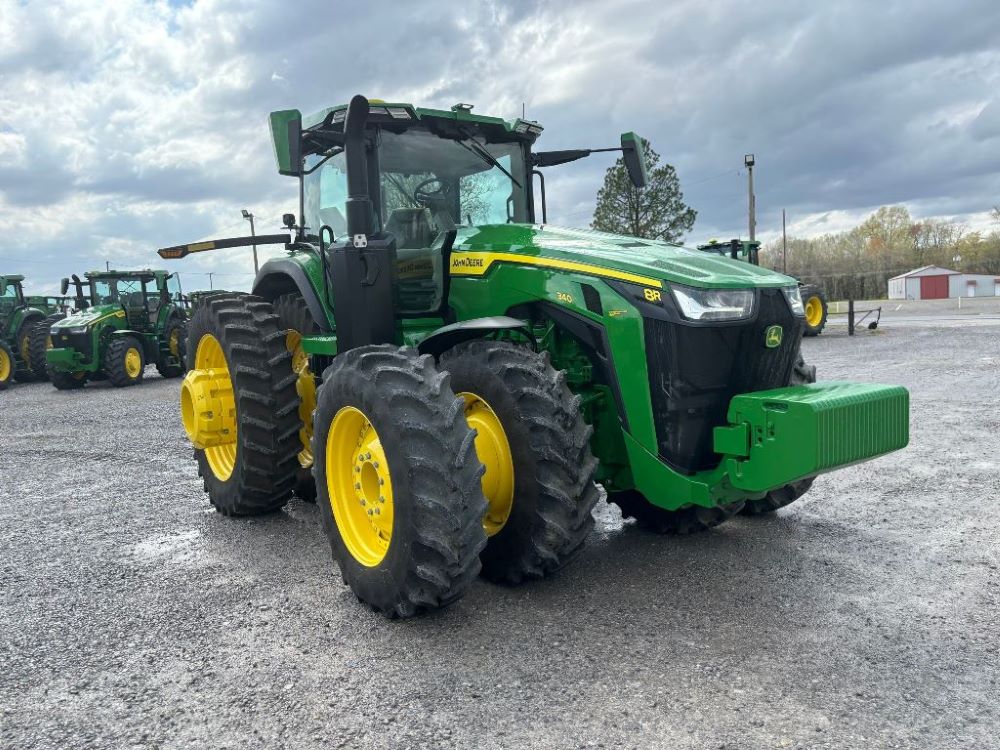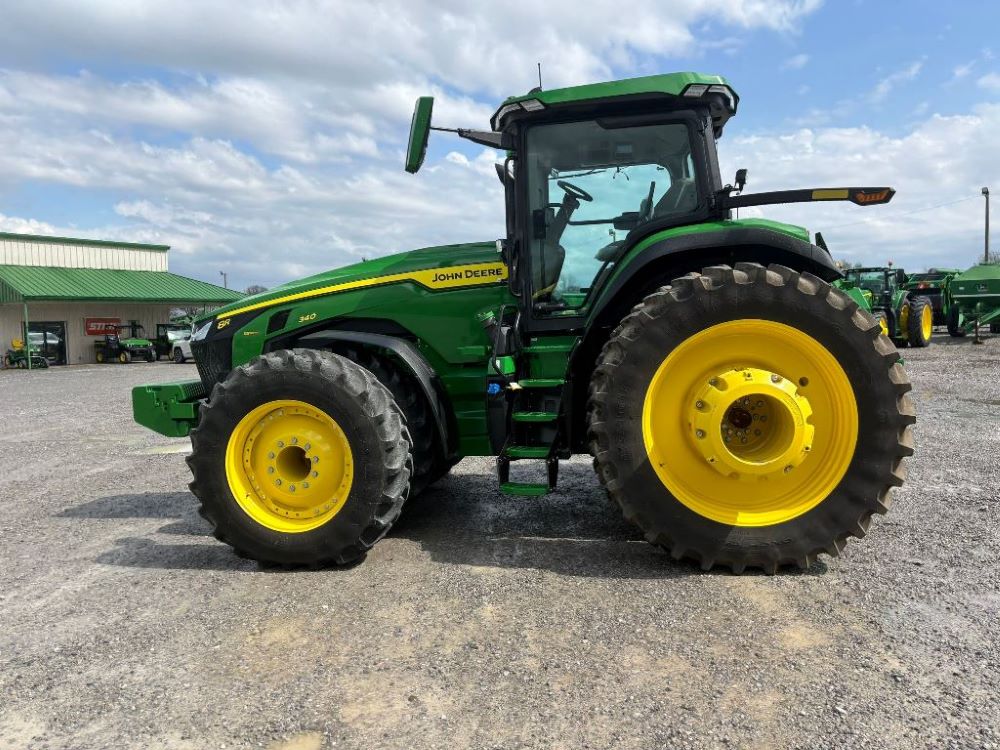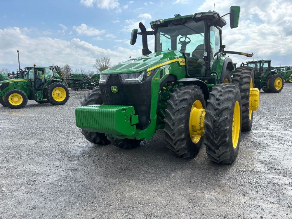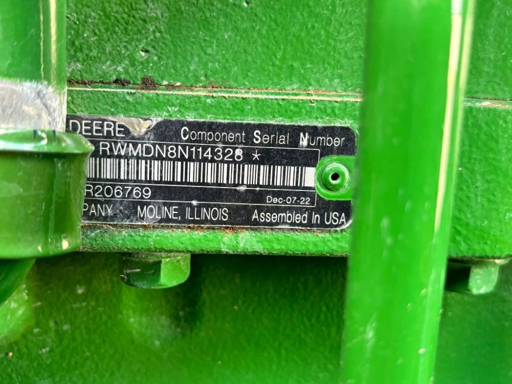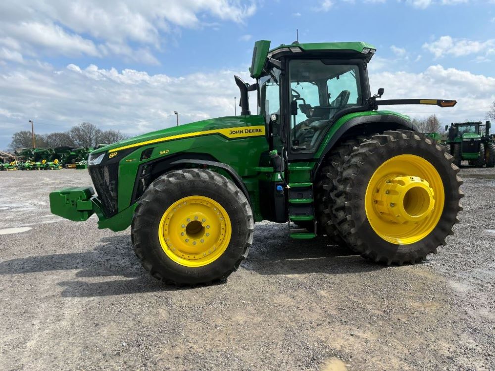 2023 John Deere 8R 340 MFWD Tractor (GP6966), John Deere 340HP 9.0L 6 cylinder diesel engine, E23 power shift transmission with efficiency manager, righ hand reverser with bump to shift controls, Premium cab with cab suspension, premium comfort and convenience package, heat, air conditioning, Am/Fm radio, cloth air driver seat, buddy seat, 5 port hydraulics with ISO couplers and high pressure relief levers, 1000 PTO, (22) CAT 4N/3 three point hitch with quick coupler, Cat 4 drawbar with HD support, aux case drain coupler, power beyond pressure coupler, load sense coupler, front suitcase weights, Firestone 420/85R34 front duals, Firestone 480/80R50 rear duals, rear wheel weights, hydraulic power steering, 60 GPM hyraulic pump, Gen 4, 4600 command center (10") color display with Premium 3.0 activation for auto-trac, section control, RowSense, data sync & data share, JD Link MTG (requires global position receiver which is NOT included), shows 134 hours.