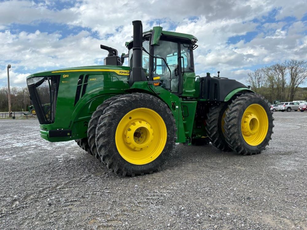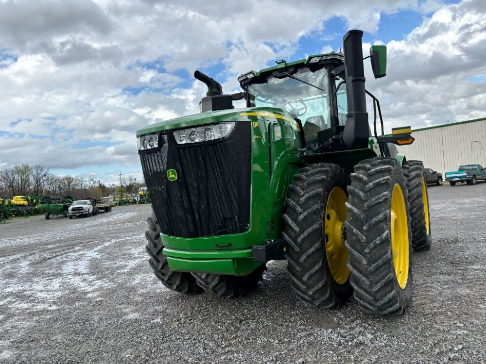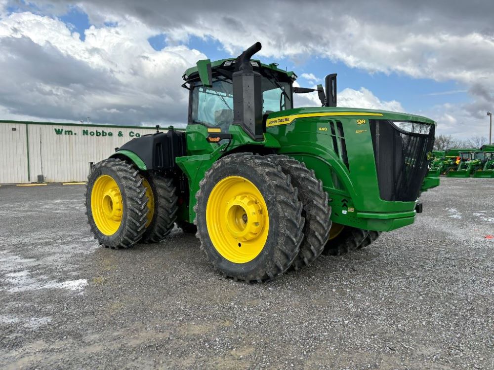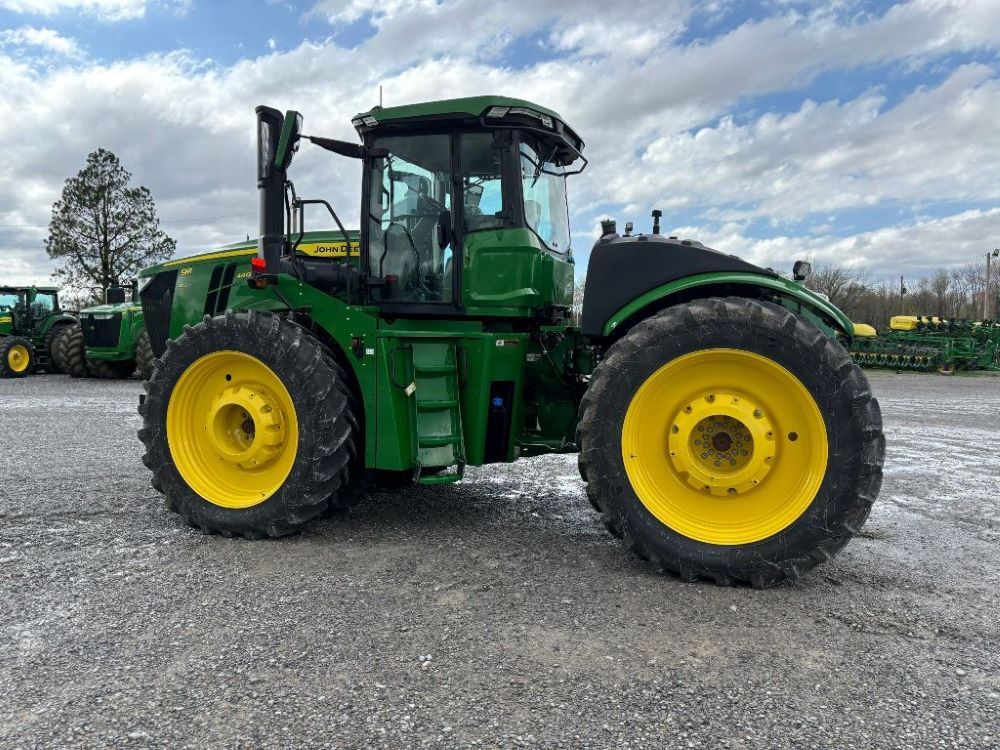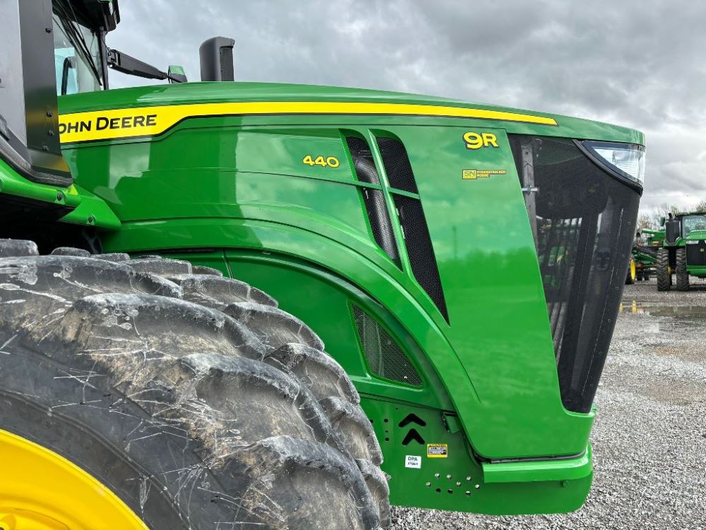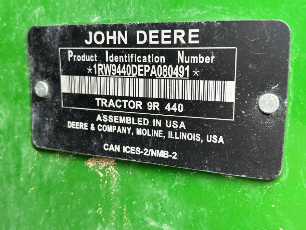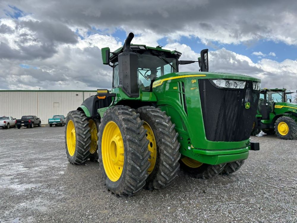 2023 John Deere 9R 440 Articulated 4WD Tractor (GP6969), John Deere 440HP 13.6L 6 cylinder diesel engine, 18F/6R E18 power shift transmission with efficiency manager, Premium CommandView cab, Premium comfort package, heat, air conditioning, Am/Fm radio, cloth air driver seat, buddy seat, 5 port E/H hydraulic valves with ISO couplers & high pressure relief levers, aux hydraulic connections, standard CAT 4 draw bar, 1000 PTO, 55 GPM hydraulic pump, (12) front suitcase weights, Michelin 420/90R30 front tires, Michelin 480/80R50 front/rear duals, front/rear wheel weights, adjustable right Command Arm with 10" color touch display, 4600 processor with Premium 3.0 activations (auto-trac, RowSense, section control, data sync & data share - requires JD global position receiver which is NOT included), JD Link MTG, shows 449 hours.