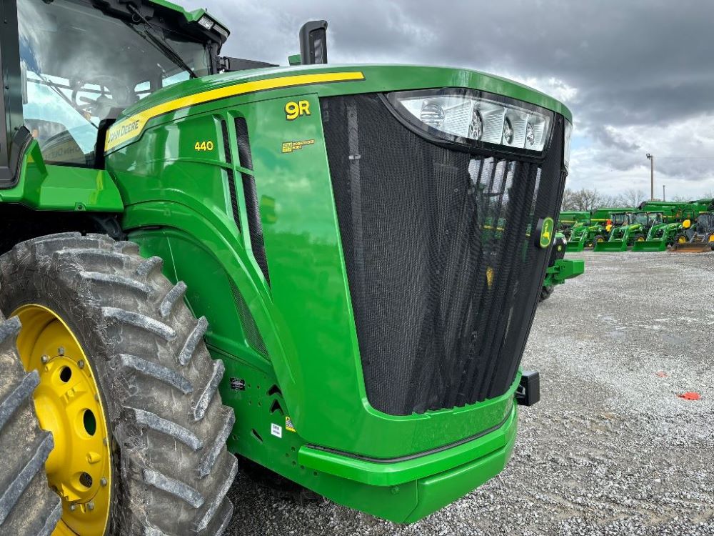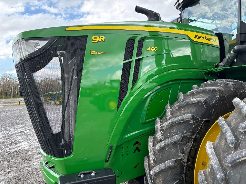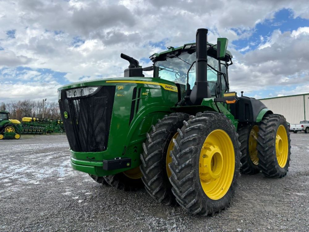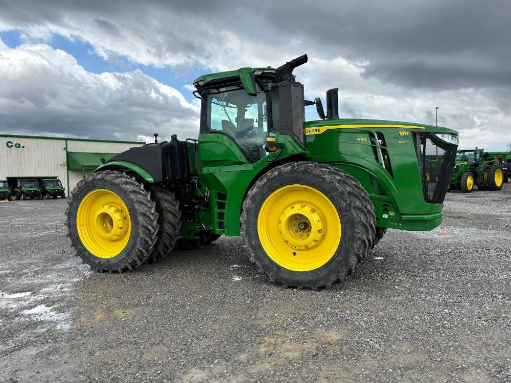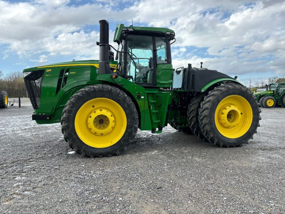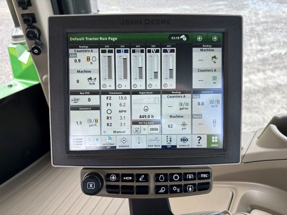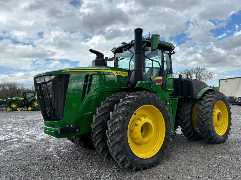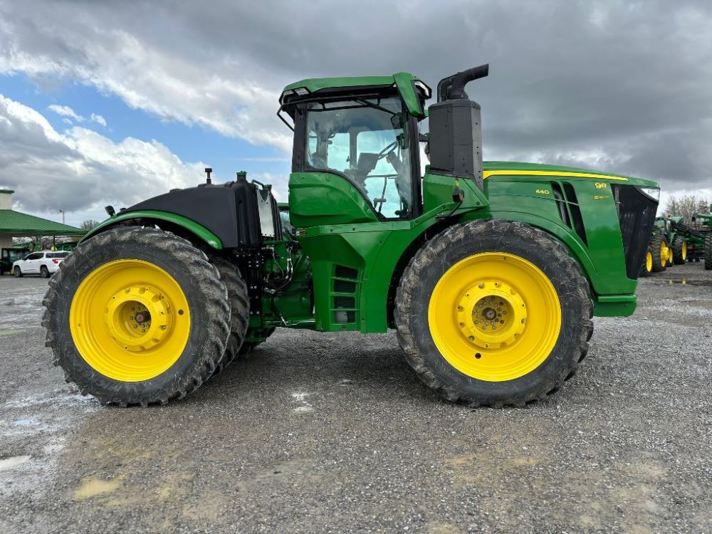 2023 John Deere 9R 440 Articulated 4WD Tractor (GP6969), John Deere 440HP 13.6L 6 cylinder diesel engine, 18F/6R E18 power shift transmission with efficiency manager, Premium CommandView cab, Premium comfort package, heat, air conditioning, Am/Fm radio, cloth air driver seat, buddy seat, 5 port E/H hydraulic valves with ISO couplers & high pressure relief levers, aux hydraulic connections, standard CAT 4 draw bar, 1000 PTO, 55 GPM hydraulic pump, (12) front suitcase weights, Michelin 420/90R30 front tires, Michelin 480/80R50 front/rear duals, front/rear wheel weights, adjustable right Command Arm with 10" color touch display, 4600 processor with Premium 3.0 activations (auto-trac, RowSense, section control, data sync & data share - requires JD global position receiver which is NOT included), JD Link MTG, shows 449 hours.