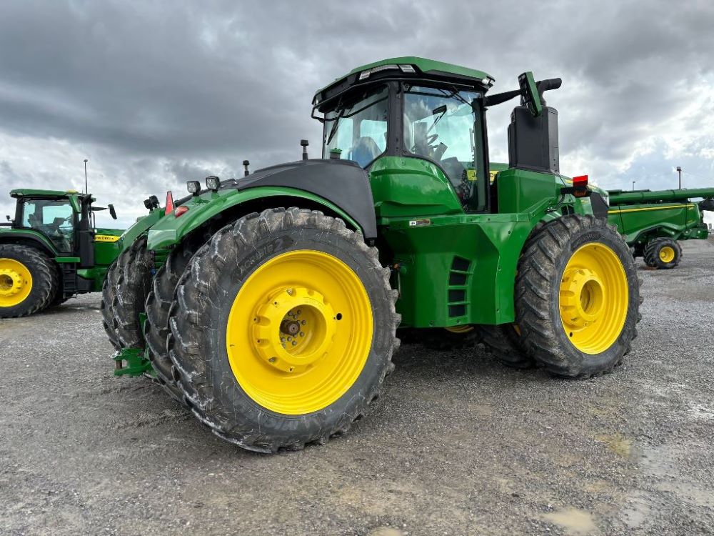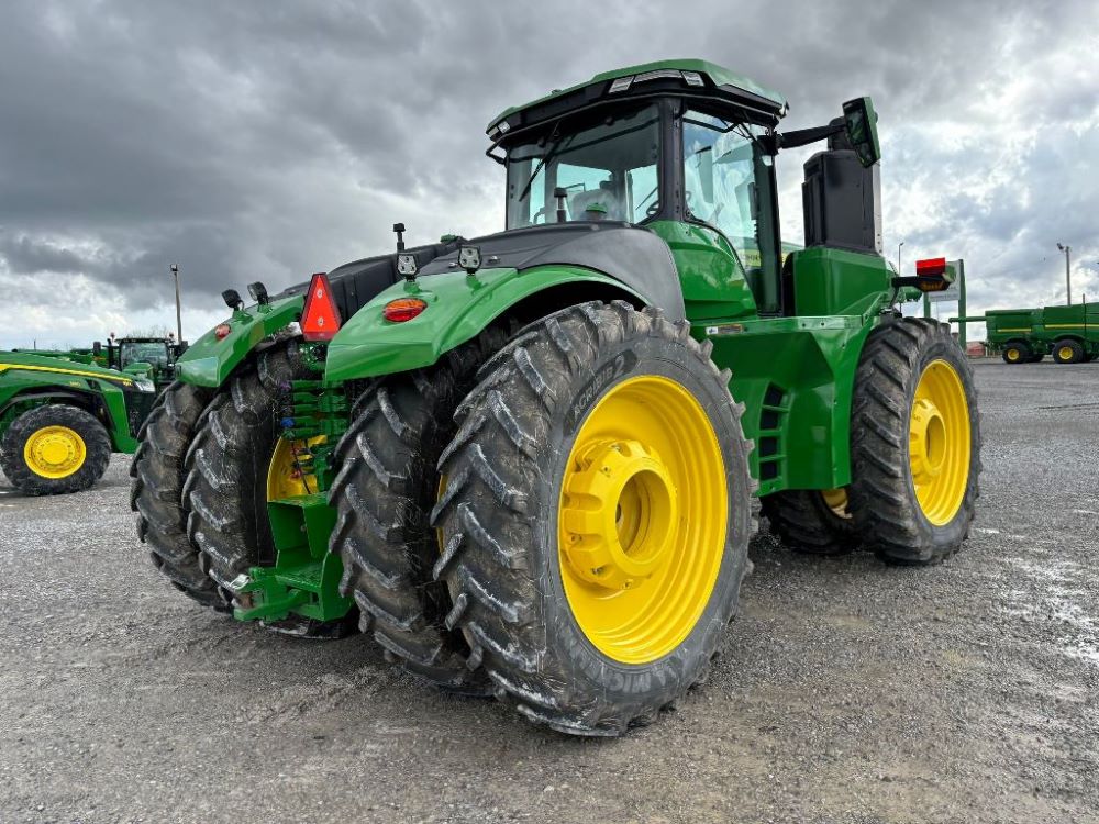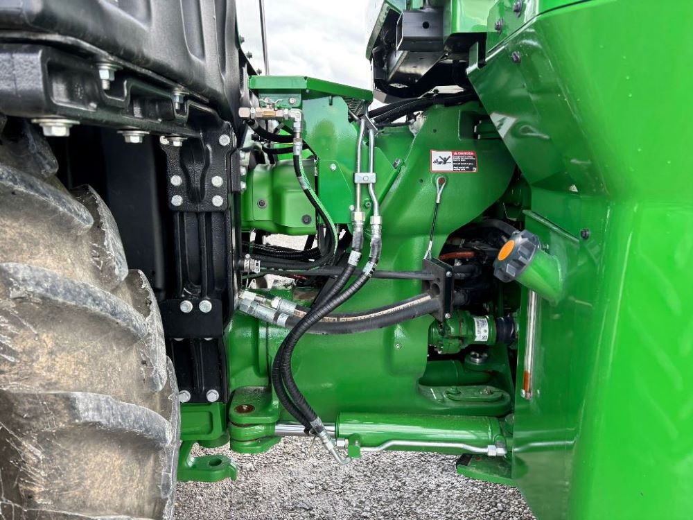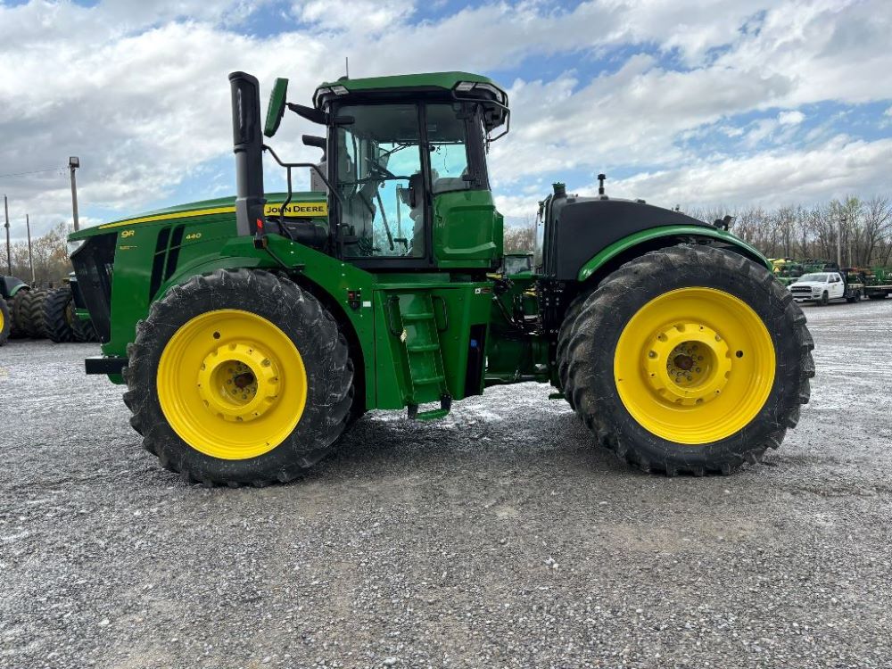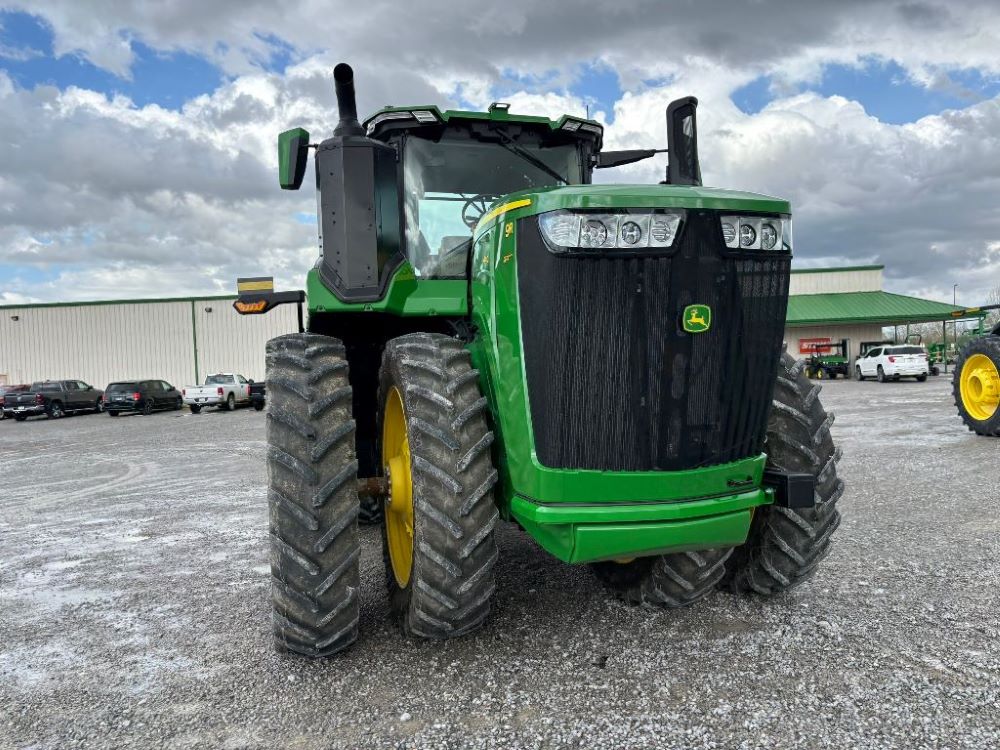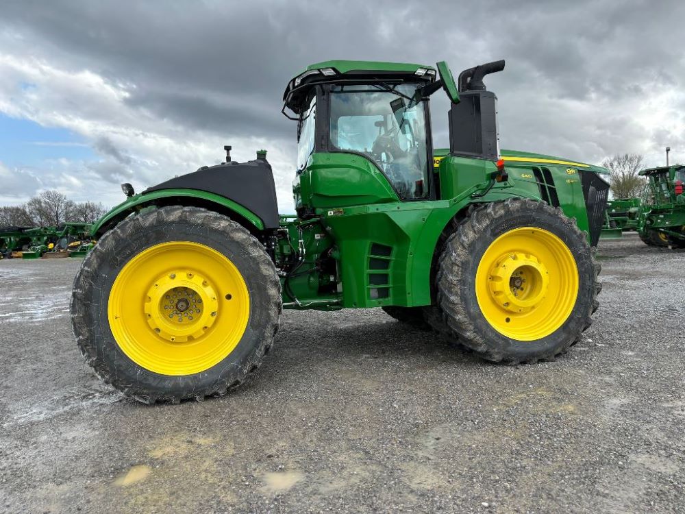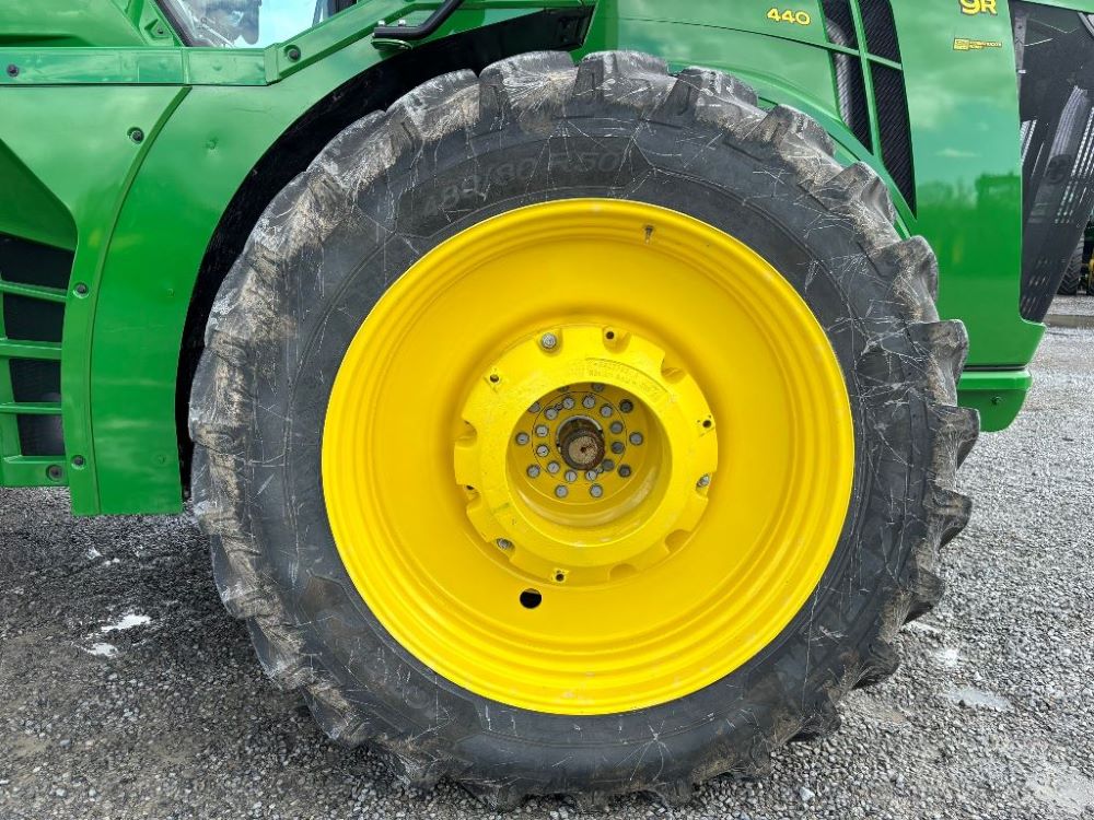 2023 John Deere 9R 440 Articulated 4WD Tractor (GP6969), John Deere 440HP 13.6L 6 cylinder diesel engine, 18F/6R E18 power shift transmission with efficiency manager, Premium CommandView cab, Premium comfort package, heat, air conditioning, Am/Fm radio, cloth air driver seat, buddy seat, 5 port E/H hydraulic valves with ISO couplers & high pressure relief levers, aux hydraulic connections, standard CAT 4 draw bar, 1000 PTO, 55 GPM hydraulic pump, (12) front suitcase weights, Michelin 420/90R30 front tires, Michelin 480/80R50 front/rear duals, front/rear wheel weights, adjustable right Command Arm with 10" color touch display, 4600 processor with Premium 3.0 activations (auto-trac, RowSense, section control, data sync & data share - requires JD global position receiver which is NOT included), JD Link MTG, shows 449 hours.