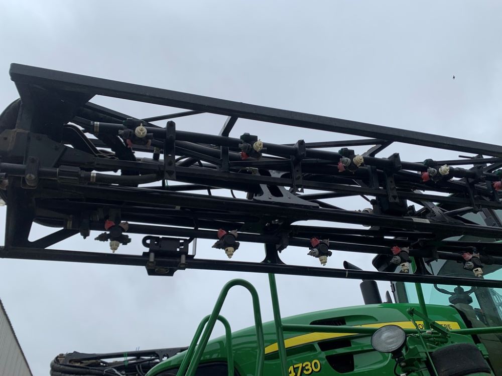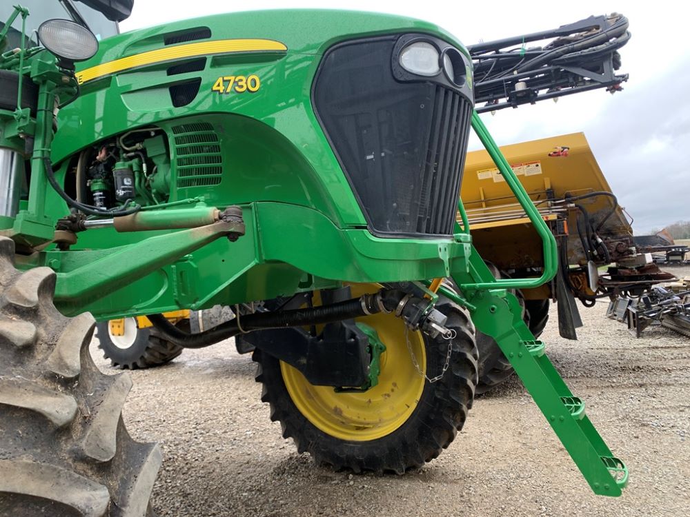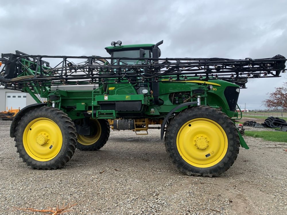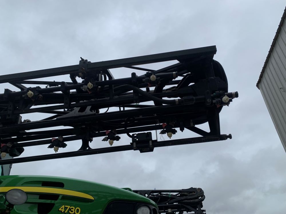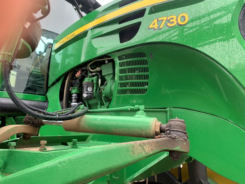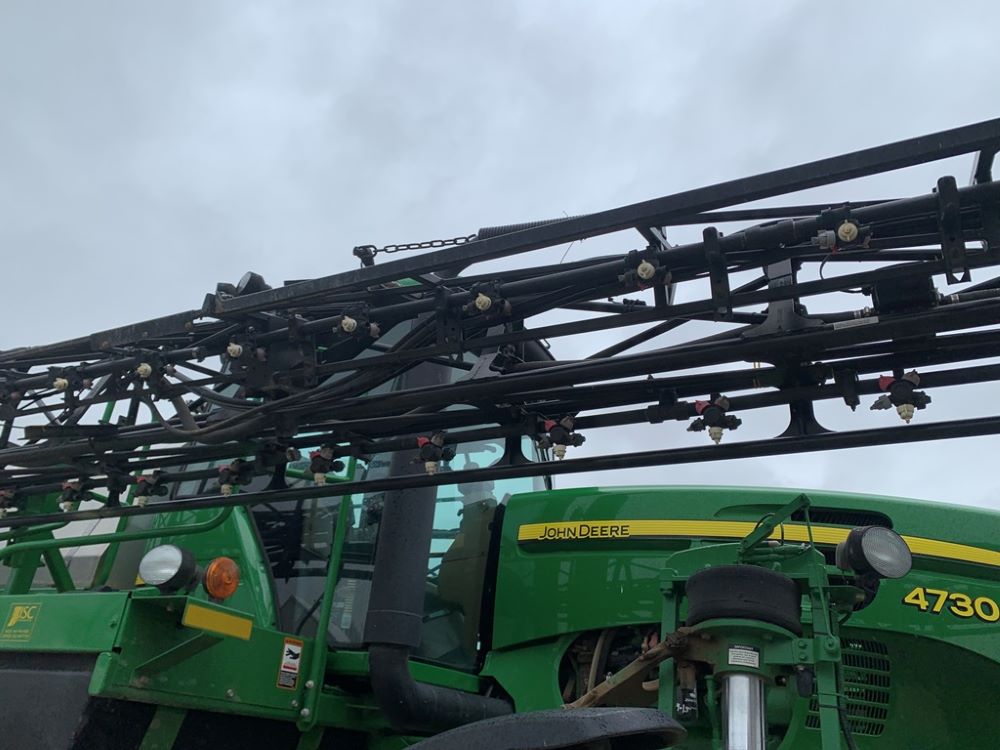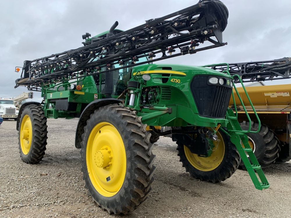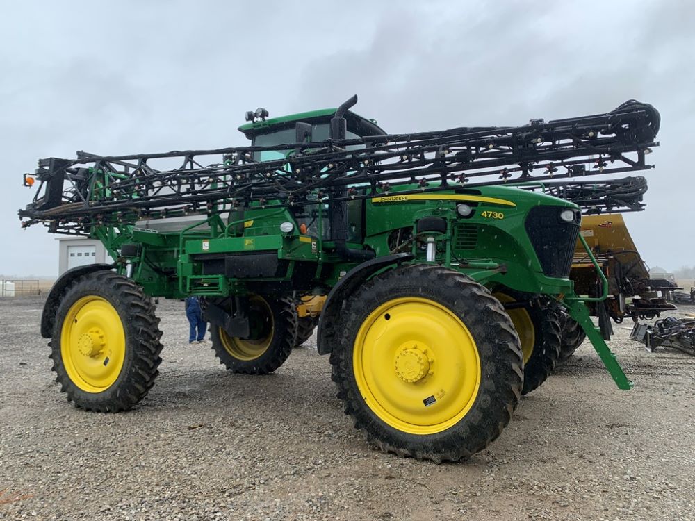 2008 John Deere 4730 Sprayer (CP3533), John Deere diesel engine (PE6068L026202), hydrostatic transmission, heat, air conditioning, Am/Fm radio, buddy seat, 800 gallon stainless steel liquid system, 100' boom, 5-way nozzle bodies, stainless steel chemical inductor, Firestone 380/90R46 row crop tires, fenders, 839 ACTUAL HOURS.
