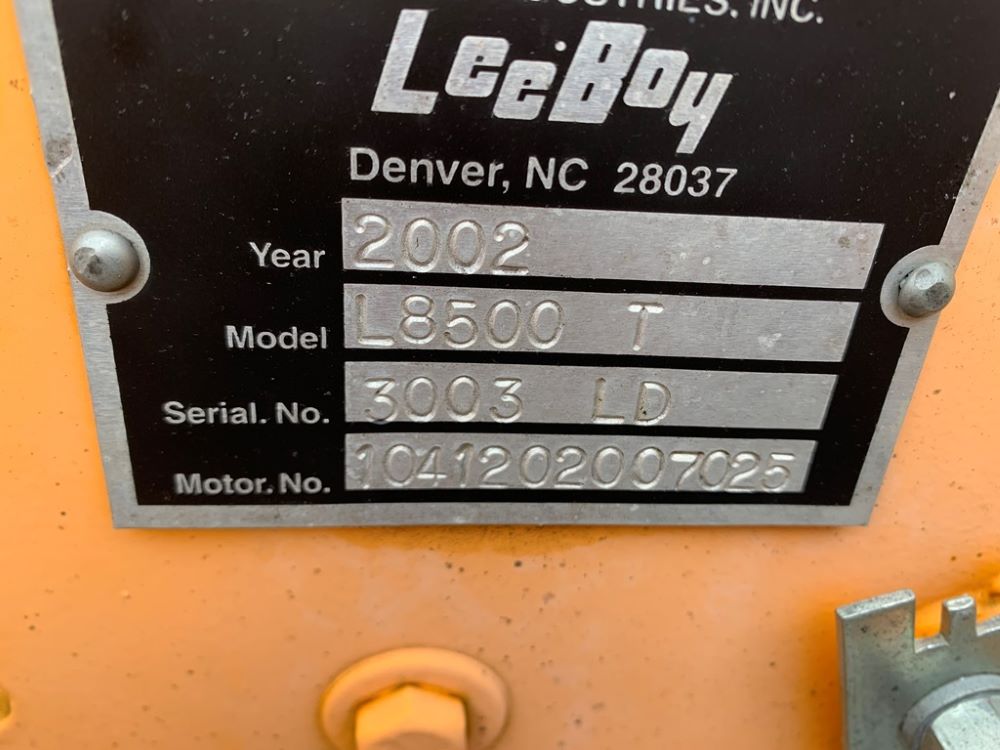 2002 LeeBoy 8500T Paver (CP3531), 2002 LeeBoy Model 8500T paver, low deck, propane heated, shows 239 hours.
