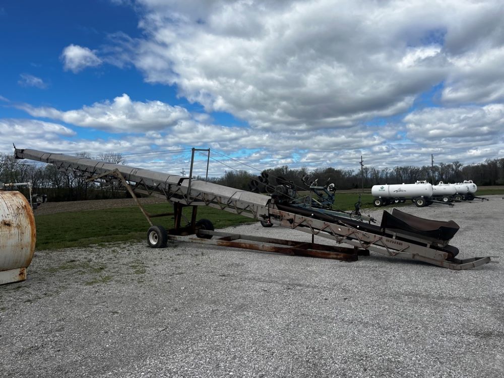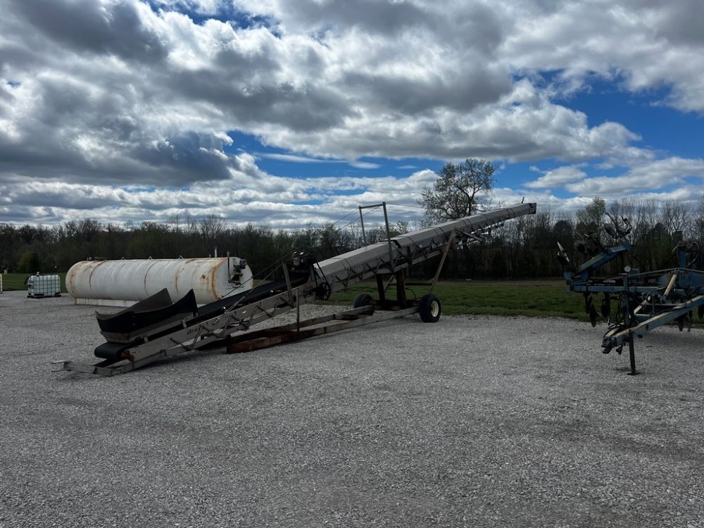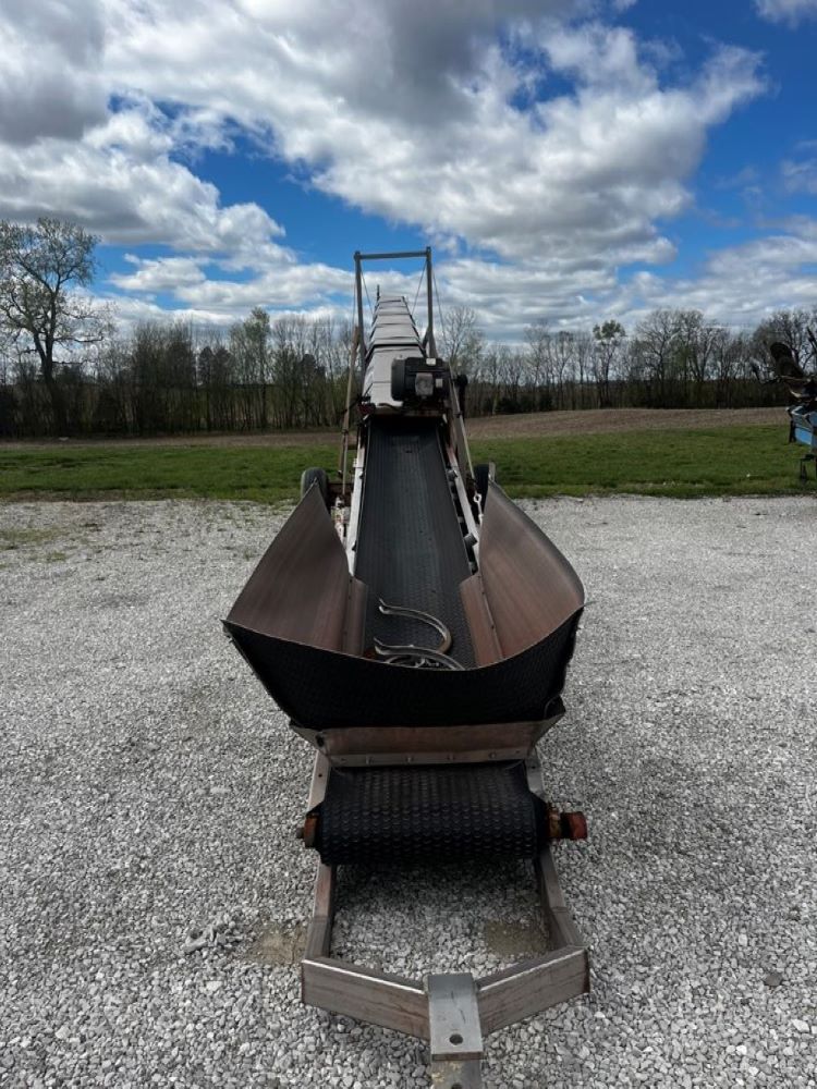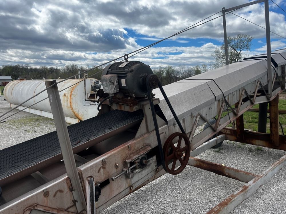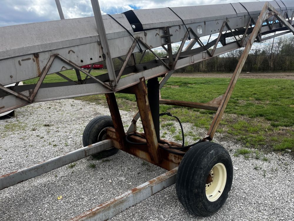 Doyle Stainless Steel Belt Conveyor (PZ12138), Doyle 65' stainless steel belt conveyor, electric motor, portable, 12.5L-15 flotation tires S/N 00720A65 with a hydronic system.
