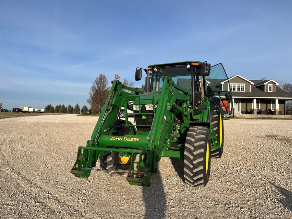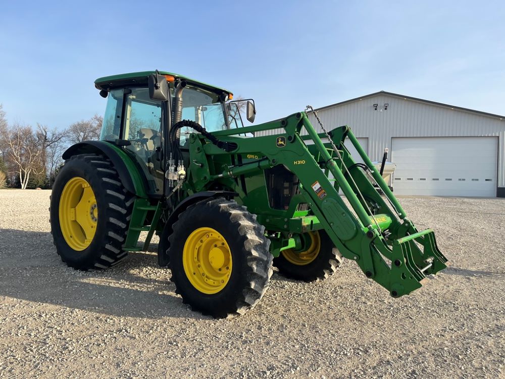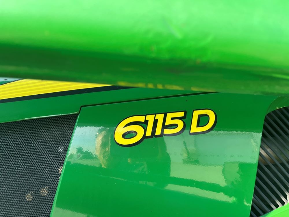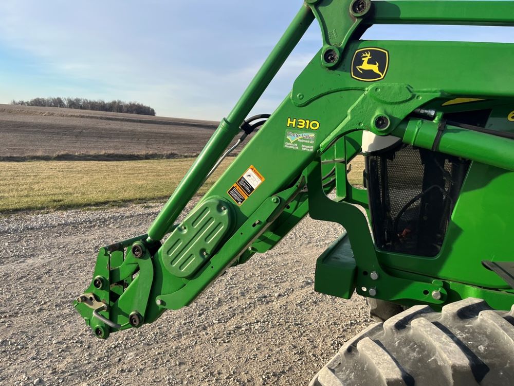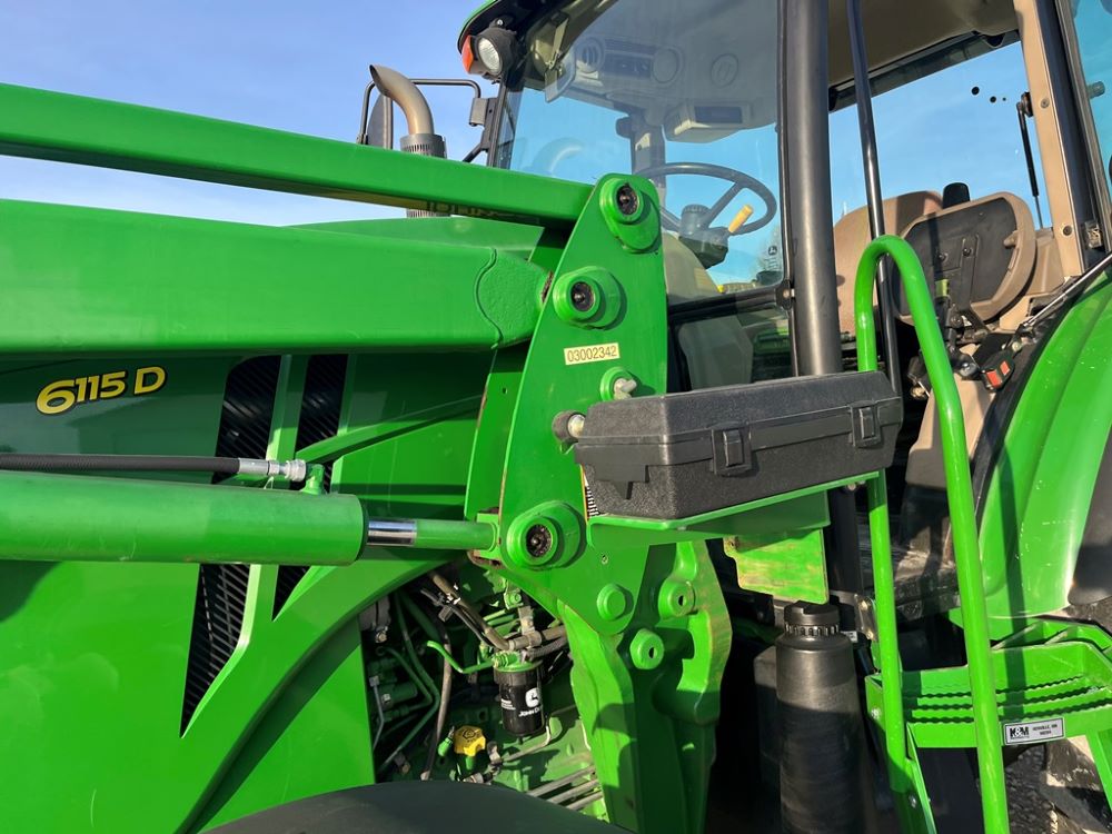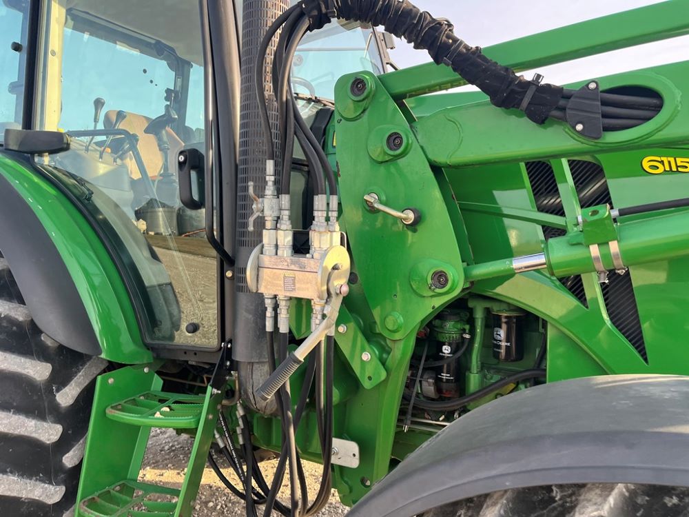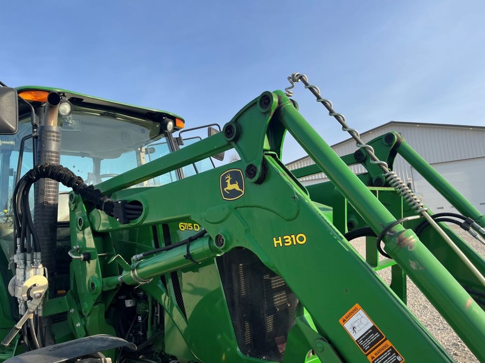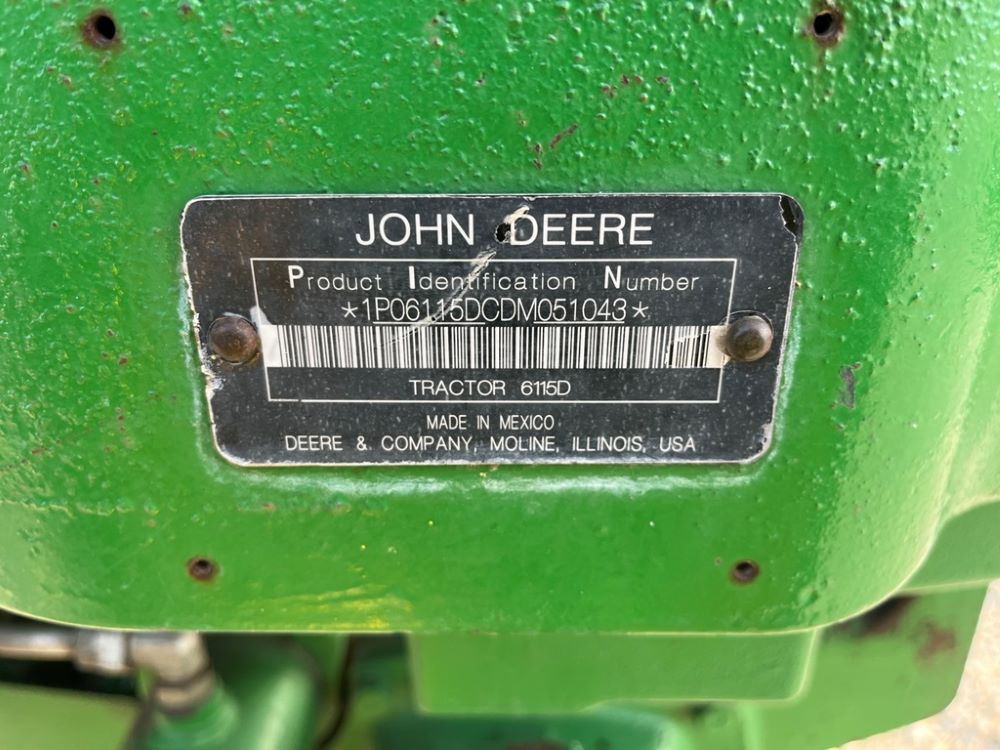 2013 John Deere 6115D Tractor (DR8165), MFWD, John Deere diesel engine, 3X3 transmission w/shuttle shift, John Deere H310 hydraulic front end loader, single point hookup, Joystick controls, triple hydraulic outlets, 540 PTO, 3 point hitch w/quick hitch, enclosed cab w/heat and air conditioning, after market cab step, Firestone 14.9-24 front tires, and 18.4-38 rear tires, shows 3,641 hours.