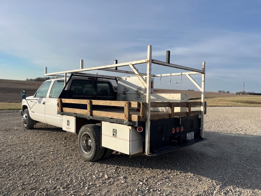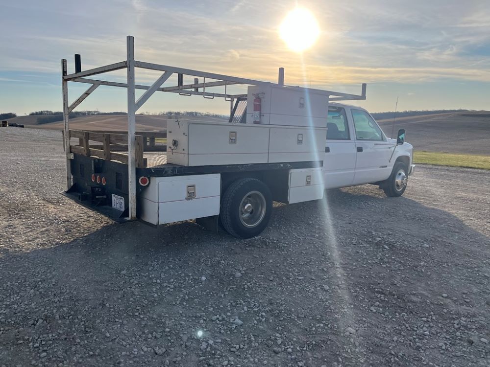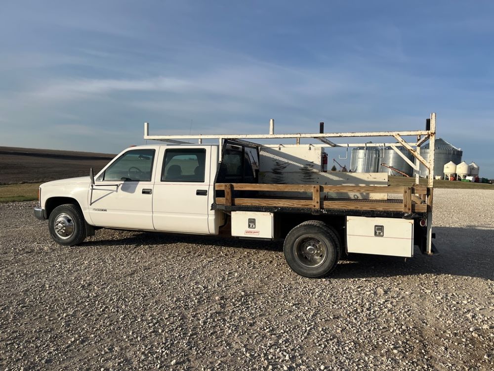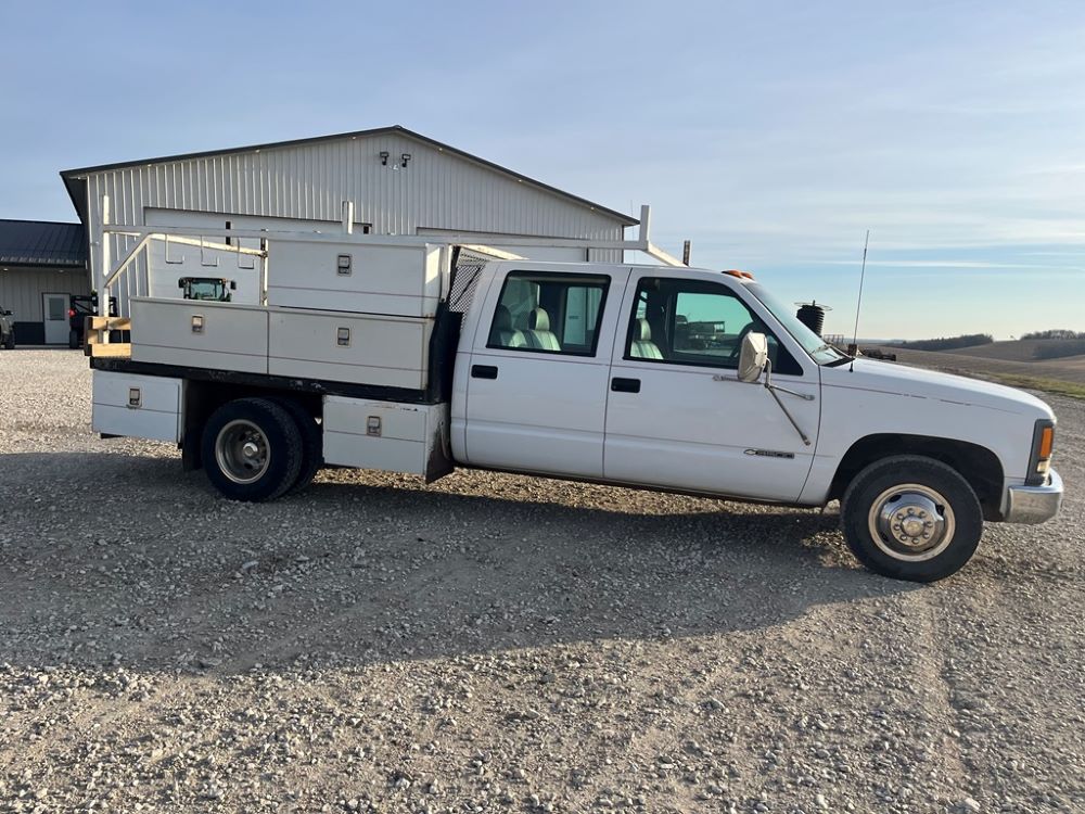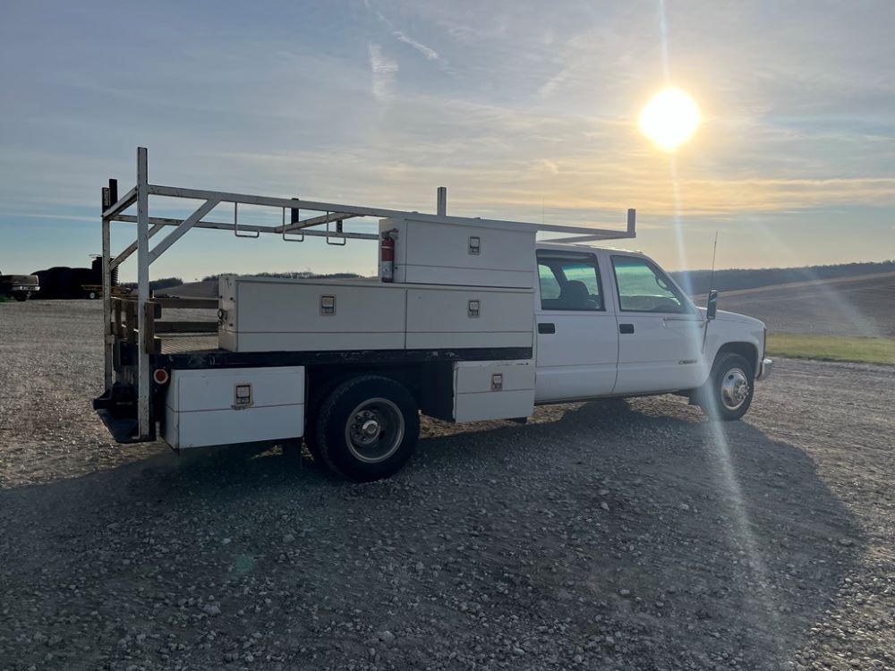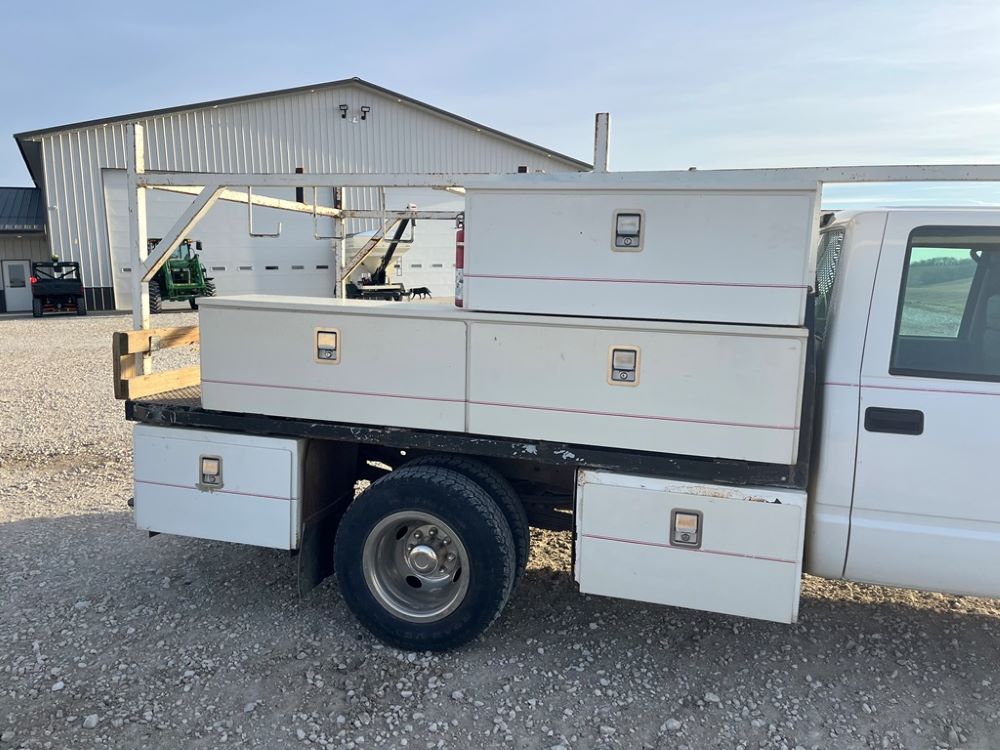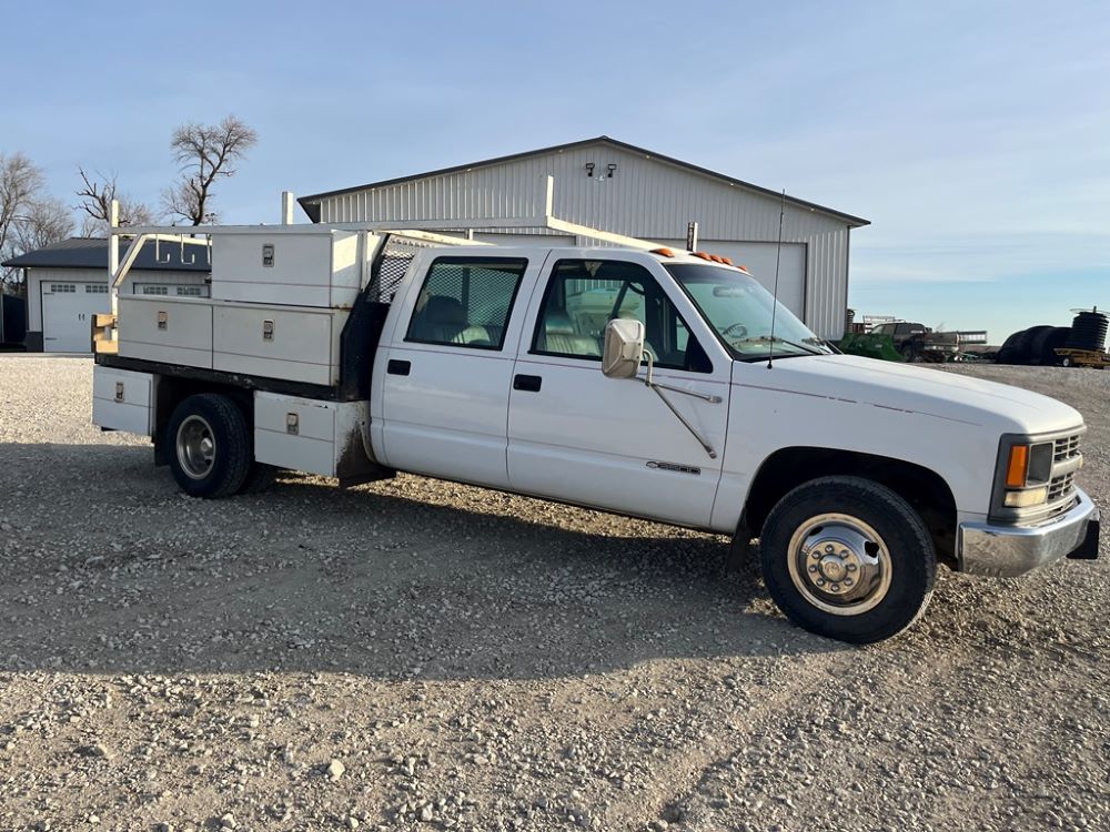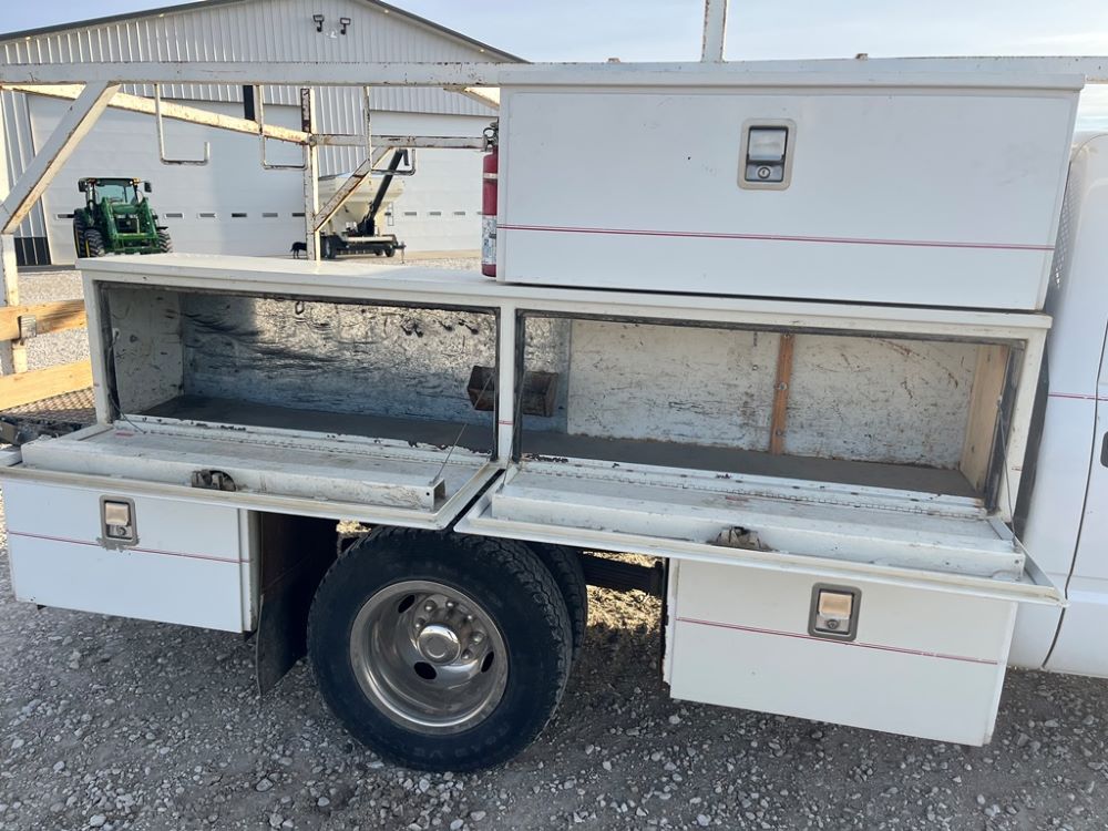 1999 Chevy 3500 Service Truck (DR8166), 7.4 liter gas engine, automatic transmission, 4 door cab, 10' steel flatbed, (6) Weather Guard steel storage boxes, top ladder rack, rear receiver hitch, heat/air conditioning, AM/FM CD radio, 225/75R16 tires, odometer is not accurate.