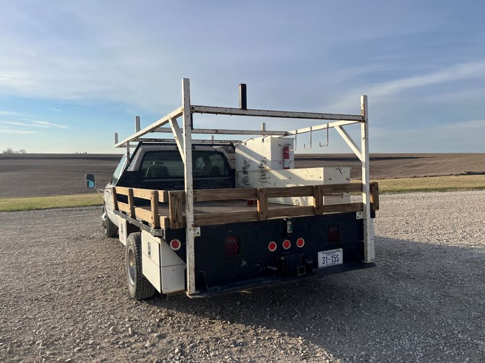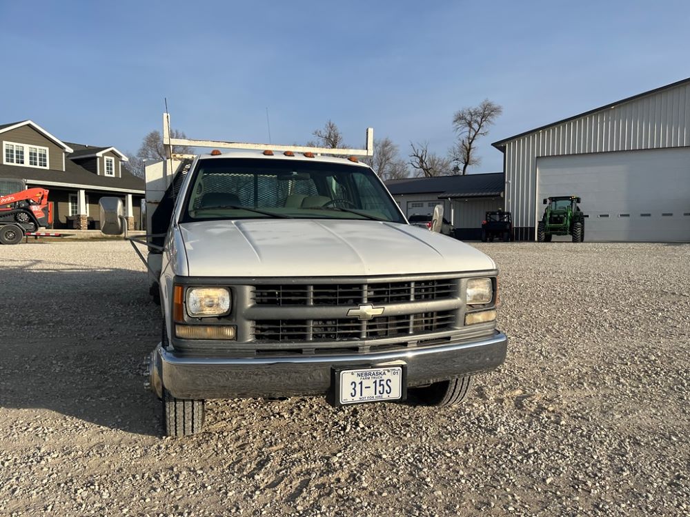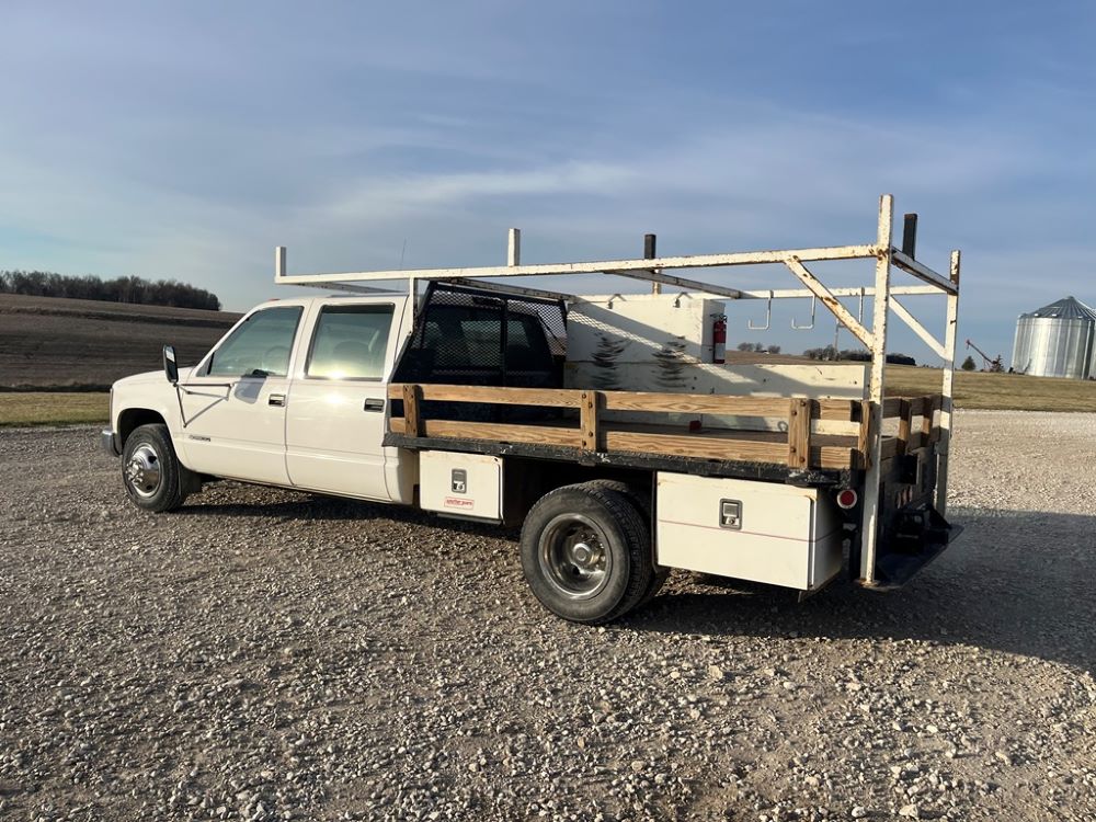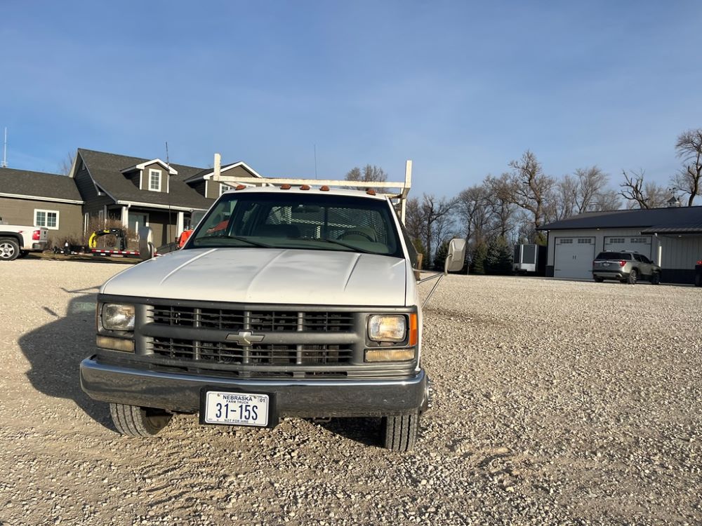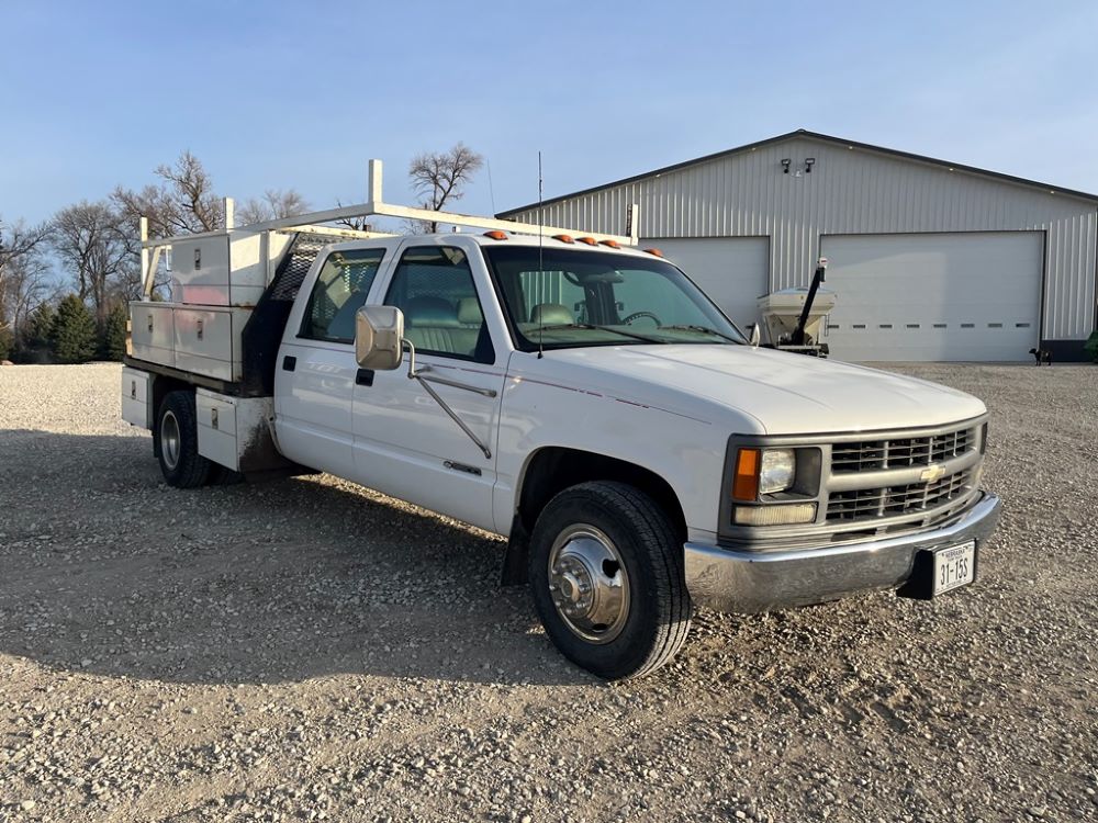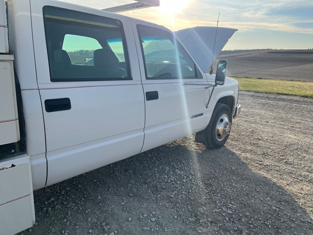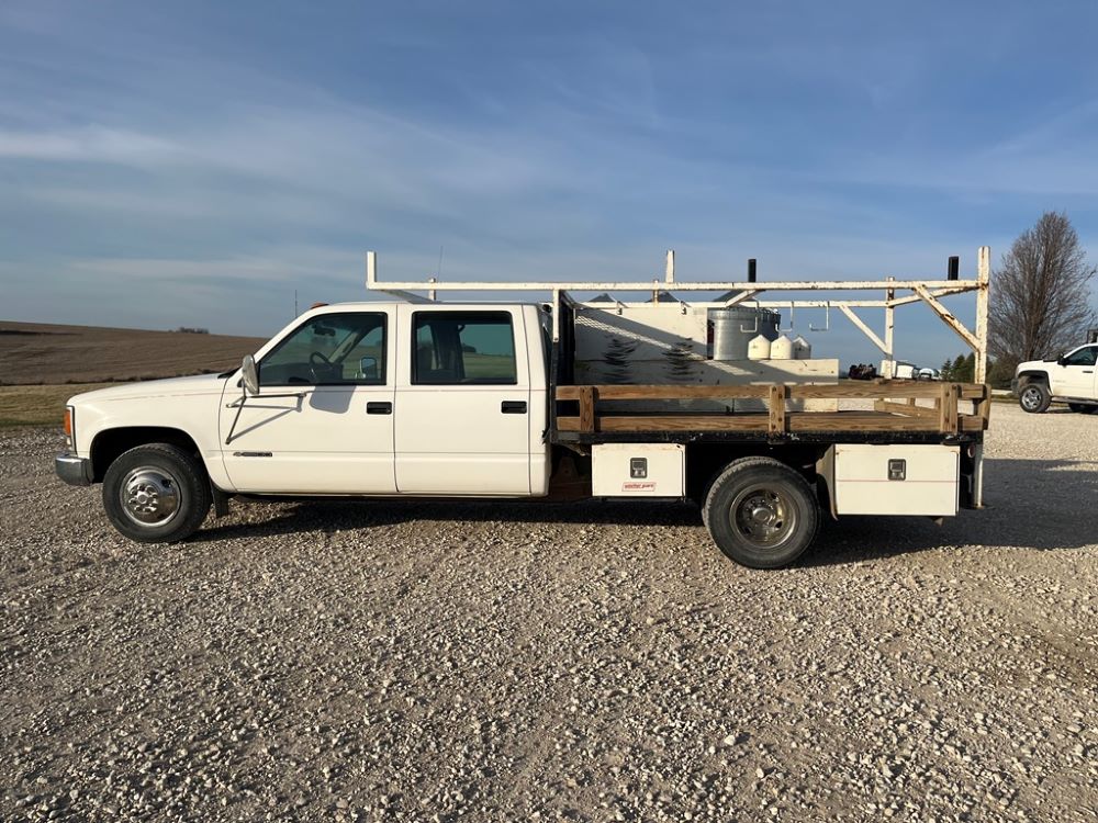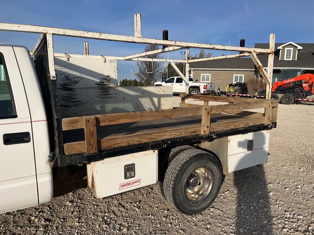 1999 Chevy 3500 Service Truck (DR8166), 7.4 liter gas engine, automatic transmission, 4 door cab, 10' steel flatbed, (6) Weather Guard steel storage boxes, top ladder rack, rear receiver hitch, heat/air conditioning, AM/FM CD radio, 225/75R16 tires, odometer is not accurate.