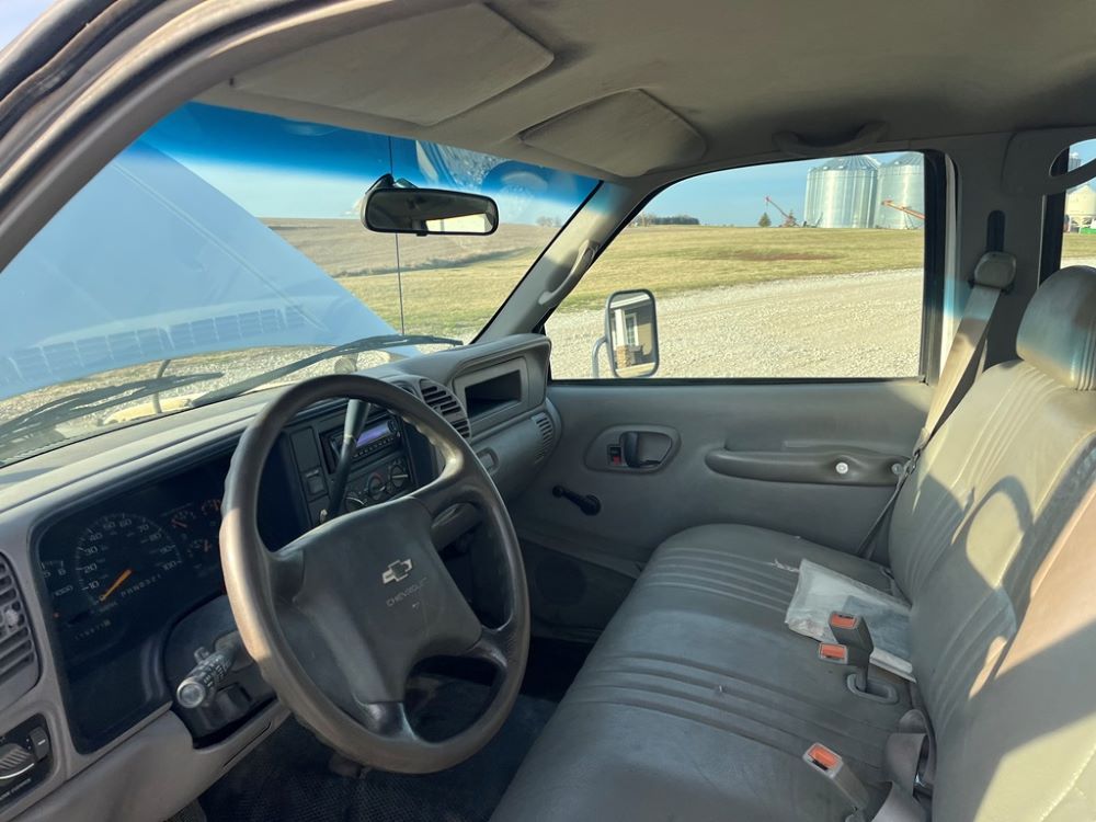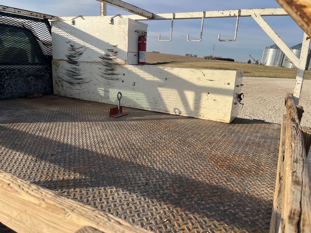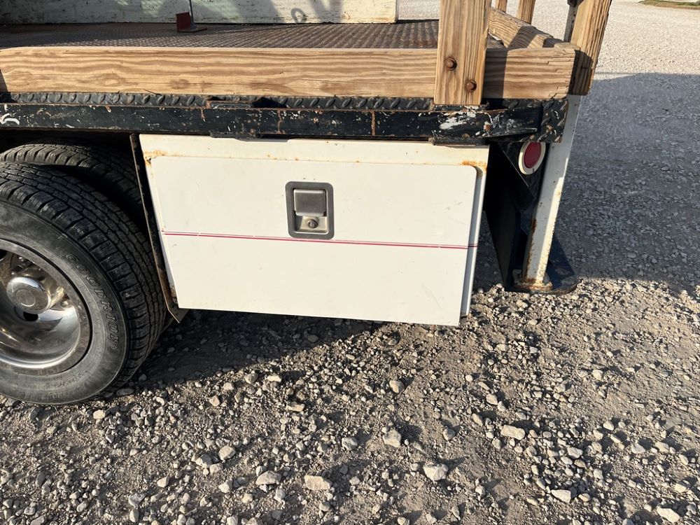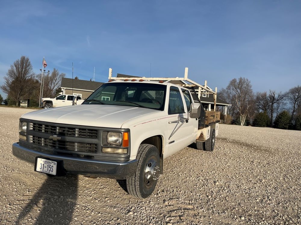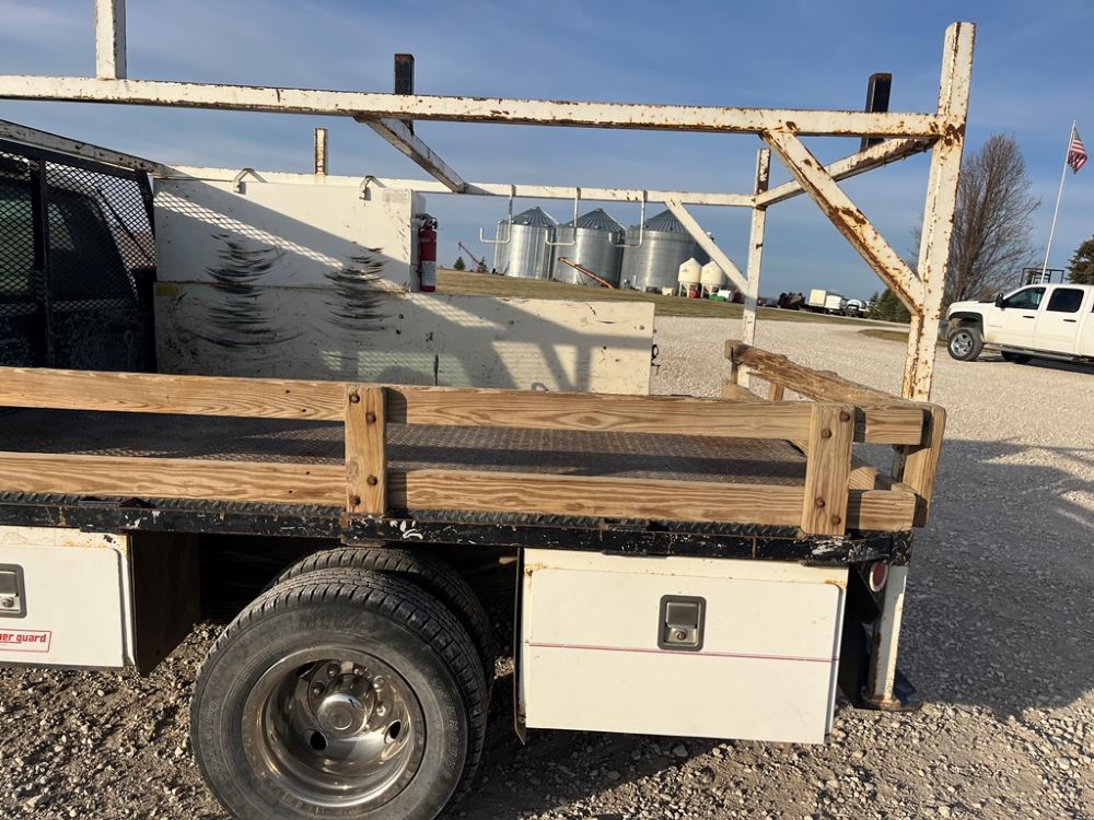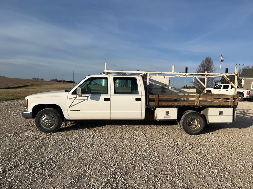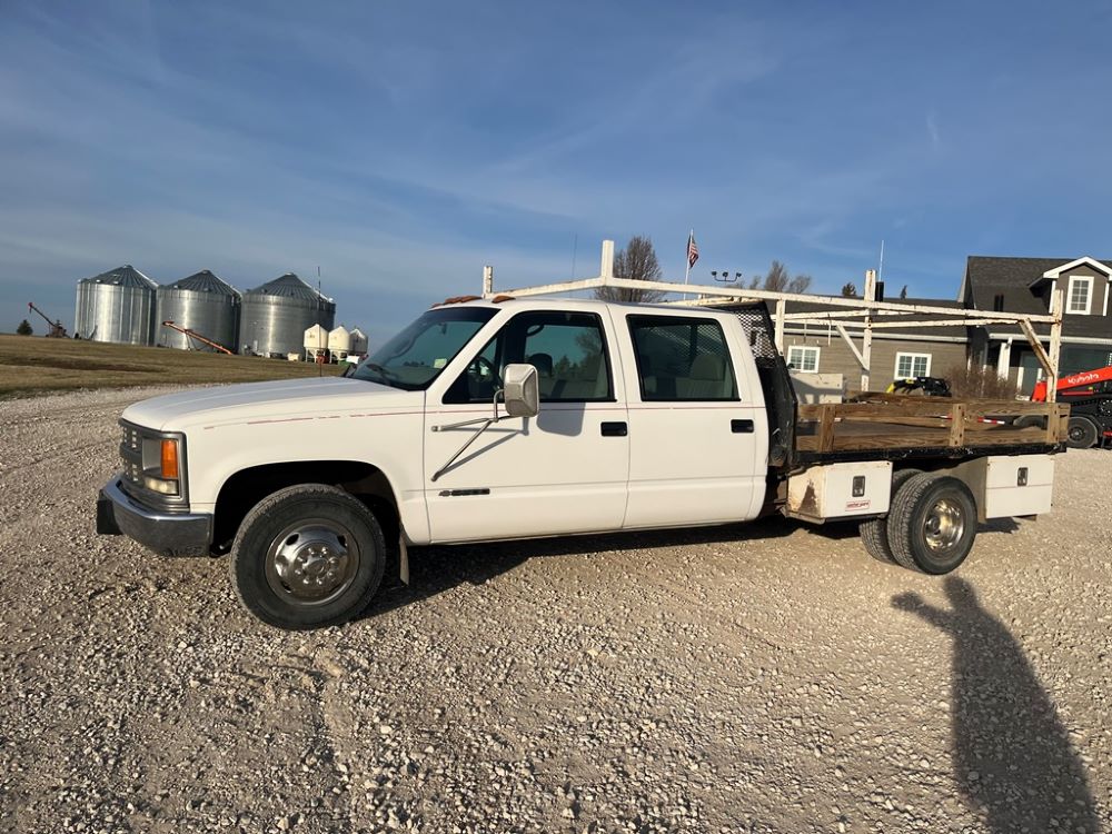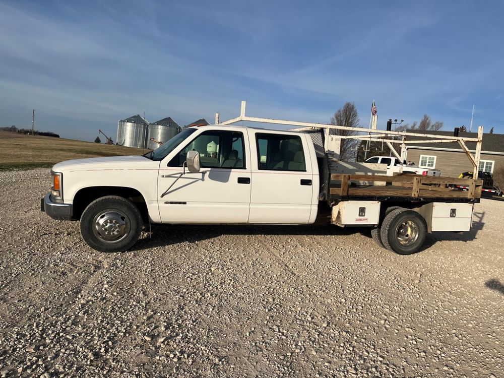 1999 Chevy 3500 Service Truck (DR8166), 7.4 liter gas engine, automatic transmission, 4 door cab, 10' steel flatbed, (6) Weather Guard steel storage boxes, top ladder rack, rear receiver hitch, heat/air conditioning, AM/FM CD radio, 225/75R16 tires, odometer is not accurate.