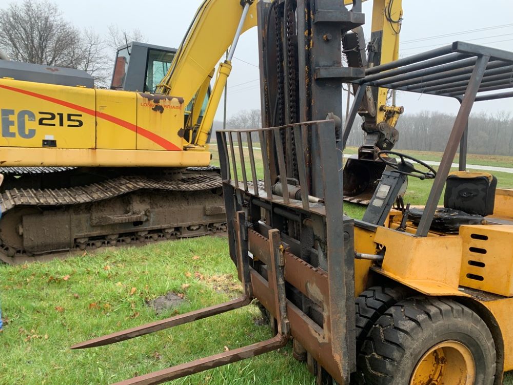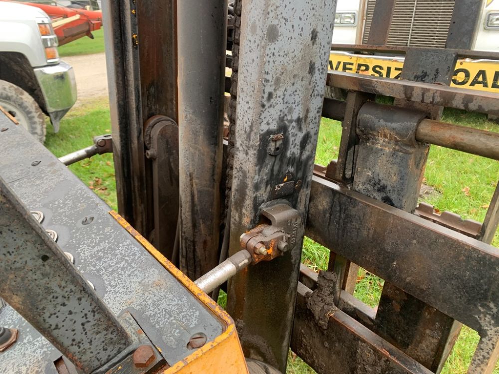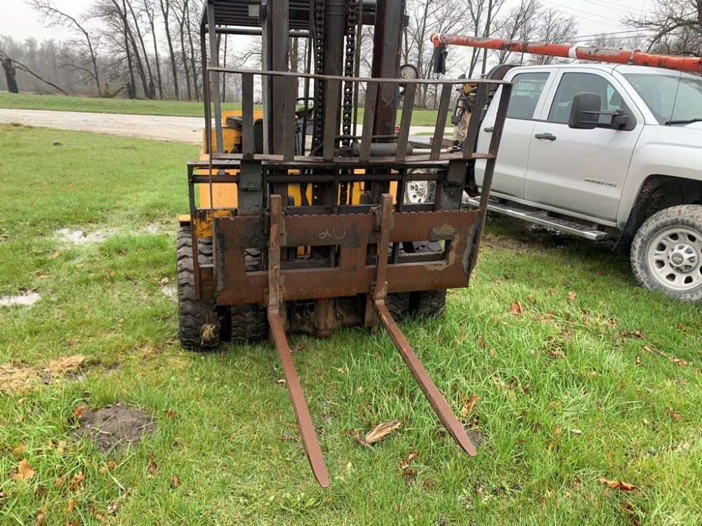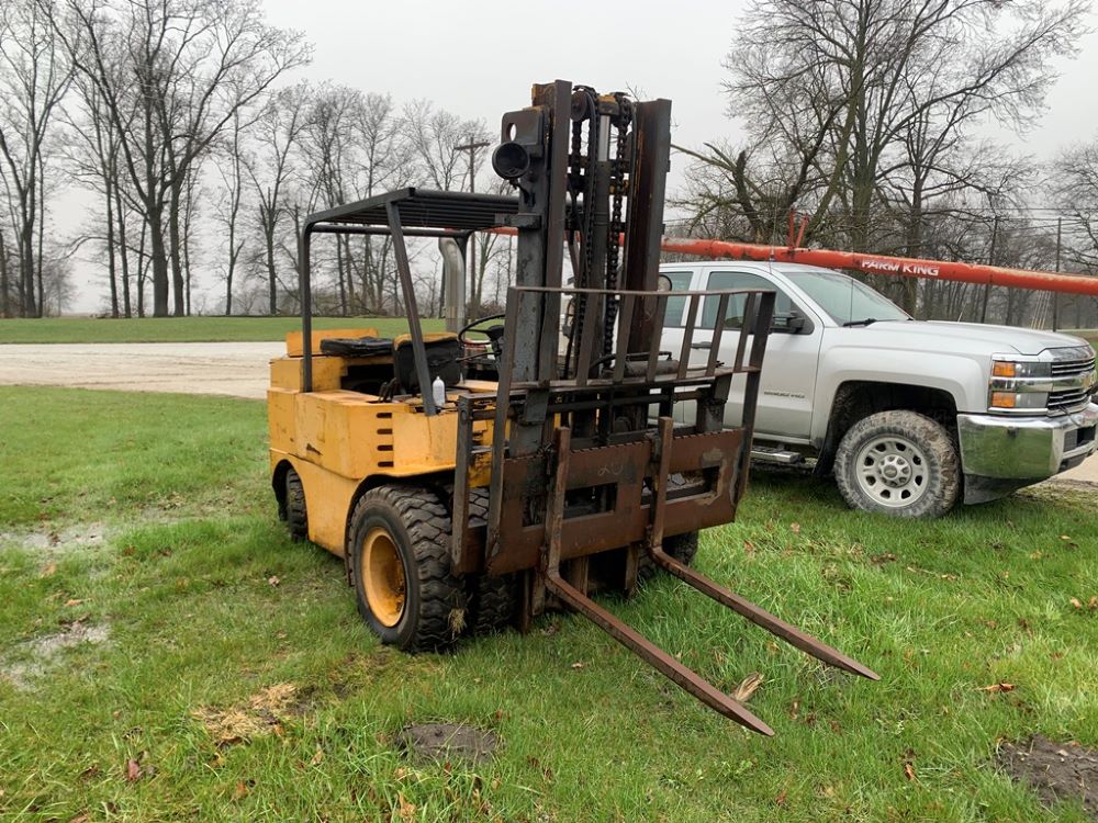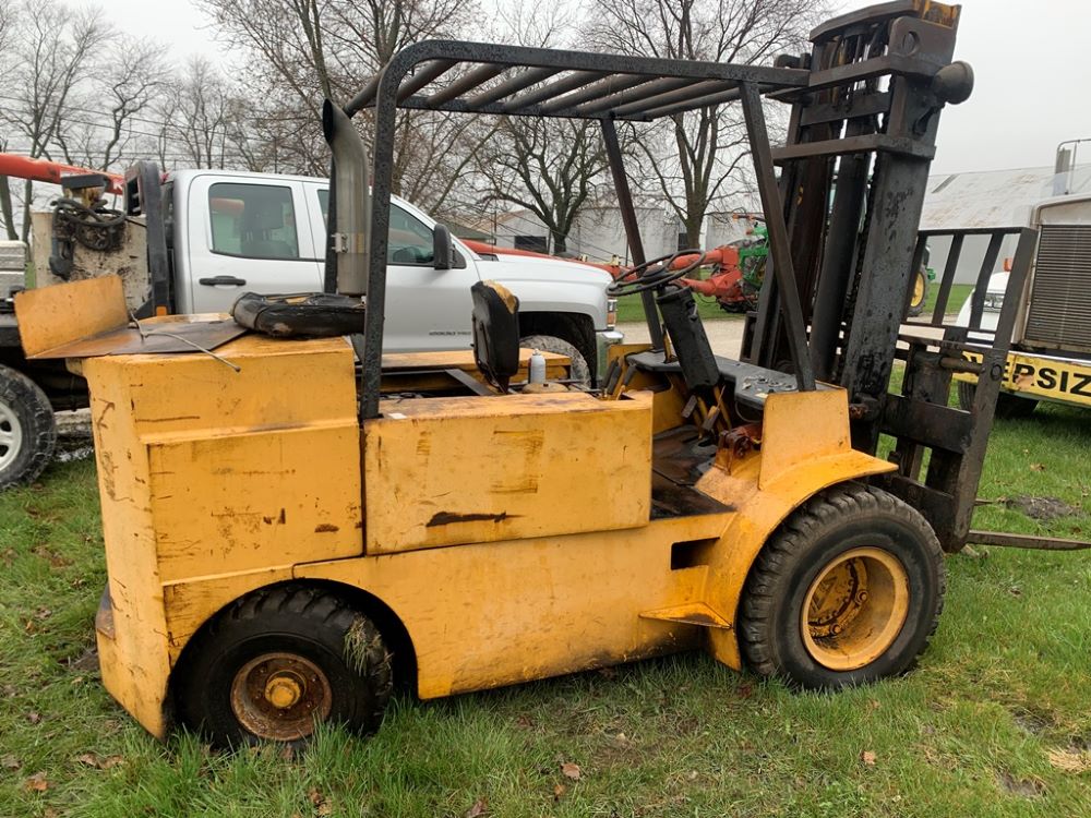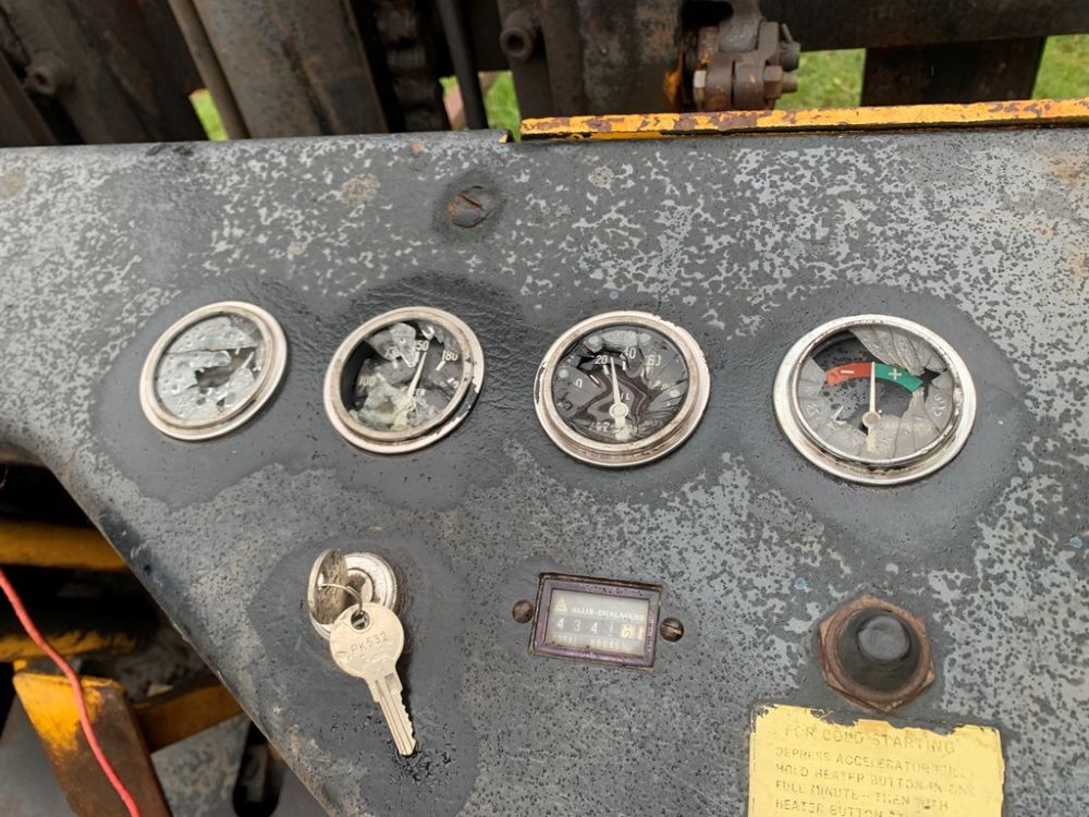 Allis Chalmers Forklift (CP3509), 13,000 pound forklift, 10,000 pound mast capacity, 3 stage mast, fuel pump needs work, starts right off with ether.