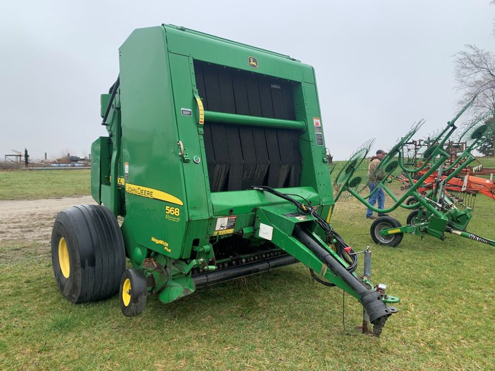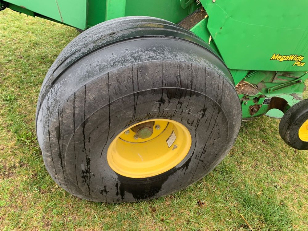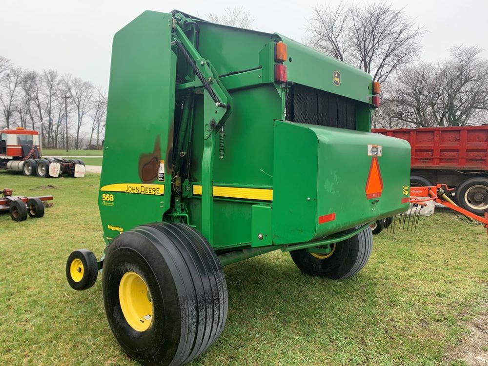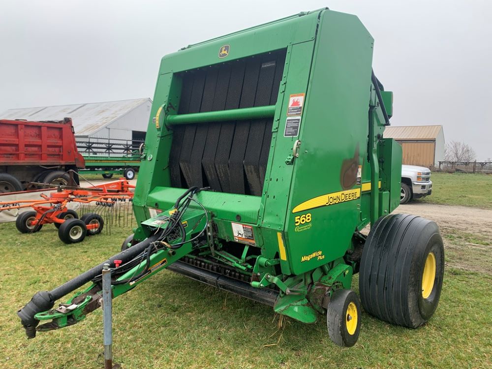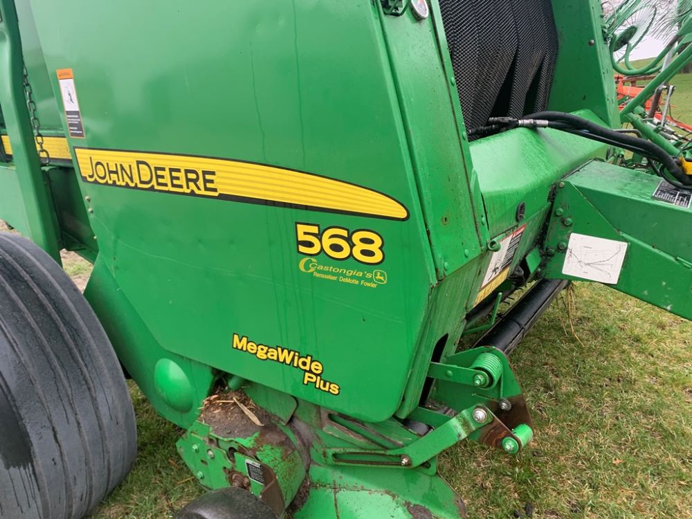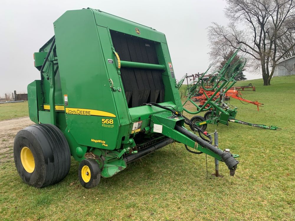 John Deere 568 Hay Baler (CP3493), mega wide plus, twine and new wrap, flotation tires, hydraulic pickup, 10,285 bales.