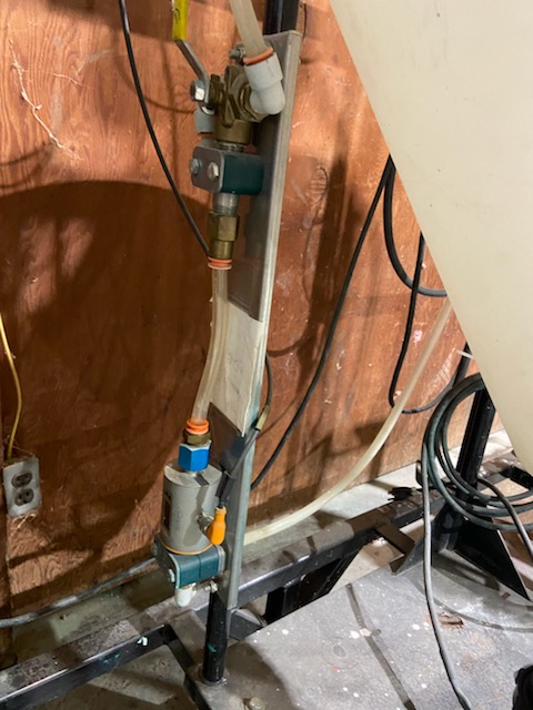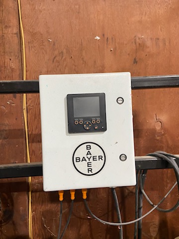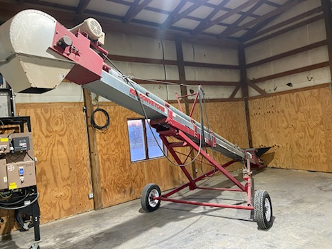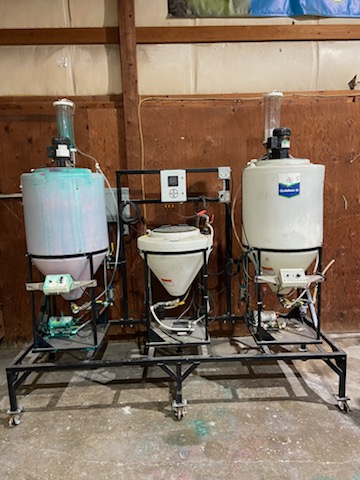 Bayer Gustafson RH-2000 Seed Treater (ES218), Bayer RH2000 seed treater, 48" drum, (3) product tanks with flow meters, 32 foot 1208 KSI conveyor, 25 foot 1208 KSI conveyor.