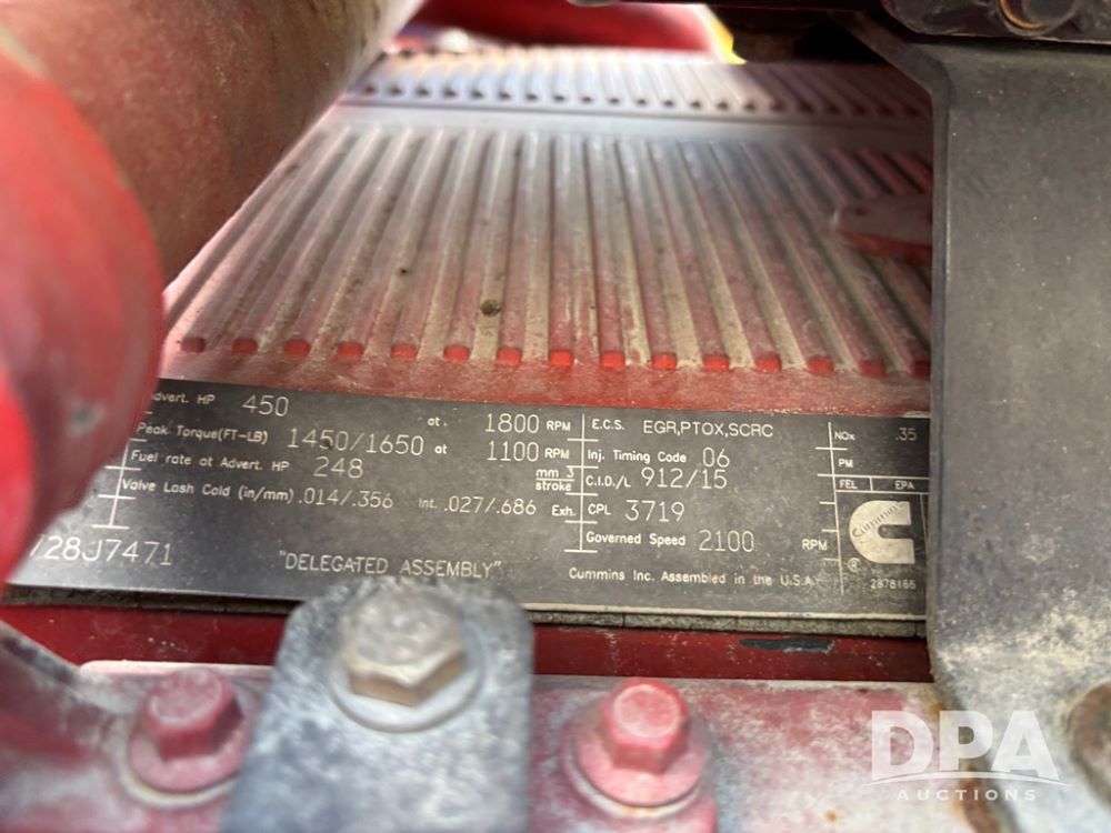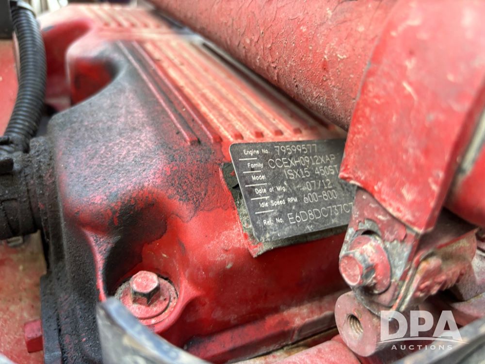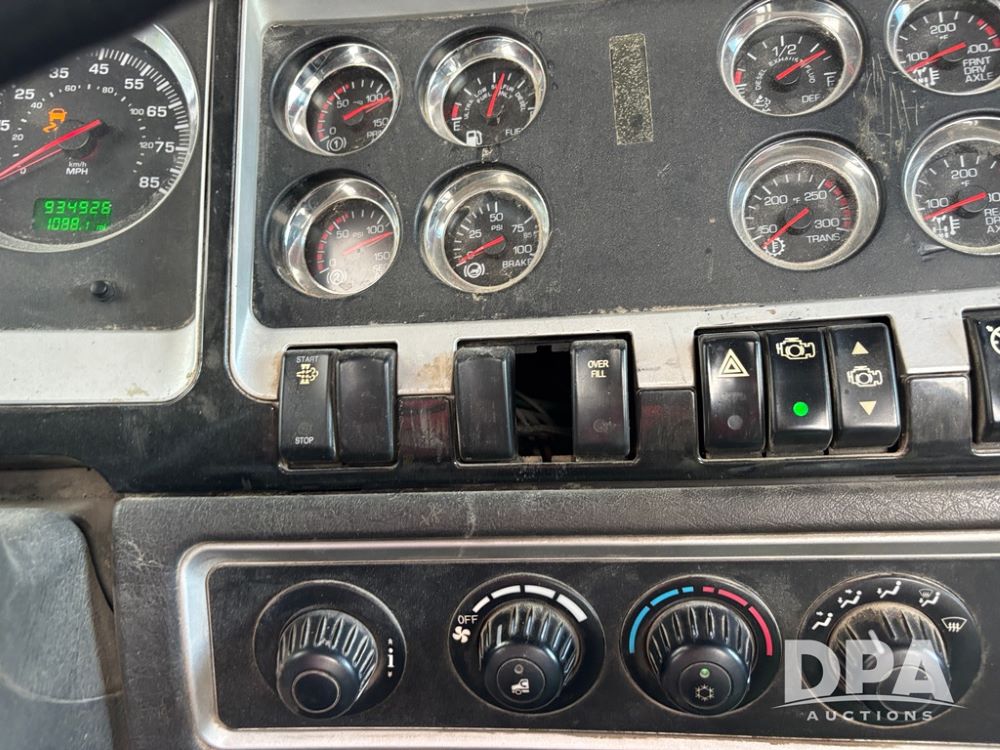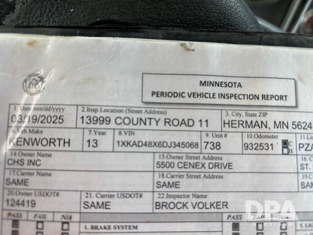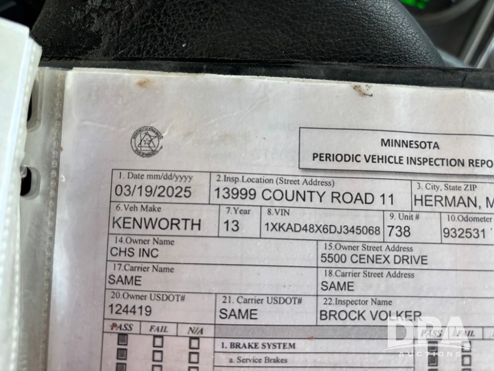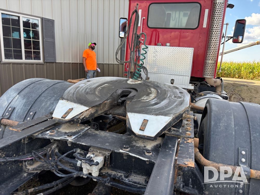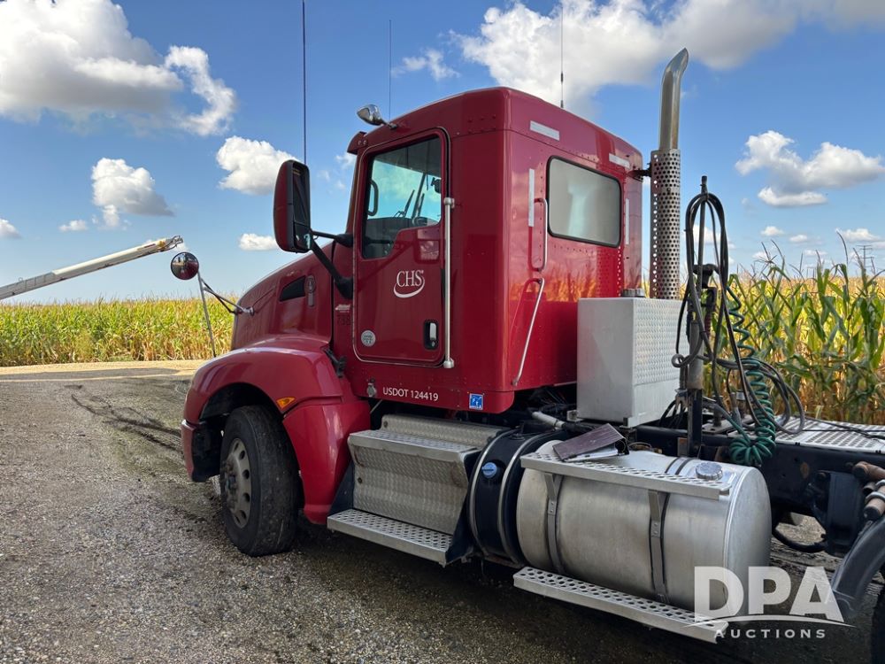 2013 Kenworth Truck (DR12246), Cumins ISX diesel engine, 10 speed transmission, tandem axle full screw, air ride suspension, 191'' WB, hydraulic wet kit, 5th wheel plate, engine brake, cruise control, heat/air conditioning, air dump, single hump Minimizer fenders, 22.5 tires, aluminum wheels, odometer reads 934,926 miles.