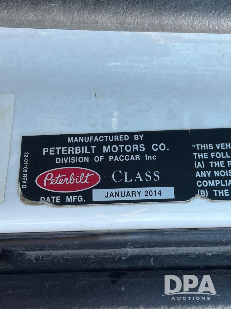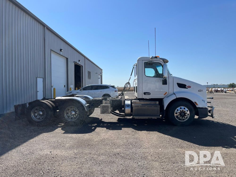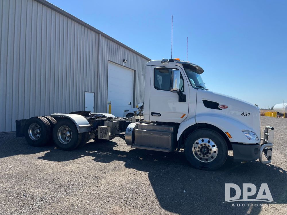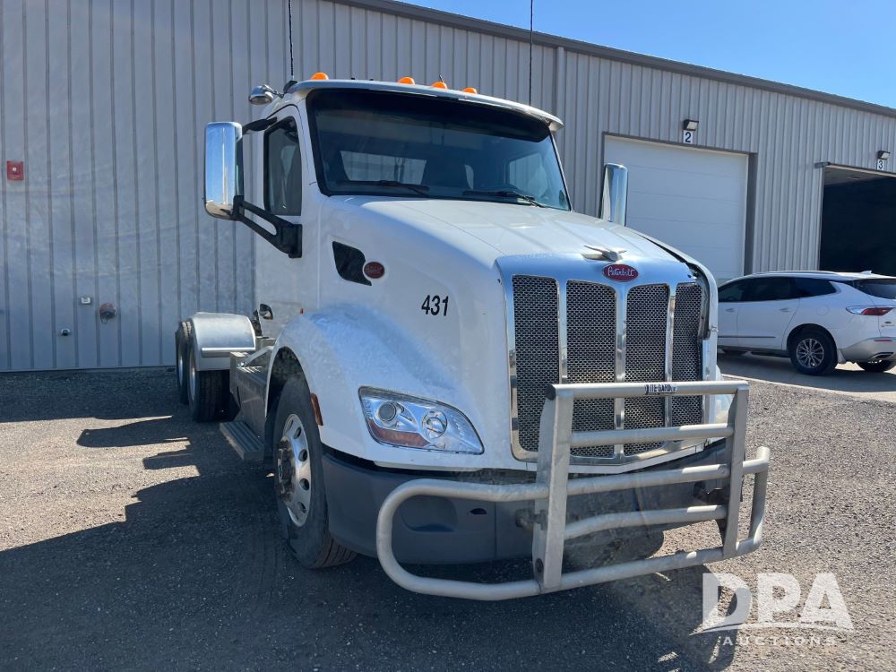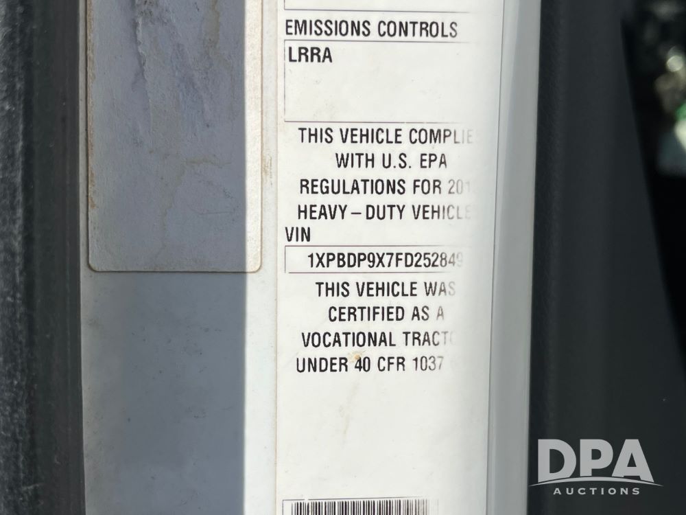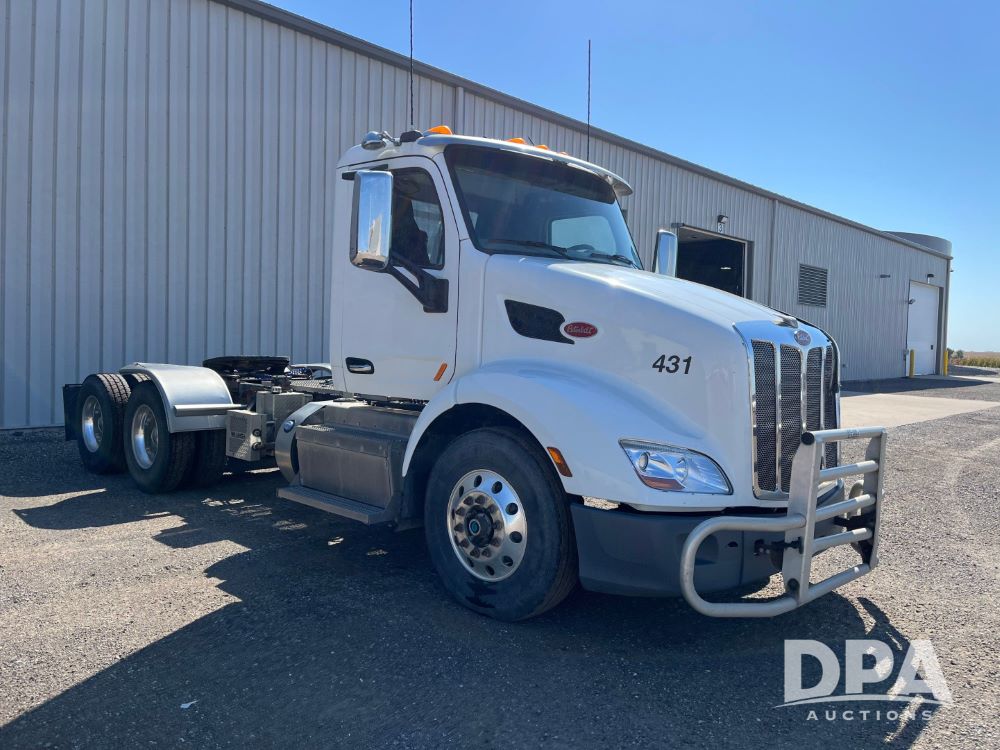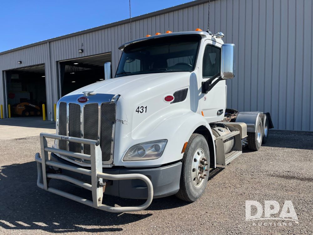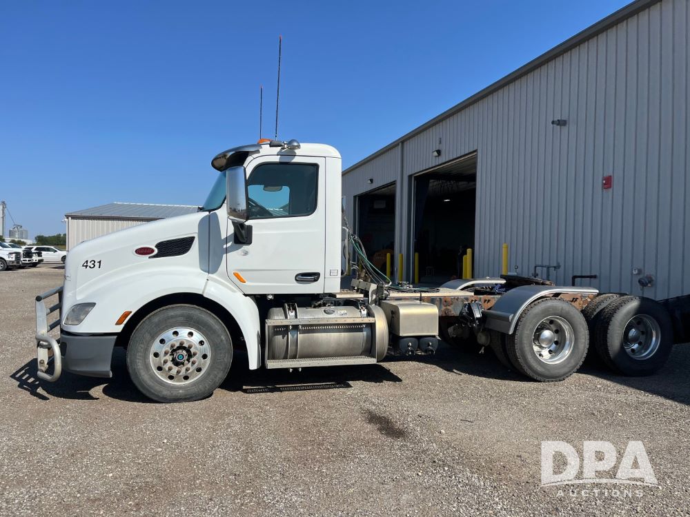 2015 Peterbilt Day Cab Truck (JN3114, Unit 431), Paccar MX-13 diesel engine, Eaton Fuller 13 speed transmission, air conditioning, heat, Am/Fm radio, cruise control, engine brake, power windows & locks, Lite-Gard grill guard, tandem axle, full screw, air ride suspension, 5th wheel, wet kit, 11R22.5 tires, aluminum rims, quarter fenders, shows 659,775 miles.