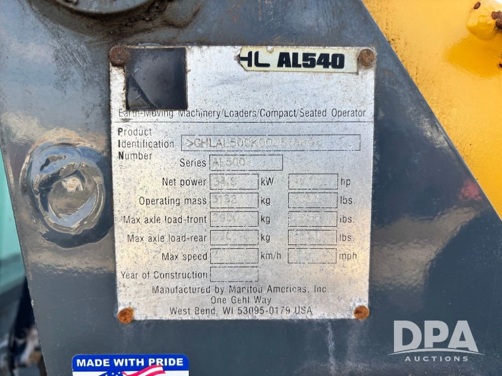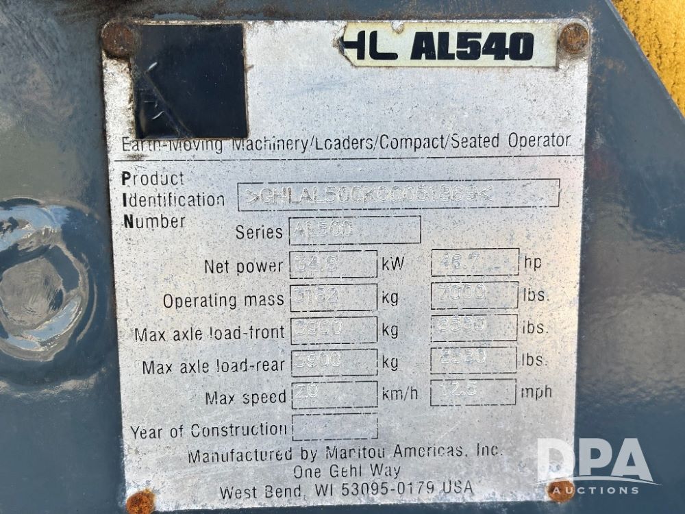 2013 Gehl 540 Wheel Loader (GP11584), 4WD, EROPS, 4 cylinder 47 HP diesel engine, 2 speed hydrostatic transmission (12.4 mph), heat, 2,560 pound lift capacity, 66" bucket (36 cu. ft.), 33x15.50-16.5 tires.