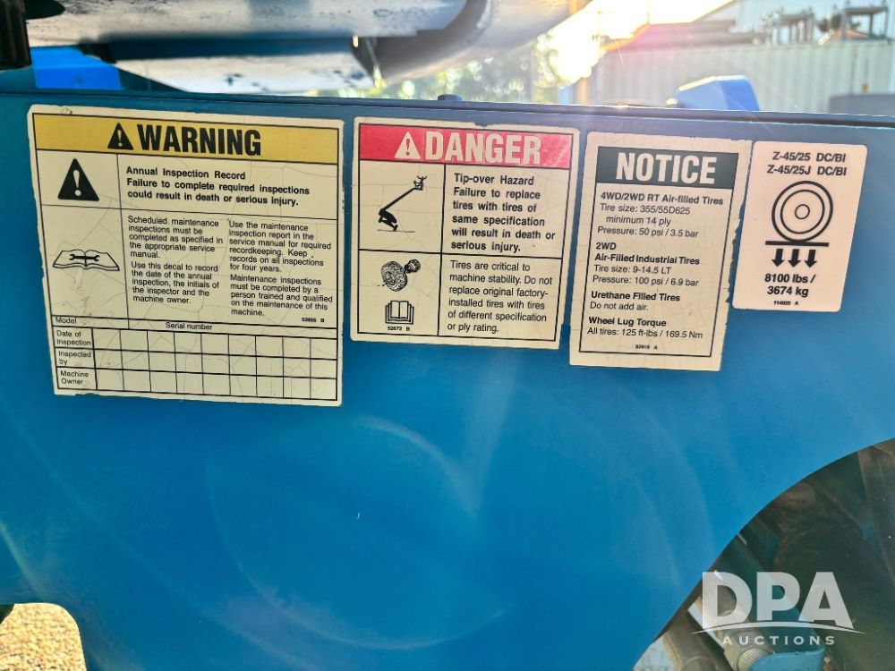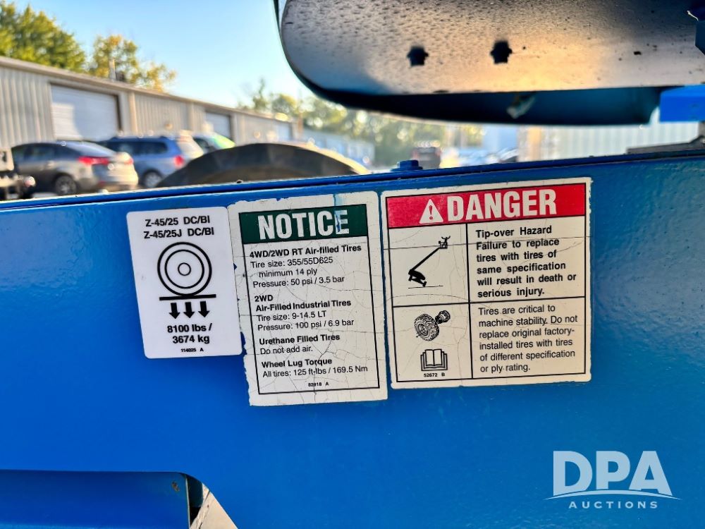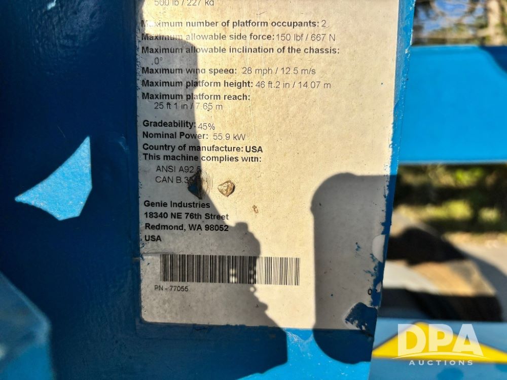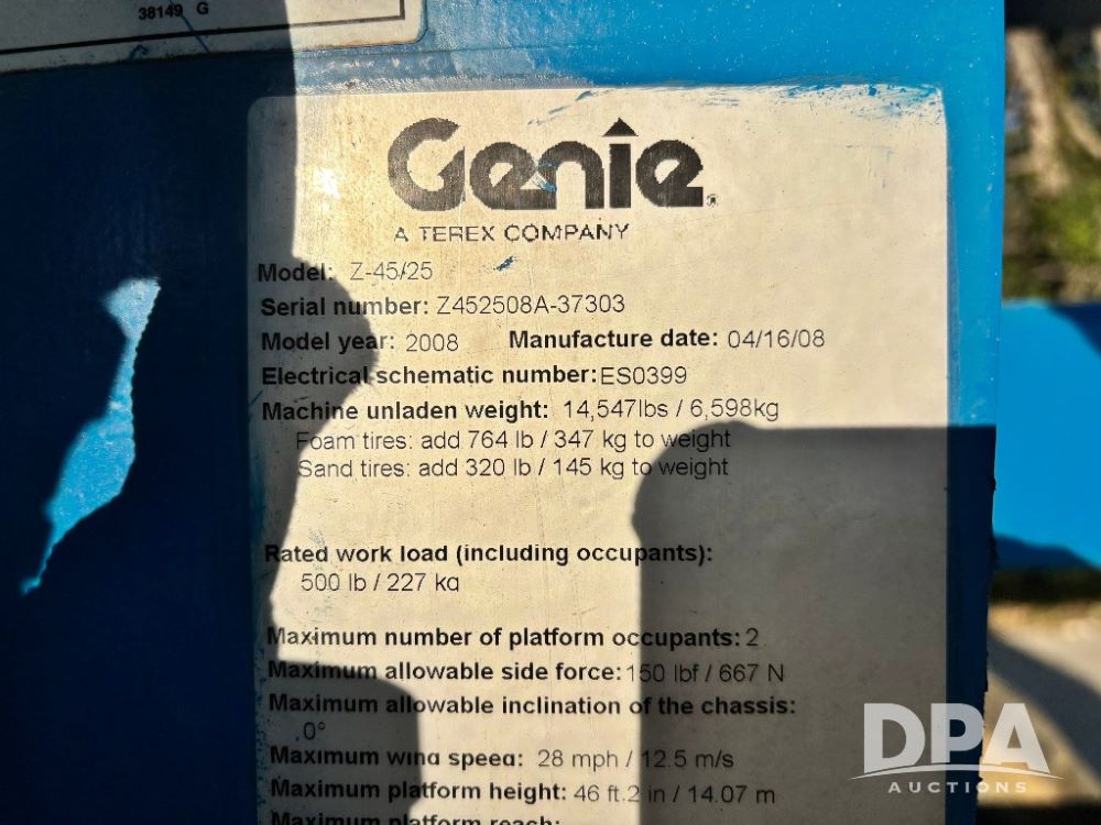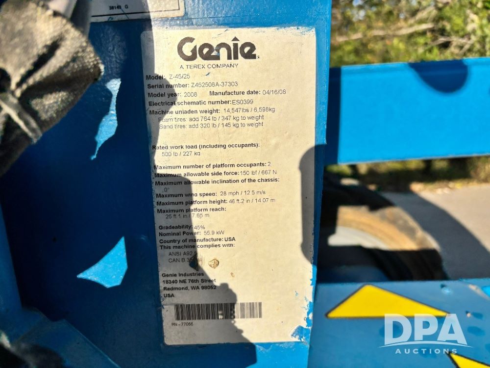2008 Genie Z45 Boom Lift (GP11566), 4x4, diesel engine, man basket, shows 3,574 hours.