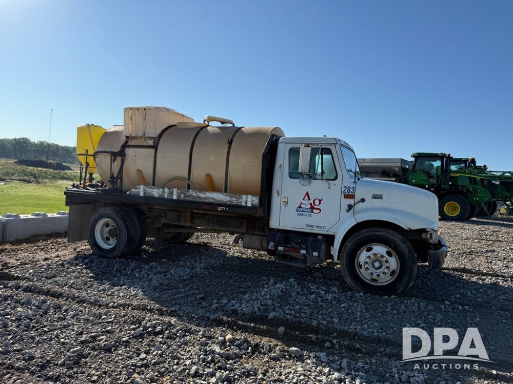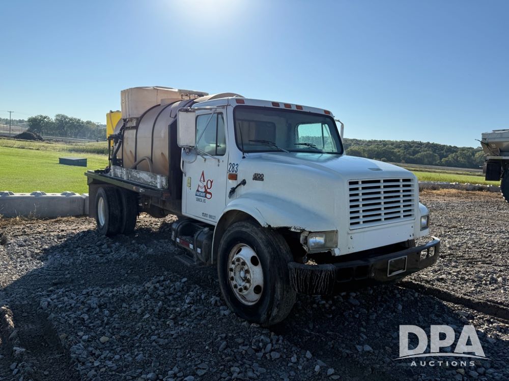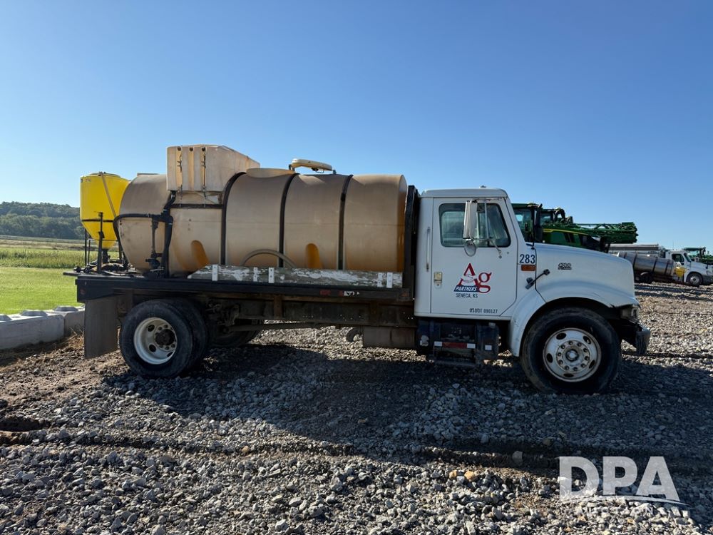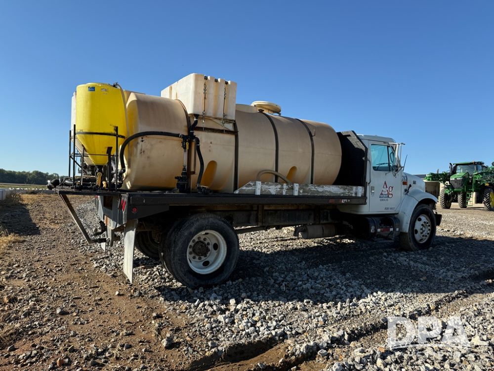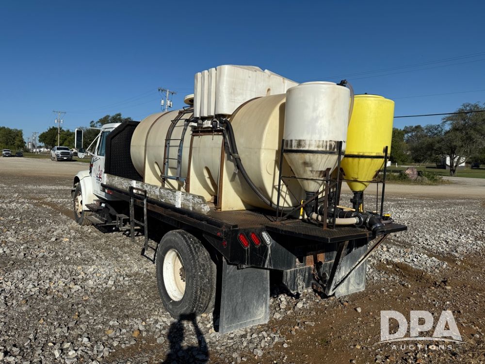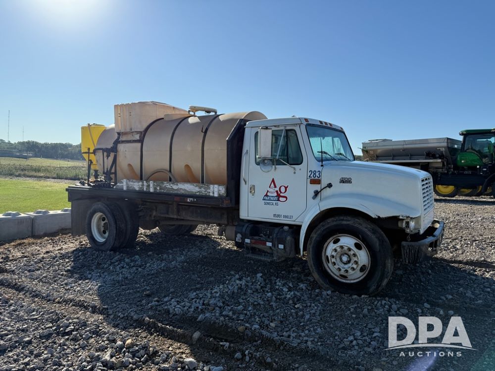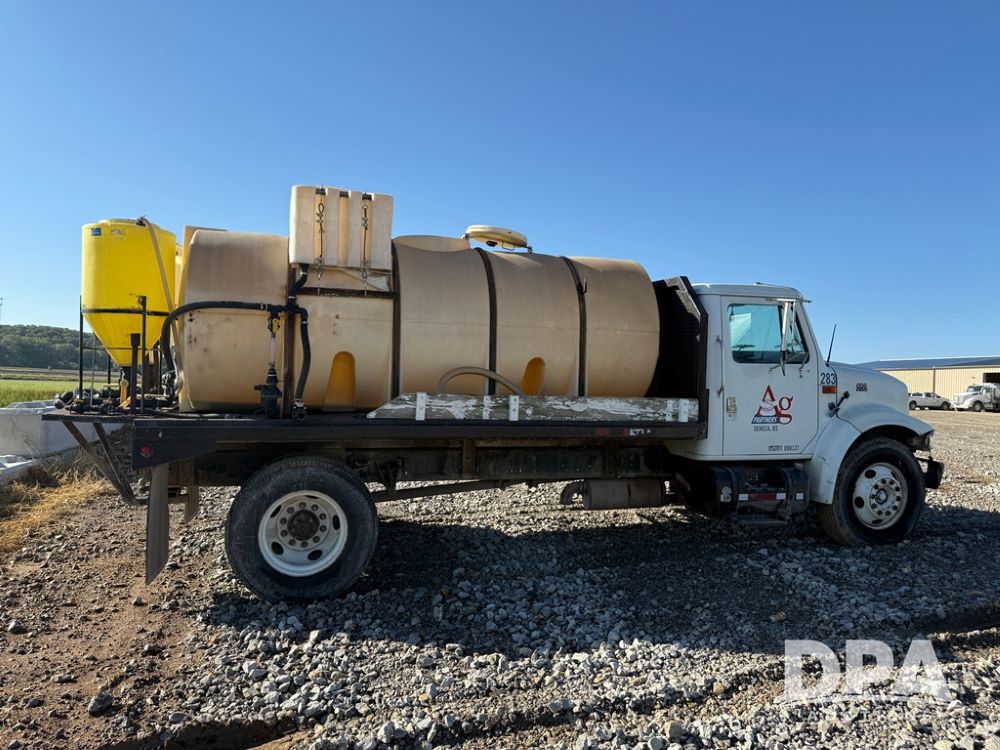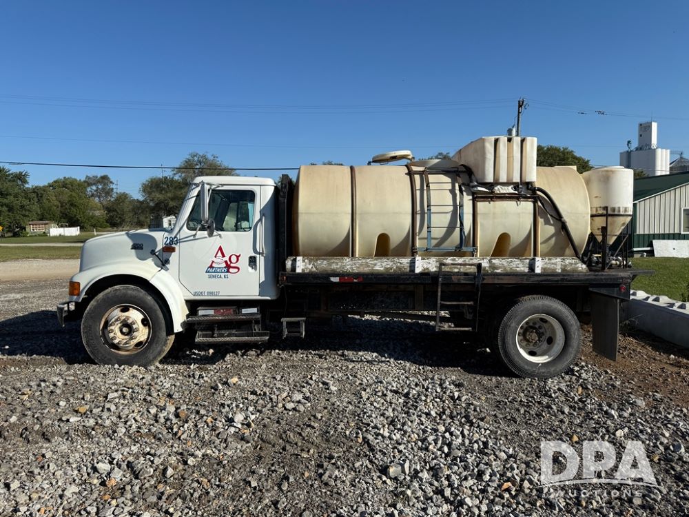 1999 International 4700 Liquid Nurse Truck (NP6161, Unit 283), IHC diesel engine, automatic transmission, heat, Am/Fm radio, single axle, spring suspension, rear flatbed, 1,600 gallon poly flat bottom liquid tank, top mount poly rinse tank, (2) cone bottom poly chemical inductor tanks w/ stands, 11R22.5 front tires, 295/75R22.5 rear tires, approx. 192" wheel base, shows 284,269 miles.