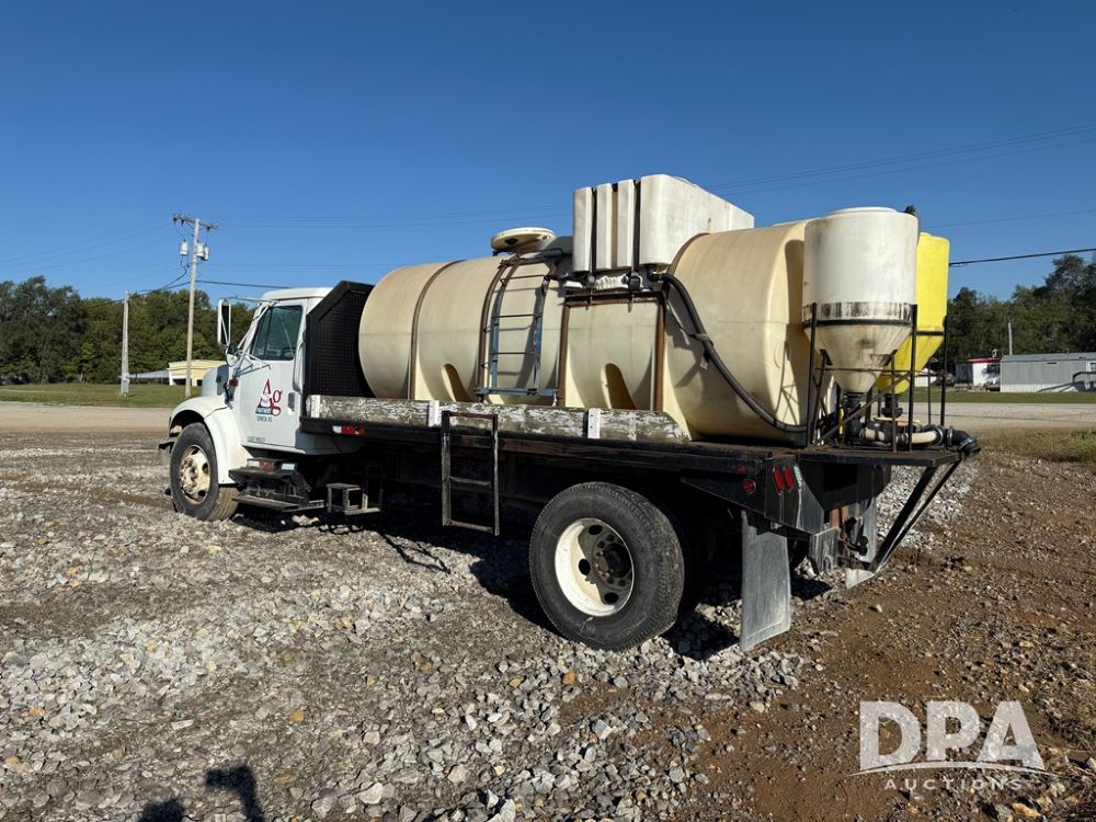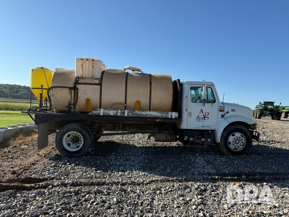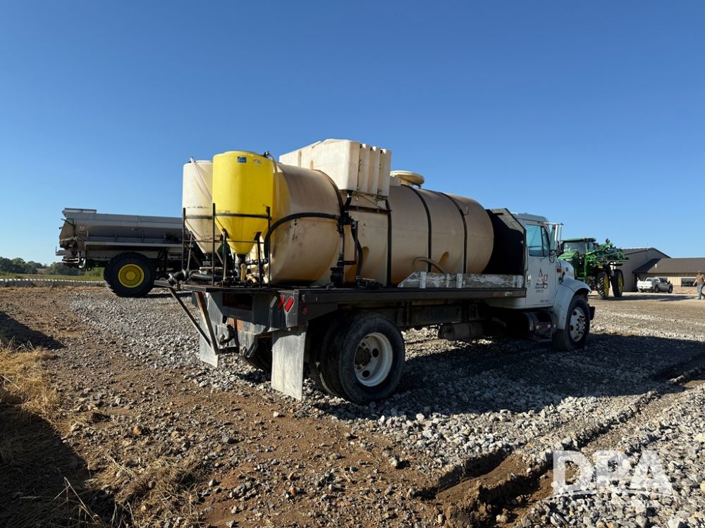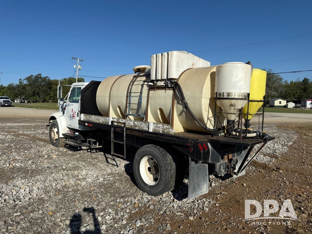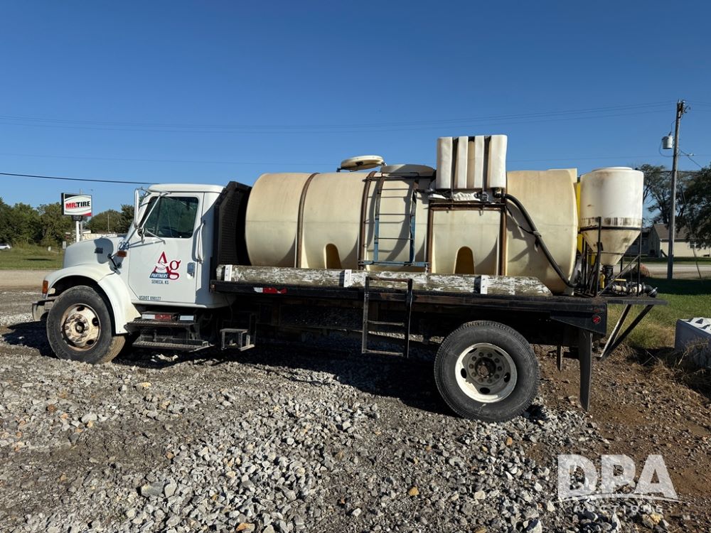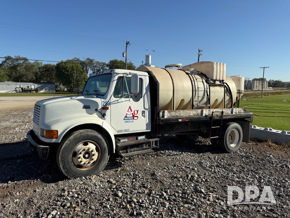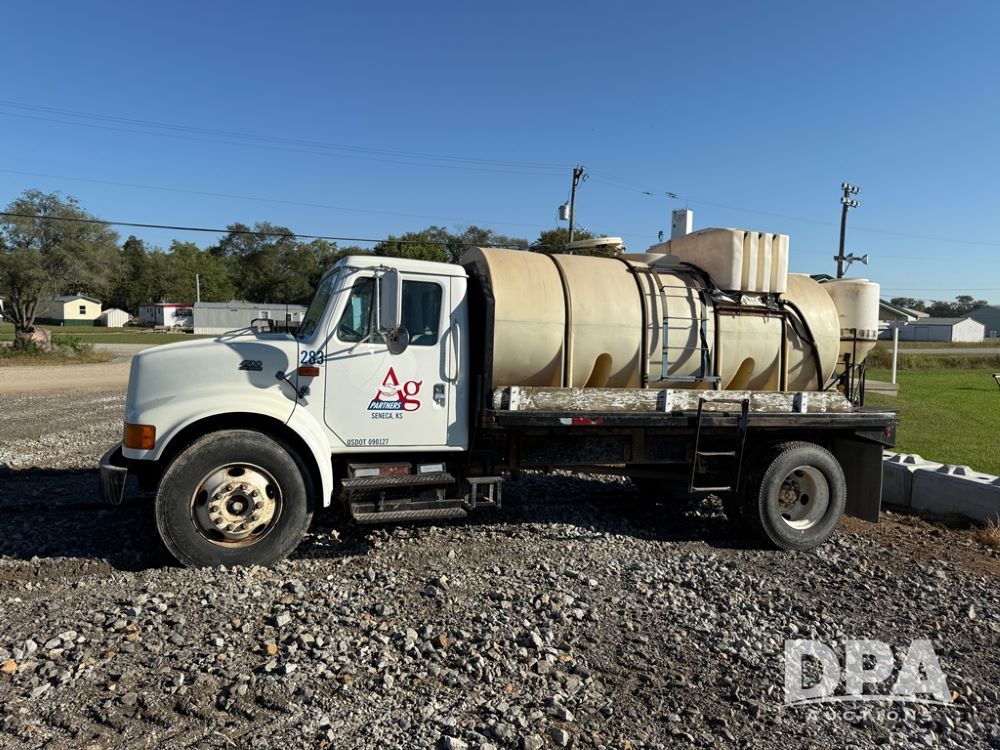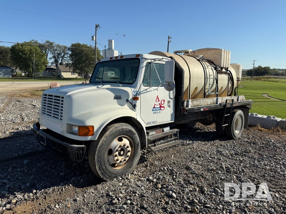 1999 International 4700 Liquid Nurse Truck (NP6161, Unit 283), IHC diesel engine, automatic transmission, heat, Am/Fm radio, single axle, spring suspension, rear flatbed, 1,600 gallon poly flat bottom liquid tank, top mount poly rinse tank, (2) cone bottom poly chemical inductor tanks w/ stands, 11R22.5 front tires, 295/75R22.5 rear tires, approx. 192" wheel base, shows 284,269 miles.