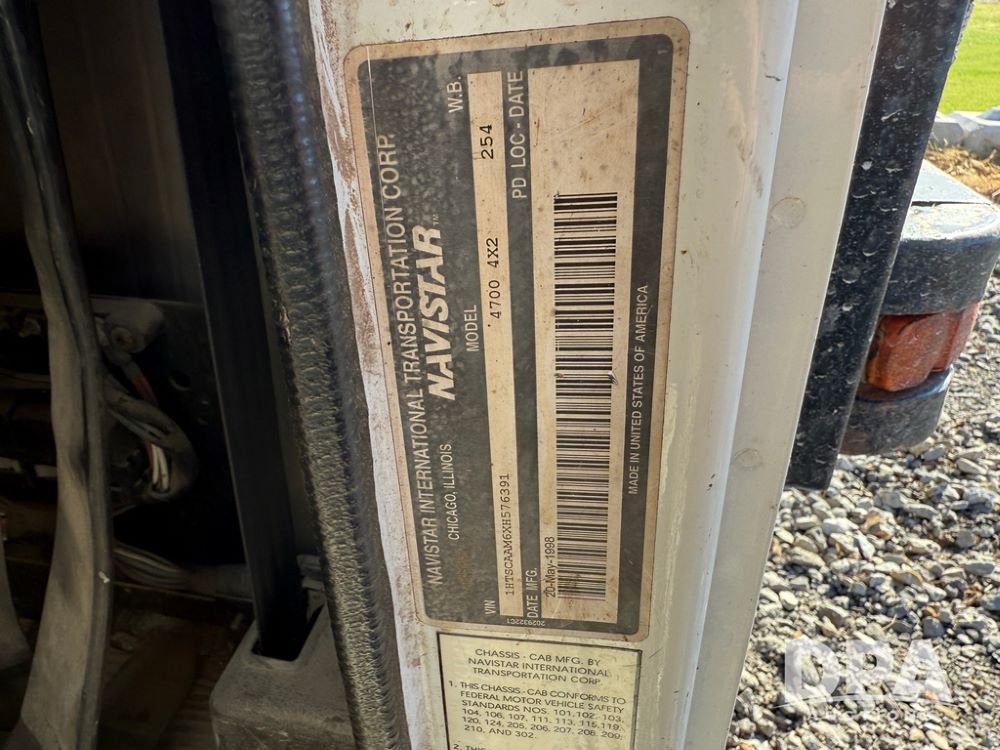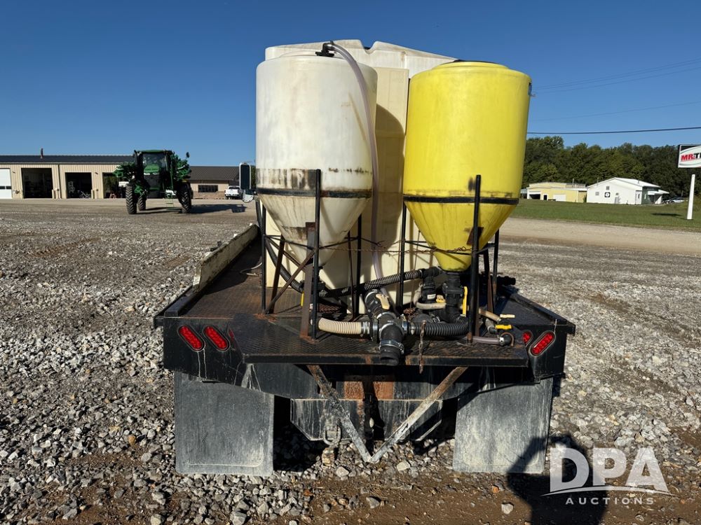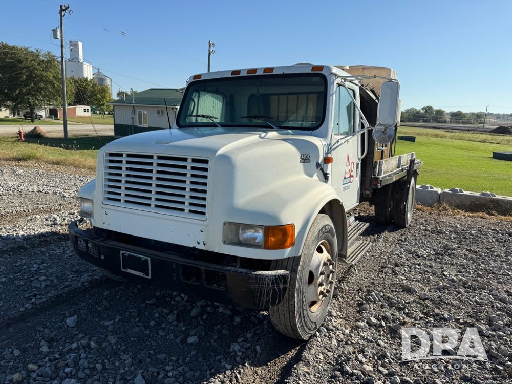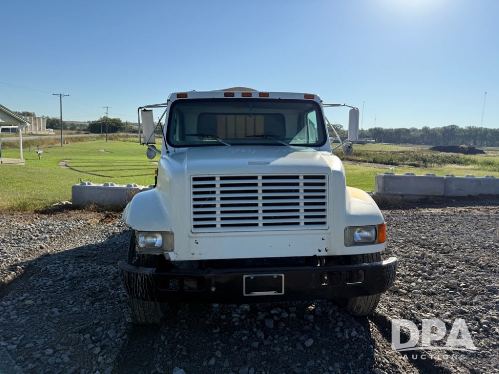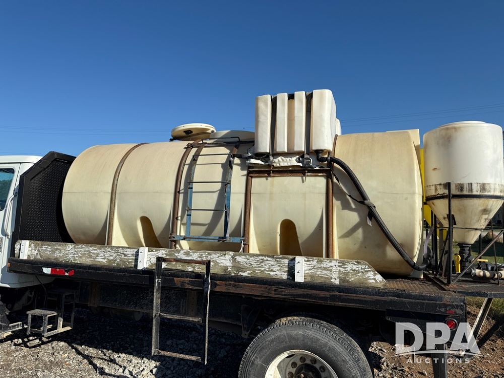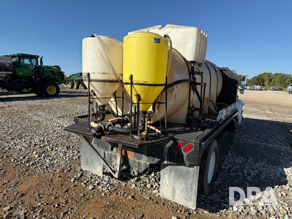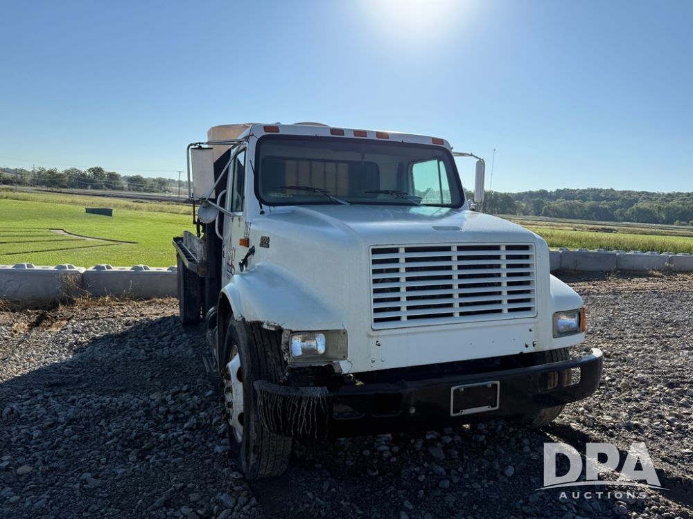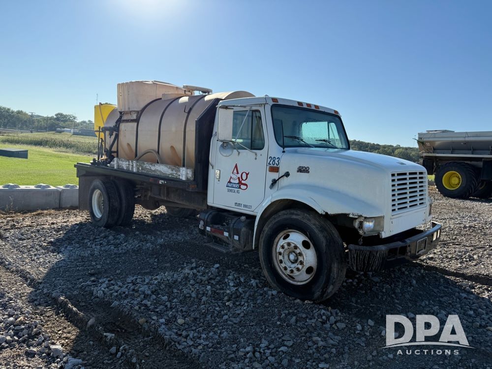 1999 International 4700 Liquid Nurse Truck (NP6161, Unit 283), IHC diesel engine, automatic transmission, heat, Am/Fm radio, single axle, spring suspension, rear flatbed, 1,600 gallon poly flat bottom liquid tank, top mount poly rinse tank, (2) cone bottom poly chemical inductor tanks w/ stands, 11R22.5 front tires, 295/75R22.5 rear tires, approx. 192" wheel base, shows 284,269 miles.