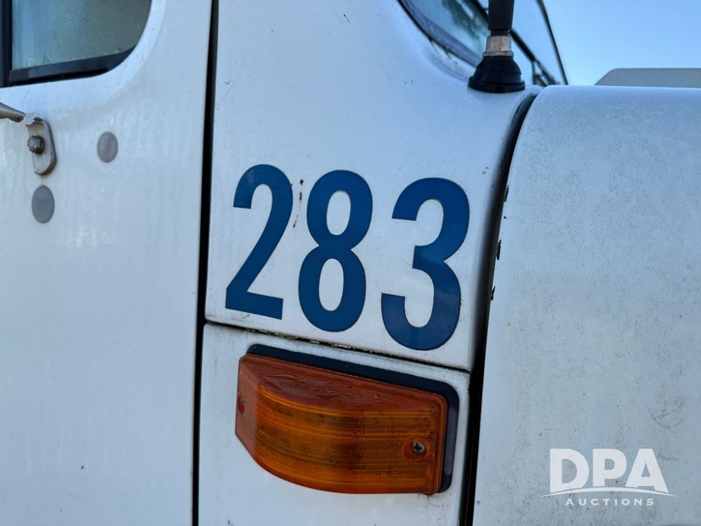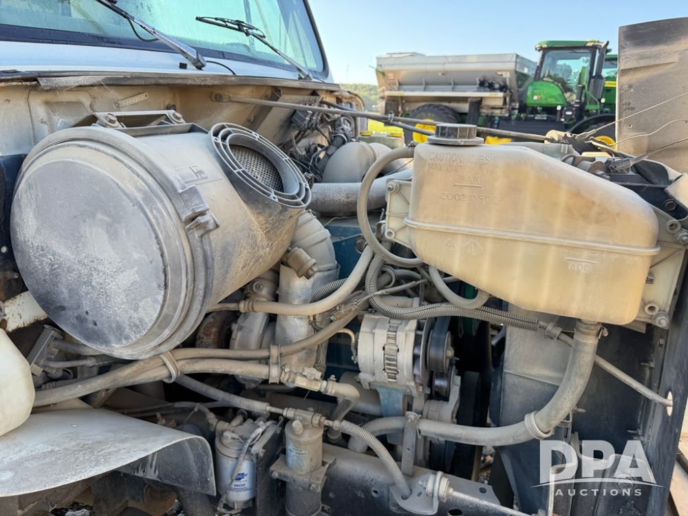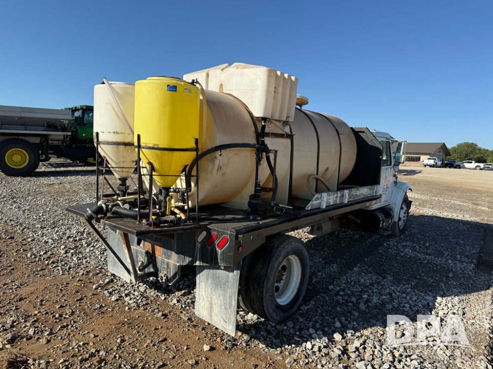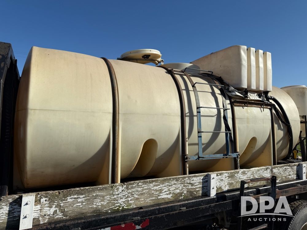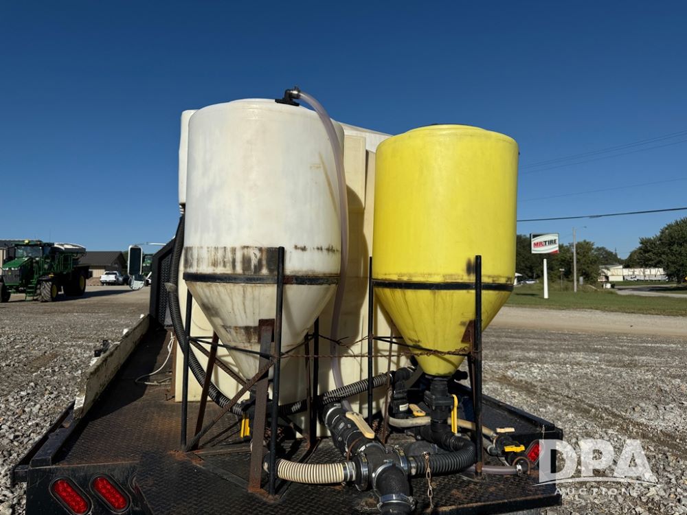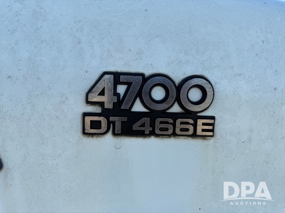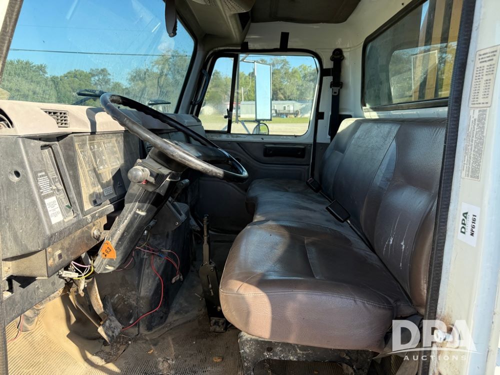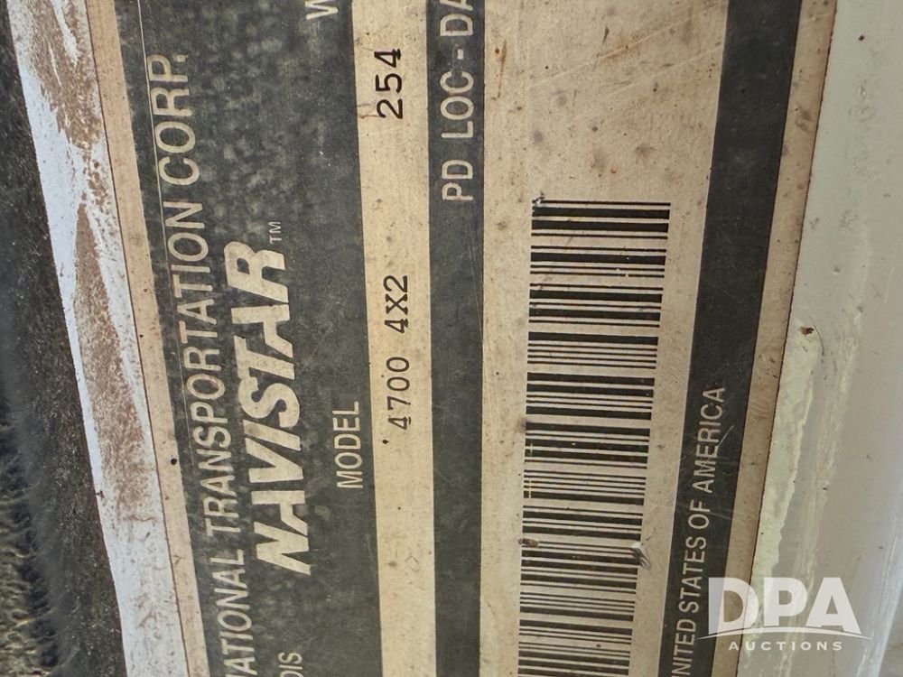 1999 International 4700 Liquid Nurse Truck (NP6161, Unit 283), IHC diesel engine, automatic transmission, heat, Am/Fm radio, single axle, spring suspension, rear flatbed, 1,600 gallon poly flat bottom liquid tank, top mount poly rinse tank, (2) cone bottom poly chemical inductor tanks w/ stands, 11R22.5 front tires, 295/75R22.5 rear tires, approx. 192" wheel base, shows 284,269 miles.